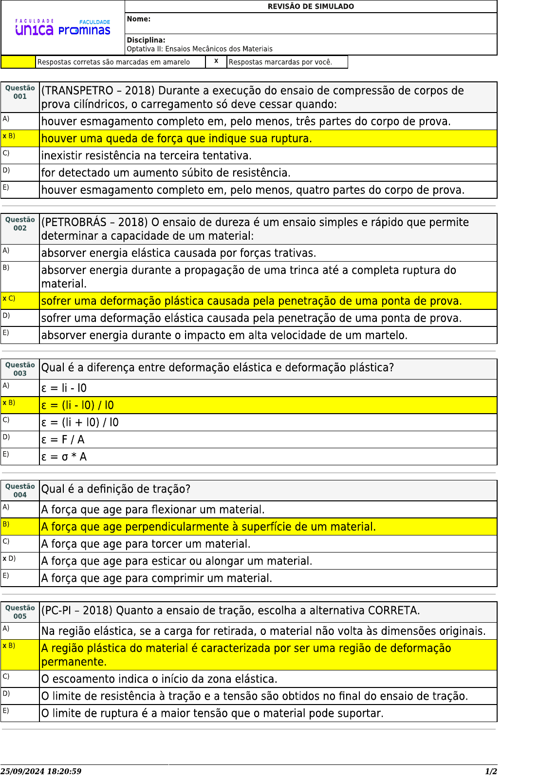<p>REVISÃO DE SIMULADO FACULDADE Nome: FACULDADE unica prominas Disciplina: Optativa II: Ensaios Mecânicos dos Materiais Respostas corretas são marcadas em amarelo X Respostas marcardas por você. Questão (TRANSPETRO 2018) Durante a execução do ensaio de compressão de corpos de 001 prova cilíndricos, o carregamento só deve cessar quando: A) houver esmagamento completo em, pelo menos, três partes do corpo de prova x B) houver uma queda de força que indique sua ruptura. C) inexistir resistência na terceira tentativa. D) for detectado um aumento súbito de resistência. E) houver esmagamento completo em, pelo menos, quatro partes do corpo de prova. Questão (PETROBRÁS 2018) ensaio de dureza é um ensaio simples e rápido que permite 002 determinar a capacidade de um material: A) absorver energia elástica causada por forças trativas. B) absorver energia durante a propagação de uma trinca até a completa ruptura do material. sofrer uma deformação plástica causada pela penetração de uma ponta de D) sofrer uma deformação elástica causada pela penetração de uma ponta de prova. E) absorver energia durante o impacto em alta velocidade de um martelo. Questão Qual é a diferença entre deformação elástica e deformação plástica? 003 A) x B) C) D) E = E) E = o * A Questão Qual é a definição de tração? 004 A) A força que age para flexionar um material. B) A força que age perpendicularmente à superfície de um material. C) A força que age para torcer um material. x D) A força que age para esticar ou alongar um material. E) A força que age para comprimir um material. Questão (PC-PI 2018) Quanto a ensaio de tração, escolha a alternativa CORRETA. 005 A) Na região elástica, se a carga for retirada, o material não volta às dimensões originais. x B) A região plástica do material é caracterizada por ser uma região de deformação permanente. C) escoamento indica o início da zona elástica. D) limite de resistência à tração e a tensão são obtidos no final do ensaio de tração. E) limite de ruptura é a maior tensão que o material pode suportar. 25/09/2024 18:20:59 1/2</p><p>Questão (PETROBRAS - 2018) No ensaio de tração simples, que propriedade mecânica é medida 006 pela área total do diagrama tensão-deformação? A) Dureza x B) Tenacidade C) Resiliência D) Plasticidade E) Elasticidade Questão que é deformação em um ensaio de tração? 007 A) o =F*A^2 B) o D) E) Questão O que é necessário para conduzir um ensaio de tração? 008 A) Um procedimento para determinar a resistência elétrica de um material. x B) Um procedimento para esticar um material até que ele se rompa. C) Um procedimento para medir a resistividade de um material. D) Um procedimento para avaliar a condutividade térmica de um material. E) Um procedimento para medir a densidade de um material. 25/09/2024 18:20:59 2/2</p>
