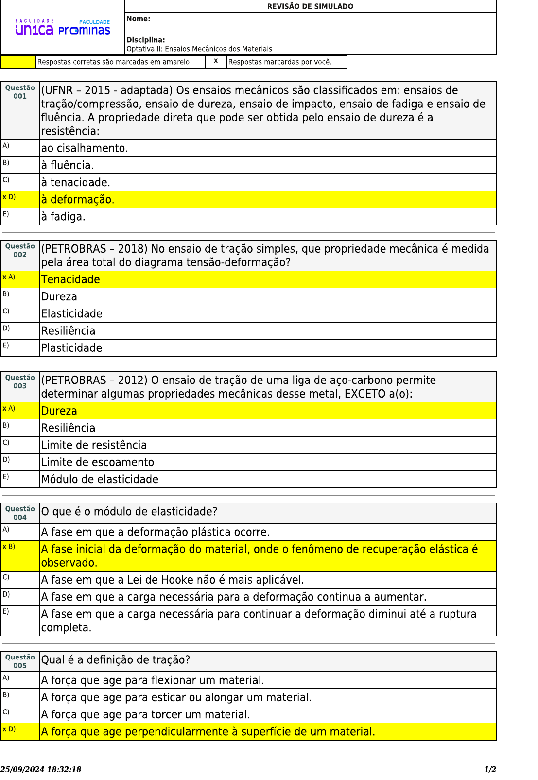 <p>REVISÃO DE SIMULADO FACULDADE Nome: FACULDADE unica prominas Disciplina: Optativa II: Ensaios Mecânicos dos Materiais Respostas corretas são marcadas em amarelo Respostas marcardas por você. Questão (UFNR 2015 adaptada) Os ensaios mecânicos são classificados em: ensaios de 001 tração/compressão, ensaio de dureza, ensaio de impacto, ensaio de fadiga e ensaio de fluência. A propriedade direta que pode ser obtida pelo ensaio de dureza é a resistência: A) ao cisalhamento. B) à fluência. C) à tenacidade. x D) à deformação. E) à fadiga. Questão (PETROBRAS - 2018) No ensaio de tração simples, que propriedade mecânica é medida 002 pela área total do diagrama tensão-deformação? x A) Tenacidade B) Dureza C) Elasticidade D) Resiliência E) Plasticidade Questão (PETROBRAS - 2012) O ensaio de tração de uma liga de aço-carbono permite 003 determinar algumas propriedades mecânicas desse metal, EXCETO a(o): x A) Dureza B) Resiliência C) Limite de resistência D) Limite de escoamento E) Módulo de elasticidade Questão O que é o módulo de elasticidade? 004 A) A fase em que a deformação plástica ocorre. x B) A fase inicial da deformação do material, onde o fenômeno de recuperação elástica é observado. C) A fase em que a Lei de Hooke não é mais aplicável. D) A fase em que a carga necessária para a deformação continua a aumentar. E) A fase em que a carga necessária para continuar a deformação diminui até a ruptura completa. Questão Qual é a definição de tração? 005 A) A força que age para flexionar um material. B) A força que age para esticar ou alongar um material. C) A força que age para torcer um material. x D) A força que age perpendicularmente à superfície de um material. 25/09/2024 18:32:18 1/2</p><p>E) A força que age para comprimir um material. Questão O que é a tensão em um ensaio de tração? 006 A) A área da seção transversal do material na direção da força. B) A inclinação da curva de tensão-deformação x C) A medida da resistência interna de um material à aplicação de uma força externa. D) A força aplicada ao material em unidades de newton (N). E) A deformação resultante no material. Questão Qual é a equação que define a tensão em um ensaio de tração? 007 x A) B) C) D) E) Questão (TRANSPETRO - 2018) Durante a execução do ensaio de compressão de corpos de 008 prova cilíndricos, o carregamento só deve cessar quando: x A) houver uma queda de força que indique sua ruptura. B) for detectado um aumento súbito de resistência. C) inexistir resistência na terceira tentativa. D) houver esmagamento completo em, pelo menos, quatro partes do corpo de prova. E) houver esmagamento completo em, pelo menos, três partes do corpo de prova. 25/09/2024 18:32:18 2/2</p>