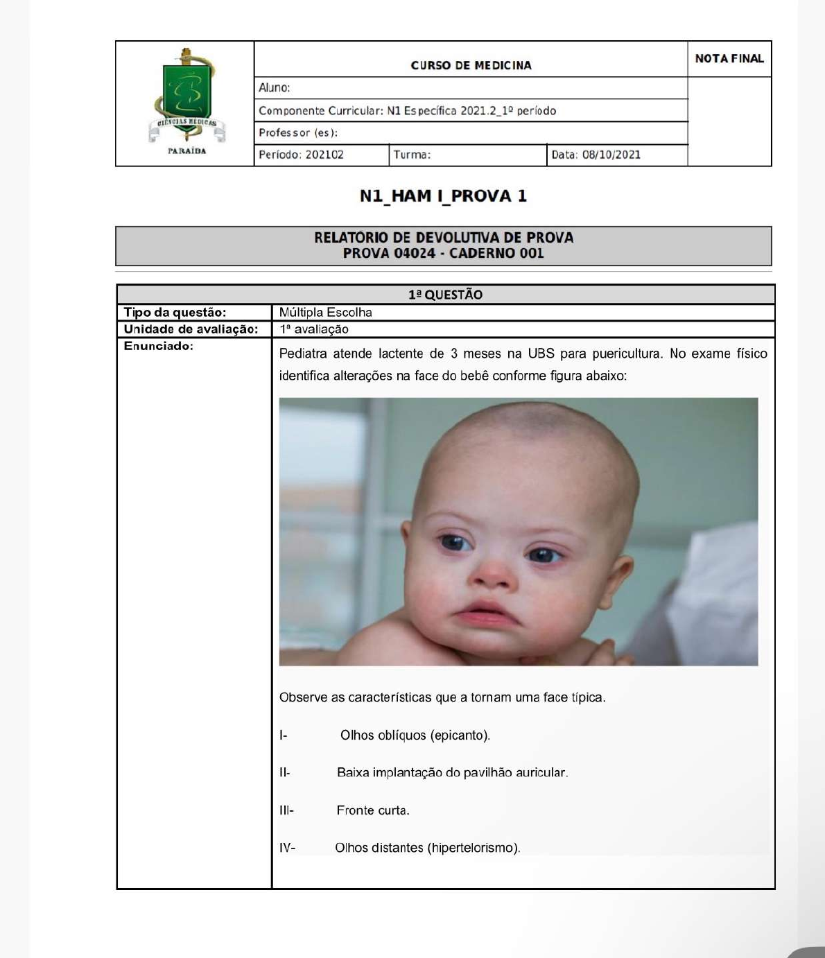 <p>NOTA FINAL CURSO DE MEDICINA Aluno: Componente Curricular: N1 Específica 2021.2_1° período MEDICAS Professor (es): Período: 202102 Turma: Data: 08/10/2021 N1_HAM PROVA 1 RELATÓRIO DE DEVOLUTIVA DE PROVA PROVA 04024 CADERNO 001 QUESTÃO Tipo da questão: Múltipla Escolha Unidade de avaliação: avaliação Enunciado: Pediatra atende lactente de 3 meses na UBS para puericultura. No exame físico identifica alterações na face do bebê conforme figura abaixo: Observe as características que a tornam uma face típica. I- Olhos oblíquos (epicanto). II- Baixa implantação do pavilhão auricular. III- Fronte curta. IV- Olhos distantes (hipertelorismo).</p><p>Alternativas: Alternativa A I II Alternativa B III Alternativa C I, II e III Alternativa D I, II e IV Grau de dificuldade: Fácil Resposta comentada: Fácies normal ou atípica: comporta muitas variações, facilmente reconhecidas por todos, mas é preciso ensinar o olho a ver, conforme disse William Osler. Mesmo quando não há traços anatômicos ou expressão fisionômica para caracterizar um dos tipos de fácies descrito a seguir, é importante identificar, no rosto do paciente, sinais indicativos de tristeza, ansiedade, medo, indiferença, apreensão (ver Capítulo 7, Exame Psíquico e Avaliação das Condições Emocionais). Fácies mongoloide: está na fenda palpebral seu elemento característico: é uma prega cutânea (epicanto) que torna os olhos oblíquos, bem distantes um do outro, lembrando o tipo de olhos dos chineses. Acessoriamente, nota-se um rosto redondo, boca quase sempre entreaberta e uma expressão fisionômica de pouca inteligência ou mesmo de completa idiotia. É observada no mongolismo ou trissomia do par 21 ou síndrome de Down, que é tradução de um defeito genético (Figura 10.32). Celeno, PORTO,, C. e PORTO, Arnaldo Lemos. Exame Clínico, edição. Disponível em: Minha Biblioteca, Grupo GEN, 2017. Feedback: Filtros da questão: [Áreas de HAM 1 Habilidades e Atitudes Médicas 1 QUESTÃO Tipo da questão: Múltipla Escolha Unidade de avaliação: avaliação Enunciado: Sr. José, de 65 anos, veio para consulta na unidade de saúde do seu bairro, pois está com muito medo de um infarto. Ele já perdeu muitos familiares com esse problema. Ele está sendo atendido por um aluno de medicina do 10° período, junto com o seu preceptor. Enquanto Sr. José relata sua história, dizendo que não quer tomar o medicamento de pressão que foi receitado em consulta anterior, o médico o interrompe, dizendo "o senhor não pode escolher o que toma, quem entende de prescrição é o médico". aluno de medicina fica então pensando se ele deve fazer o mesmo com seus pacientes quando se formar, dizendo que quem decide sempre é o médico. Considerando essa situação e os preceitos éticos que envolvem o atendimento do paciente, podemos dizer que o correto é:</p><p>Alternativas: (alternativa A) a escolha do tratamento deve sempre ser do médico, paciente não tem condições de opinar sobre medicamentos. (alternativa B) o médico deve interromper o paciente quando ele estiver interferindo e prolongando muito a consulta. (alternativa o aluno de medicina devia ter feito alguma intervenção em prol do médico, no momento da consulta. (alternativa D) o paciente pode participar do seu plano de tratamento, considerando experiências anteriores e melhor Grau de dificuldade: Fácil Resposta comentada: Resposta correta letra A. paciente pode participar do seu plano de tratamento, sempre com o objetivo de maior adesão e possibilidades econômicas. o respeito a vivências anteriores a um plano acordado é fundamental para a garantia de um tratamento prolongado, de uma doença crônica, como a Hipertensão Arterial. Não escutar o paciente, não estabelecer empatia e acolhimento são falhas importantes de comunicação das equipes de saúde e pacientes. o aluno, nesse momento, deve se pautar em conhecimentos éticos e discutir, com seu preceptor, de forma protegida, sobre suas dúvidas em ralação a conduta. 1- CÓDIGO DE ÉTICA MÉDICA Disponível em: 2- LEITE, A. J. M.; CAPRARA, COELHO FILHO, J. M. (Org.). Habilidades de comunicação com pacientes e famílias. São Paulo: Sarvier, 2007. Feedback: Filtros da questão: [Áreas de HAM 1 Habilidades e Atitudes Médicas 1 [Semanas] Semana 1 Semana 2 QUESTÃO Tipo da questão: Múltipla Escolha Unidade de avaliação: avaliação Enunciado: Durante o treinamento de estudantes de medicina para atividades de semiologia em um hospital, a Comissão de Infecção Hospitalar (CCIH) deu algumas orientações. A utilização de preparação alcoólica apropriada para as mãos sob a forma de gel, pode substituir a higienização com água e sabão, quando as mãos estiverem visivelmente sujas. 2- procedimento de higienização simples das mãos com água e sabão deve ter duração de 40-60 segundos. 3- A preparação alcoólica apropriada para as mãos deve ser utilizada como complemento para a higienização com água e sabão. 4- Depois da higienização das mãos com a preparação alcoólica, essas devem ser secas com o uso de papel toalha. Avalie as afirmativas acima e identifique a(s) que está(ão) correta(s). Corrija o(s) item(ns) que está(ão) incorreto(s), reescrevendo-o(s) e tornando-o(s) verdadeiro(s).</p><p>Alternativas: Grau de dificuldade: Fácil Resposta comentada: Afirmativa 2 está correta. Afirmativa 1 está incorreta: A utilização de preparação alcoólica apropriada para as mãos, sob as formas de gel e outras, NÃO SUBSTITUI a higienização com água e sabão, quando as mãos estiverem visivelmente sujas. Afirmativa 3 está incorreta: A preparação alcoólica apropriada para as mãos NÃO PRECISA ser utilizada como complemento APÓS a higienização COM água e sabão. Afirmativa 4 está incorreta: Depois da higienização das mãos com a preparação alcoólica, essas devem ser secas NATURALMENTE, NÃO SECAR COM A TOALHA DE PAPEL. MINISTÉRIO DA SAÚDE; AG
