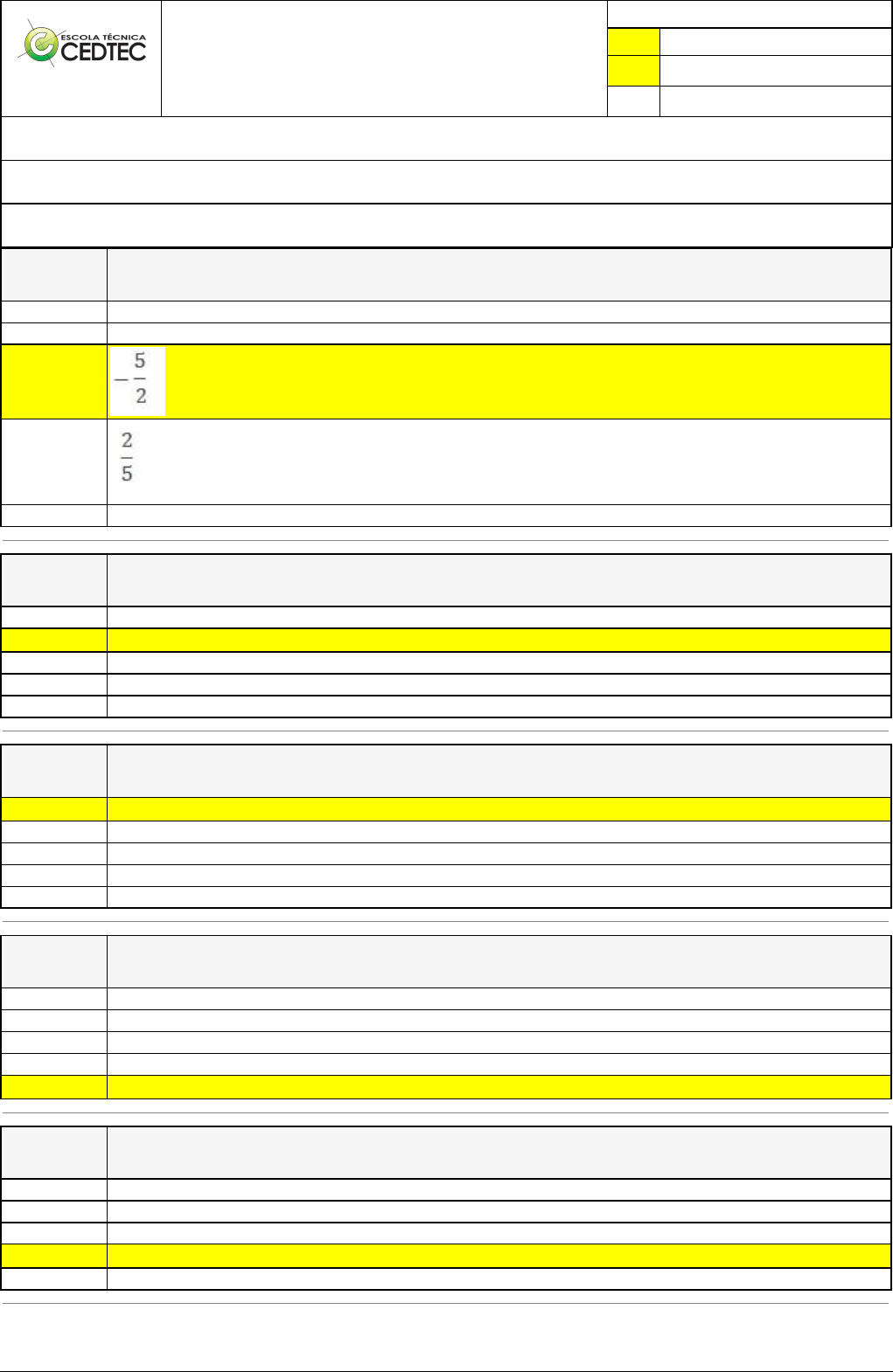 <p>Pincel Atômico - 28/09/2024 15:01:19 1/1</p><p>ALEXANDRE CORREIA</p><p>DA SILVA</p><p>Exercício Caminho do Conhecimento - Etapa 9 (38336)</p><p>Atividade finalizada em 22/09/2024 12:16:03 (2675424 / 1)</p><p>LEGENDA</p><p>Resposta correta na questão</p><p># Resposta correta - Questão Anulada</p><p>X Resposta selecionada pelo Aluno</p><p>Disciplina:</p><p>MATEMÁTICA [1113373] - Avaliação com 5 questões, com o peso total de 3,25 pontos [capítulos - 2]</p><p>Turma:</p><p>Curso Técnico: Mecânica - Grupo: EAD - 06/24 - EAD MEC [124185]</p><p>Aluno(a):</p><p>91617825 - ALEXANDRE CORREIA DA SILVA - Respondeu 5 questões corretas, obtendo um total de 3,25 pontos como nota</p><p>[350072_9217]</p><p>Questão</p><p>001</p><p>O(s) zero(s) da função y = 2x + 5 está indicado na alternativa:</p><p>0</p><p>2</p><p>X</p><p>-2</p><p>[350073_279228]</p><p>Questão</p><p>002</p><p>Sejam os conjuntos A = {1, 2, 3} e B = {3, 4, 5}. Qual conjunto representa a diferença simétrica entre A e B?</p><p>{1, 2, 3, 4, 5}</p><p>X {1, 2, 4, 5}</p><p>{7}</p><p>{3}</p><p>{1, 2}</p><p>[350072_9435]</p><p>Questão</p><p>003</p><p>Em um treino de basquete, um jogador ganha 5 pontos por cada cesta que acerta e perde 3 pontos por cada cesta que erra. Em 10</p><p>tentativas, um jogador obteve 26 pontos. Logo, o número de cestas que ele acertou foi:</p><p>X 7</p><p>6</p><p>3</p><p>5</p><p>4</p><p>[350073_9445]</p><p>Questão</p><p>004</p><p>Um menino tem 10 anos e seu pai 35 anos. Daqui a quantos anos a diferença das idades do pai e do filho será 3/8 da sua soma.</p><p>11 anos e 10 meses</p><p>11 anos e 11 meses</p><p>11 anos e 12 meses</p><p>10 anos e 12 meses</p><p>X 10 anos e 10 meses</p><p>[350073_279208]</p><p>Questão</p><p>005</p><p>Observe a equação: 3x + 4 = 5x − 8. O valor de x que satisfaz a equação é:</p><p>3</p><p>4</p><p>5</p><p>X 6</p><p>2</p>