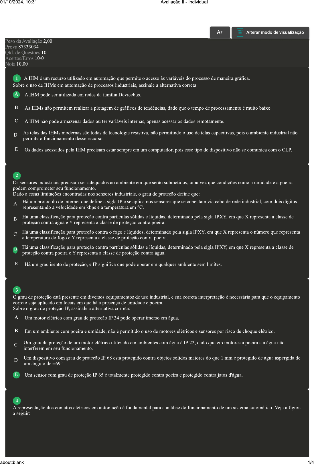<p>01/10/2024, 10:31 Avaliação Individual A+ Alterar modo de visualização Peso da Avaliação 2,00 Prova 87333034 Qtd. de Questões 10 Acertos/Erros 10/0 Nota 10,00 1 A IHM é um recurso utilizado em automação que permite acesso às variáveis do processo de maneira gráfica. Sobre uso de IHMs em automação de processos industriais, assinale a alternativa correta: A IHM pode ser utilizada em redes da família Devicebus. B As IHMs não permitem realizar a plotagem de gráficos de tendências, dado que tempo de processamento é muito baixo. C A IHM não pode armazenar dados ou ter variáveis internas, apenas acessar os dados remotamente. D As telas das IHMs modernas são todas de tecnologia resistiva, não permitindo uso de telas capacitivas, pois ambiente industrial não permite funcionamento desse recurso. E Os dados acessados pela IHM precisam estar sempre em um computador, pois esse tipo de dispositivo não se comunica com CLP. 2 Os sensores industriais precisam ser adequados ao ambiente em que serão submetidos, uma vez que condições como a umidade e a poeira podem comprometer seu funcionamento. Dado a essas limitações encontradas nos sensores industriais, grau de proteção define que: A Há um protocolo de internet que define a sigla IP e se aplica nos sensores que se conectam via cabo de rede industrial, com dois dígitos representando a velocidade em kbps e a temperatura em °C. B Há uma classificação para proteção contra partículas sólidas e líquidas, determinado pela sigla IPXY, em que X representa a classe de proteção contra água e Y representa a classe de proteção contra poeira. C Há uma classificação para proteção contra fogo e líquidos, determinado pela sigla IPXY, em que X representa número que representa a temperatura do fogo e Y representa a classe de proteção contra poeira. Há uma classificação para proteção contra partículas sólidas e líquidas, determinado pela sigla IPXY, em que X representa a classe de proteção contra poeira e Y representa a classe de proteção contra água. E Há um grau isento de proteção, e IP significa que pode operar em qualquer ambiente sem limites. 3 O grau de proteção está presente em diversos equipamentos de uso industrial, e sua correta interpretação é necessária para que equipamento correto seja aplicado em locais em que há a presença de umidade e poeira. Sobre grau de proteção IP, assinale a alternativa correta: A Um motor elétrico com grau de proteção IP 34 pode operar imerso em água. B Em um ambiente com poeira e umidade, não é permitido uso de motores elétricos e sensores por risco de choque elétrico. C Um grau de proteção de um motor elétrico utilizado em ambientes com água é IP 22, dado que em motores a poeira e a água não interferem em seu funcionamento. D Um dispositivo com grau de proteção IP 68 está protegido contra objetos sólidos maiores do que 1 mm e protegido de água aspergida de um ângulo de E Um sensor com grau de proteção IP 65 é totalmente protegido contra poeira e protegido contra jatos d'água. 4 A representação dos contatos elétricos em automação é fundamental para a análise do funcionamento de um sistema automático. Veja a figura a seguir: about:blank 1/4</p><p>01/10/2024, 10:31 Avaliação Individual INTERRUPTOR ABERTO INTERRUPTOR FECHADO (a) (b) Fonte: adaptado de: Automação Florianópolis: Arqué, 2023. Sobre a figura de dois estados de uma botoeira, assinale a alternativa correta: O contato (a) indica que em estado de repouso contato é normalmente aberto. e para mudar de estado é preciso que nível lógico igual a "1" seja aplicado. B O contato (a) indica que em estado de repouso contato é normalmente aberto, e para mudar de estado é preciso que nível lógico igual a "0" (zero) seja aplicado. C A botoeira é normalmente fechada, se representada pelo contato da letra (b), estado que para ser alterado requer nível lógico zero aplicado à variável que a representa. D Ao pressionar a botoeira em (b), ela passa de normalmente aberta para normalmente fechada. E O contato (b) representa um contato normalmente fechado que ao analisar a lógica de um processo é representado pelo nível lógico igual a 1. 5 As IHMs são dispositivos capazes de interfacear dados entre processo industrial e os usuários, que requer hierarquia de acesso para visualização, edição e controle de ações do processo. Sobre uso de IHMs em ambiente industrial, analise as afirmativas a seguir: I. Os dados do processo passam primeiro pela IHM e depois pelo CLP. II. As IHMs não podem se comunicar por meio de protocolos de rede industrial. pois é compatível apenas com protocolos de redes corporativas. III. O acesso aos parâmetros do processo depende de comunicação entre a IHM e CLP, em que os dados são mapeados na memória e disponibilizados para os demais dispositivos remotos. É correto que se afirma em: A I. II e III. B apenas. C I, D II e III. apenas. I e II. apenas. 6 A robótica industrial é um campo da engenharia que se dedica ao design, construção e aplicação de robôs em processos de fabricação. Esses robôs são programados para realizar tarefas repetitivas, perigosas ou complexas com alta precisão e consistência. Utilizados em diversas indústrias, os robôs industriais aumentam a produtividade, melhoram a qualidade dos produtos e reduzem os custos operacionais. Com avanço das tecnologias, como inteligência artificial e aprendizado de máquina, os robôs industriais estão se tornando mais versáteis e capazes de tomar decisões em tempo real. Fonte: adaptado de: JUNIOR, J. H. C. G. Robótica industrial: fundamentos, tecnologias, programação e simulação. São Paulo: Editora 2014. A utilização de um robô pode contribuir para aumento da produtividade em um processo de manufatura, entretanto, sua viabilidade depende de análise em vários aspectos. Sobre a utilização de robôs em processos de manufatura, assinale a al