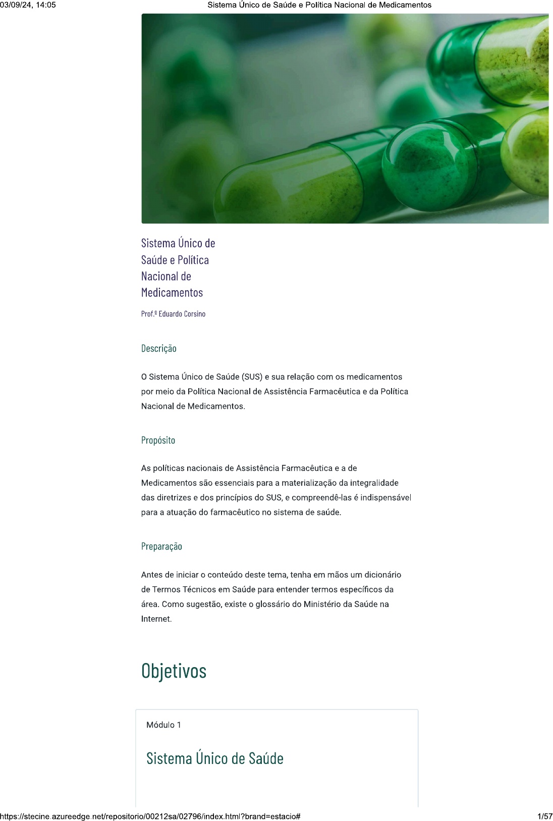 <p>03/09/24, 14:05 Sistema Único de Saúde e Política Nacional de Medicamentos Sistema Único de Saúde e Política Nacional de Medicamentos Eduardo Corsino Descrição o Sistema Único de Saúde (SUS) e sua relação com os medicamentos por meio da Política Nacional de Assistência Farmacêutica e da Política Nacional de Medicamentos. Propósito As políticas nacionais de Assistência Farmacêutica e a de Medicamentos são essenciais para a materialização da integralidade das diretrizes e dos princípios do SUS, e compreendê-las é indispensável para a atuação do farmacêutico no sistema de saúde. Preparação Antes de iniciar o conteúdo deste tema, tenha em mãos um dicionário de Termos Técnicos em Saúde para entender termos específicos da área. Como sugestão, existe o glossário do Ministério da Saúde na Internet. Objetivos Módulo 1 Sistema Único de Saúde 1/57</p><p>03/09/24, 14:05 Sistema Único de Saúde e Política Nacional de Medicamentos Reconhecer o Sistema Único de Saúde. Módulo 2 Diretrizes do Sistema Único de Saúde e a Assistência Farmacêutica Descrever as diretrizes do SUS e os Componentes da Assistência Farmacêutica. Módulo 3 Política Nacional de Medicamentos (PNM): definições e aplicações Descrever a Política Nacional de Medicamentos. Introdução o Sistema Único de Saúde (SUS) é um sistema de saúde pública complexo, abrangendo desde atendimentos simples como educação em saúde até cirurgias e tratamentos avançados como transplantes de órgãos. Esses serviços são oferecidos para toda a população do País de forma gratuita. Neste conteúdo, abordaremos as principais diretrizes do SUS e a abrangência dos serviços oferecidos pelo sistema de saúde brasileiro. 2/57</p><p>03/09/24, 14:05 Sistema Único de Saúde e Política Nacional de Medicamentos SUS Nacional de Saúde 1 Sistema Único de Saúde Ao final deste módulo, você será capaz de reconhecer 0 Sistema Único de Saúde. o Sistema Único de Saúde (SUS) é um grande sistema de saúde gratuito, atendendo a toda a população brasileira e oferecendo todos os tipos de serviços para suprir as necessidades de saúde dos cidadãos. A criação do SUS proporcionou mudanças em relação às ações de saúde pública oferecidas pelo Estado brasileiro, de forma que todos os indivíduos no território brasileiro podem acessar o sistema e receber seus serviços, aspecto que o caracteriza como sistema universal. Além disso, o sistema se caracteriza pela integralidade, ou seja, todas as necessidades de saúde da população devem ser atendidas pelo sistema. Essas e outras diretrizes, que dão norteamentos e organização ao SUS, serão abordadas ao longo deste conteúdo. Sistema Único De Saúde (SUS) SUS Sistema Único de Saúde A Constituição Federal vigente foi promulgada em 1988. Nela, foi estabelecida a criação do nosso sistema de saúde atual, conhecido como SUS. A Constituição prevê um sistema gratuito, de acesso aberto a toda a população e que atenda a todas as suas necessidades de saúde. Os atendimentos são divididos em: Atenção básica 3/57</p><p>03/09/24, 14:05 Sistema Único de Saúde e Política Nacional de Medicamentos Como atendimentos ambulatoriais. Atenção de média complexidade Como as internações hospitalares. Atenção de alta complexidade Como os transplantes. Dessa forma, criou-se um dos maiores e mais complexos sistemas de saúde pública do mundo. Apesar de sua grandiosidade, o sistema de saúde brasileiro ainda enfrenta diversas dificuldades e desafios, cabendo ao governo e à sociedade civil, ou seja, nós mesmos, superar os problemas de gestão e subfinanciamento a fim de tornar o SUS uma realidade para a sociedade brasileira conforme o que está previsto na Constituição Federal. Você sabia que o SUS vai muito além de hospitais, clínicas, postos de saúde e estratégia de saúde da família, com realização de consultas, exames e internações? Muita gente não sabe, mas o SUS também participa de outras atividades como prevenção e promoção da saúde, ensino e pesquisa, desenvolvimento e produção de produtos para a saúde, além das vigilâncias em saúde. Se o SUS realmente atua em tudo isso, onde podemos encontrar essas atividades? As ações de prevenção em saúde podem ser facilmente identificadas no programa de vacinação, considerado um dos melhores do mundo. Mas também são notadas, por exemplo, tanto em campanhas de distribuição de preservativos durante o carnaval como na distribuição de medicamentos para a Profilaxia Pré-Exposição ao HIV. Já as ações de promoção da saúde, muitas vezes, não são reconhecidas ou associadas com o sistema de saúde pela população. Por exemplo, as academias da saúde nas praças públicas em diversos municípios do País também são promovidas pelo SUS. Também são exemplos de promoção da saúde: 1. Campanhas para a redução da morbimortalidade por acidentes de trânsito. 2. Prevenção da violência e o estímulo à cultura da paz. 3. Promoção do desenvolvimento sustentável. Saiba mais Outros exemplos de ações e programas de promoção da saúde do SUS que podem ser citados: 4/57</p><p>03/09/24, 14:05 Sistema Único de Saúde e Política Nacional de Medicamentos Banco de Leite Humano. Cartão Nacional de Saúde. Certificação das Entidades Beneficentes de Assistência Social (CEBAS). Centro de Atenção Psicossocial (CAPS). Doação de sangue. Força Nacional do SUS (FN-SUS). Plano de Expansão da Radioterapia no SUS (PER/SUS). Programa Saúde Bucal. o SUS também desenvolve ensino e pesquisa de qualidade, tendo diversas instituições voltadas para esse fim, como o Instituto e a Fiocruz, sendo esta última considerada a maior instituição de pesquisa da América Latina. Além de instituições de pesquisa ligadas ao Ministério da Saúde, o SUS também fomenta e incentiva o ensino e a pesquisa nas universidades com o Programa Pesquisa para o SUS (PP