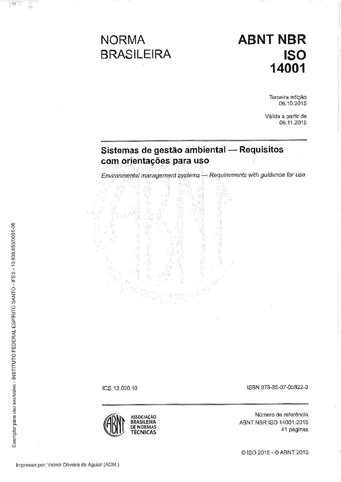 <p>NORMA ABNT NBR BRASILEIRA ISO 14001 Terceira edição 06.10.2015 Válida a partir de 06.11.2015 Sistemas de gestão ambiental - Requisitos com orientações para uso Environmental management systems - Requirements with guidance for use ICS ISBN 978-85-07-05822-9 para ASSOCIAÇÃO Número de referência BRASILEIRA ABNT NBR ISO 14001:2015 DE NORMAS TÉCNICAS 41 páginas ISO 2015 - ABNT 2015 Impresso por: Valmir Oliveira de Aguiar (ADM.)</p><p>ABNT NBR ISO 14001:2015 ISO 2015 Todos os direitos reservados. A menos que especificado de outro modo, nenhuma parte desta publicação pode ser reproduzida ou utilizada por qualquer eletrônico ou mecânico, incluindo fotocópia e microfilme, sem permissão por escrito da ABNT, único representante da ISO no território brasileiro. ABNT 2015 Todos os direitos reservados. A menos que especificado de outro modo, nenhuma parte desta publicação pode ser reproduzida ou utilizada por qualquer meio, eletrônico ou mecânico, incluindo fotocópia e microfilme, sem permissão por escrito da ABNT. ABNT Av. Treze de Maio, 13 - andar 20031-901 - Rio de Janeiro RJ Tel.: + 55 21 3974-2300 Fax: + 55 21 3974-2346 abnt@abnt.org.br www.abnt.org.br para ISO 2015 - ABNT 2015 - Todos os direitos reservados Impresso por: Valmir Oliveira de Aguiar (ADM.)</p><p>ABNT NBR ISO 14001:2015 Sumário Página Prefácio Nacional vi 0 Introdução viii 0.1 Histórico viii 0.2 Objetivo de um sistema de gestão ambiental viii 0.3 Fatores de sucesso ix 0.4 Ciclo Plan-Do-Check-Act ix 0.5 Conteúdo desta Norma X 1 Escopo 1 2 Referências normativas 1 3 Termos e definições 1 3.1 Termos referentes à organização e liderança 1 3.2 Termos referentes ao planejamento 2 3.3 Termos referentes ao suporte e à operação 4 3.4 Termos referentes à avaliação de desempenho e melhoria 5 4 Contexto da organização 7 4.1 Entendendo a organização e seu contexto 7 4.2 Entendendo as necessidades e expectativas de partes interessadas 7 4.3 Determinando o escopo do sistema de gestão ambiental 7 4.4 Sistema de gestão ambiental 7 5 Liderança 8 5.1 Liderança e comprometimento 8 5.2 Política ambiental 8 5.3 Papéis, responsabilidades e autoridades organizacionais 9 6 Planejamento 9 6.1 Ações para abordar riscos e oportunidades 9 6.1.1 Generalidades 9 6.1.2 Aspectos ambientais 10 6.1.3 Requisitos legais e outros requisitos 10 6.1.4 Planejamento de ações 11 6.2 Objetivos ambientais e planejamento para alcançá-los 11 6.2.1 Objetivos ambientais 11 6.2.2 Planejamento de ações para alcançar os objetivos ambientais 11 7 Apoio 12 7.1 Recursos 12 7.2 Competência 12 7.3 Conscientização 12 7.4 Comunicação 13 7.4.1 Generalidades 13 para 7.4.2 Comunicação interna 13 7.4.3 Comunicação externa 13 7.5 Informação documentada 13 ISO 2015 ABNT 2015 Todos os direitos reservados iii Impresso por: Valmir Oliveira de Aguiar (ADM.)</p><p>ABNT NBR ISO 14001:2015 7.5.1 Generalidades 13 7.5.2 Criando e atualizando 14 7.5.3 Controle de informação documentada 14 8 Operação 15 8.1 Planejamento e controle operacionais 15 8.2 Preparação e resposta a emergências 15 9 Avaliação de desempenho 16 9.1 Monitoramento, medição, análise e avaliação 16 9.1.1 Generalidades 16 9.1.2 Avaliação do atendimento aos requisitos legais e outros requisitos 16 9.2 Auditoria interna 17 9.2.1 Generalidades 17 9.2.2 Programa de auditoria interna 17 9.3 Análise crítica pela direção 17 10 Melhoria 19 10.1 Generalidades 19 10.2 Não conformidade e ação corretiva 19 Melhoria contínua 19 Anexo A (informativo) Orientações para uso desta Norma 20 A.1 Generalidades 20 A.2 Esclarecimento da estrutura e terminologia 21 A.3 Esclarecimento de conceitos 21 A.4 Contexto da organização 22 A.4.1 Entendendo a organização e seu contexto 22 A.4.2 Entendendo as necessidades e expectativas de partes interessadas 23 A.4.3 Determinando o escopo do sistema de gestão ambiental 23 A.4.4 Sistema de gestão ambiental 24 A.5 Liderança 24 A.5.1 Liderança e comprometimento 24 A.5.2 Política ambiental 24 A.5.3 Papéis, responsabilidades e autoridades organizacionais 25 A.6 Planejamento 25 A.6.1 Ações para abordar riscos e oportunidades 25 A.6.1.1 Generalidades 25 A.6.1.2 Aspectos ambientais 26 A.6.1.3 Requisitos legais e outros requisitos 28 A.6.1.4 Planejamento de ações 29 A.6.2 Objetivos ambientais e planejamento para alcançá-los 29 A.7 Apoio 30 A.7.1 Recursos 30 para A.7.2 Competência 30 A.7.3 Conscientização 30 A.7.4 Comunicação 31 iv ISO 2015 - ABNT 2015 Todos os direitos reservados Impresso por: Valmir Oliveira de Aguiar (ADM.)</p><p>ABNT NBR ISO 14001:2015 A.7.5 Informação documentada 31 A.8 Operação 32 A.8.1 Planejamento e controle operacional 32 A.8.2 Preparação e resposta a emergências 33 A.9 Avaliação de desempenho 34 A.9.1 Monitoramento, medição, análise e avaliação 34 A.9.1.1 Generalidades 34 A.9.1.2 Avaliação do atendimento aos requisitos legais e outros requisitos 34 A.9.2 Auditoria interna 34 A.9.3 Análise crítica pela direção 35 A.10 Melhoria 35 A.10.1 Generalidade 35 A.10.2 Não conformidade e ação corretiva 35 A.10.3 Melhoria contínua 35 Anexo B (informativo) Correspondência entre a ABNT NBR ISO 14001:2015 e a ABNT NBR ISO 14001:2004 36 Bibliografia 39 Índice alfabético de termos 40 Figura Figura 1 - Relação entre o ciclo PDCA e a estrutura desta Norma Tabela Tabela B.1 - Correspondência entre a ABNT NBR ISO 14001:2015 e a ABNT NBR ISO 14001:2004 36 para ISO 2015 - ABNT 2015 - Todos os direitos reservados V Impresso por: Valmir Olíveira de Aguiar (ADM.)</p><p>ABNT NBR ISO 14001:2015 Prefácio Nacional A Associação Brasileira de Normas Técnicas (ABNT) é Foro Nacional de Normalização. As Normas Brasileiras, cujo conteúdo é de responsabilidade dos Comitês Brasileiros (ABNT/CB), dos Organismos de Normalização Setorial (ABNT/ONS) e das Comissões de Estudo Especiais (ABNT/CEE), são elaboradas por Comissões de Estudo (CE), formadas pelas partes interessadas no 