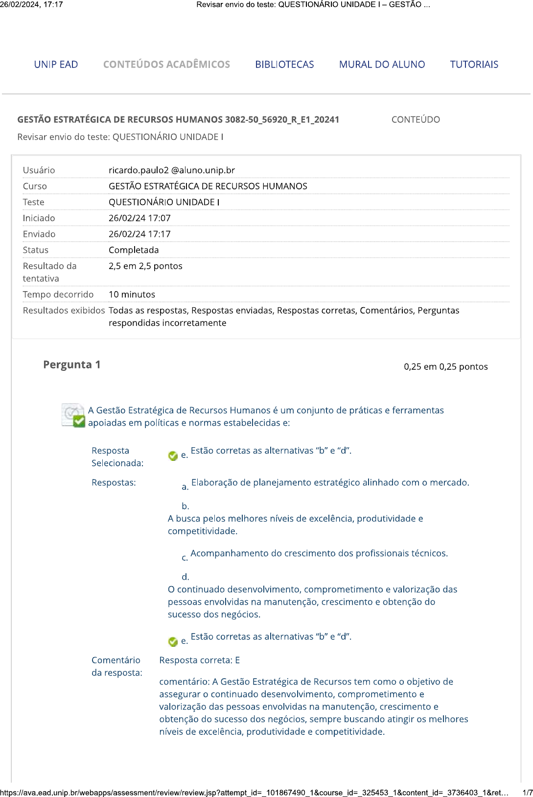 <p>26/02/2024, 17:17 Revisar envio do teste: QUESTIONÁRIO UNIDADE GESTÃO ... UNIP EAD CONTEÚDOS ACADÊMICOS BIBLIOTECAS MURAL DO ALUNO TUTORIAIS GESTÃO ESTRATÉGICA DE RECURSOS HUMANOS CONTEÚDO Revisar envio do teste: QUESTIONÁRIO UNIDADE Usuário ricardo.paulo2@aluno.unip.br Curso GESTÃO ESTRATÉGICA DE RECURSOS HUMANOS Teste QUESTIONÁRIO UNIDADE Iniciado 26/02/24 17:07 Enviado 26/02/24 17:17 Status Completada Resultado da 2,5 em 2,5 pontos tentativa Tempo decorrido 10 minutos Resultados exibidos Todas as respostas, Respostas enviadas, Respostas corretas, Comentários, Perguntas respondidas incorretamente Pergunta 1 0,25 em 0,25 pontos A Gestão Estratégica de Recursos Humanos é um conjunto de práticas e ferramentas apoiadas em políticas e normas estabelecidas e: Resposta Estão corretas as alternativas "b" e "d". e. Selecionada: Respostas: a. Elaboração de planejamento estratégico alinhado com o mercado. b. A busca pelos melhores níveis de excelência, produtividade e competitividade. Acompanhamento do crescimento dos profissionais técnicos. C. d. continuado desenvolvimento, comprometimento e valorização das pessoas envolvidas na manutenção, crescimento e obtenção do sucesso dos negócios. Estão corretas as alternativas "b" e "d". e. Comentário Resposta correta: E da resposta: comentário: A Gestão Estratégica de Recursos tem como o objetivo de assegurar o continuado desenvolvimento, comprometimento e valorização das pessoas envolvidas na manutenção, crescimento e obtenção do sucesso dos negócios, sempre buscando atingir os melhores níveis de excelência, produtividade e competitividade. 1/7</p><p>26/02/2024, 17:17 Revisar envio do teste: QUESTIONÁRIO UNIDADE GESTÃO Pergunta 2 0,25 em 0,25 pontos As organizações precisam estar conscientes de que a cultura não é algo estático, inventado ali por uma ou outra pessoa, mas é sim: Resposta b. Selecionada: Uma complicada interação ou interseção entre mundos, culturas e pessoas diferentes entre si. Respostas: a. Interseção entre mundos e negócios. b. Uma complicada interação ou interseção entre mundos, culturas e pessoas diferentes entre si. C. Globalização e diversidade local. d. Culturas diferentes e investimento tecnológico. e. NDA. Comentário Resposta correta: alternativa b da resposta: Comentário: é importante ressaltar que os objetivos das organizações são, em boa parte, definidos pela legislação. No entanto, haverá sempre reações e mudanças em suas formas de interpretação e, consequentemente, aplicação. As organizações precisam estar conscientes de que a cultura não é algo estático, inventado ali por uma ou outra pessoa, mas é sim uma complicada interação ou interseção entre mundos, culturas e pessoas diferentes entre si. Pergunta 3 0,25 em 0,25 pontos Gibson considera que as organizações se caracterizam por um comportamento: Resposta C. Selecionada: Voltado para determinados objetivos e que as mesmas criam ambientes que influenciam a vida de todos os envolvidos. Respostas: Político-financeiro. a. b. Político-social. C. Voltado para determinados objetivos e que as mesmas criam ambientes que influenciam a vida de todos os envolvidos. d. Econômico-social. 2/7</p><p>26/02/2024, 17:17 Revisar envio do teste: QUESTIONÁRIO UNIDADE GESTÃO NDA. e. Comentário Resposta correta: alternativa da resposta: Comentário: Gibson e outros (1981) consideram que as organizações se caracterizam por um comportamento voltado para determinados objetivos e que as mesmas criam ambientes que influenciam a vida de todos os envolvidos. Organização, em uma empresa, é o seu quadro estrutural de cargos definidos por respectivos títulos, responsabilidades, relações formais, nível de autoridades, atribuições básicas e aspectos culturais. Pergunta 4 0,25 em 0,25 pontos monumental avanço das telecomunicações nos últimos anos fez surgir uma nova forma de convivência social e de relacionamento, visando à: Resposta a. Selecionada: Efetivação de negócios na sociedade contemporânea, na qual criatividade, inovação, qualidade, produtividade e competitividade determinam as ações e as tendências. Respostas: a. Efetivação de negócios na sociedade contemporânea, na qual criatividade, inovação, qualidade, produtividade e competitividade determinam as ações e as tendências. b. Produtividade e à competitividade. Criatividade e à inovação. C. d. Qualidade, à produtividade e à inovação. e. Inovação, à qualidade e à criatividade. Comentário Resposta: alternativa a da resposta: Comentário: o monumental avanço das telecomunicações nos últimos anos fez surgir uma nova forma de convivência social e de relacionamento, visando à efetivação de negócios na sociedade contemporânea, na qual criatividade, inovação, qualidade, produtividade e competitividade determinam as ações e as tendências. Essa revolução vem provocando mudanças radicais nos costumes e nos valores tradicionais, ao mesmo tempo em que impõe outros e rompe, de maneira impressionante, praticamente todos os tipos de barreiras e preconceitos. Pergunta 5 0,25 em 0,25 pontos</p><p>26/02/2024, 17:17 Revisar envio do teste: QUESTIONÁRIO UNIDADE - GESTÃO ... que mais incomoda cidadãos, empresas, entidades, instituições e governos de todo o mundo, nesse início de novo milênio? Resposta C. Selecionada: É a certeza de ser praticamente impossível vislumbrar, sem o domínio do conhecimento científico e da tecnologia, o desenvolvimento, a indispensável competitividade e, em muitos casos, mesmo a sobrevivência. Respostas: Domínio tecnológico por parte dos profissionais recém-formados. a. b. A baixa qualidade nos serviços terceirizados. C. É a certeza de ser praticamente impossível vislumbrar, sem o domínio do conhecimento científico e da tecnologia, o desenvolvimento, a indispensável competitividade e, em muitos casos, mesmo a sobrevivência. d. A falta de conhecimento 