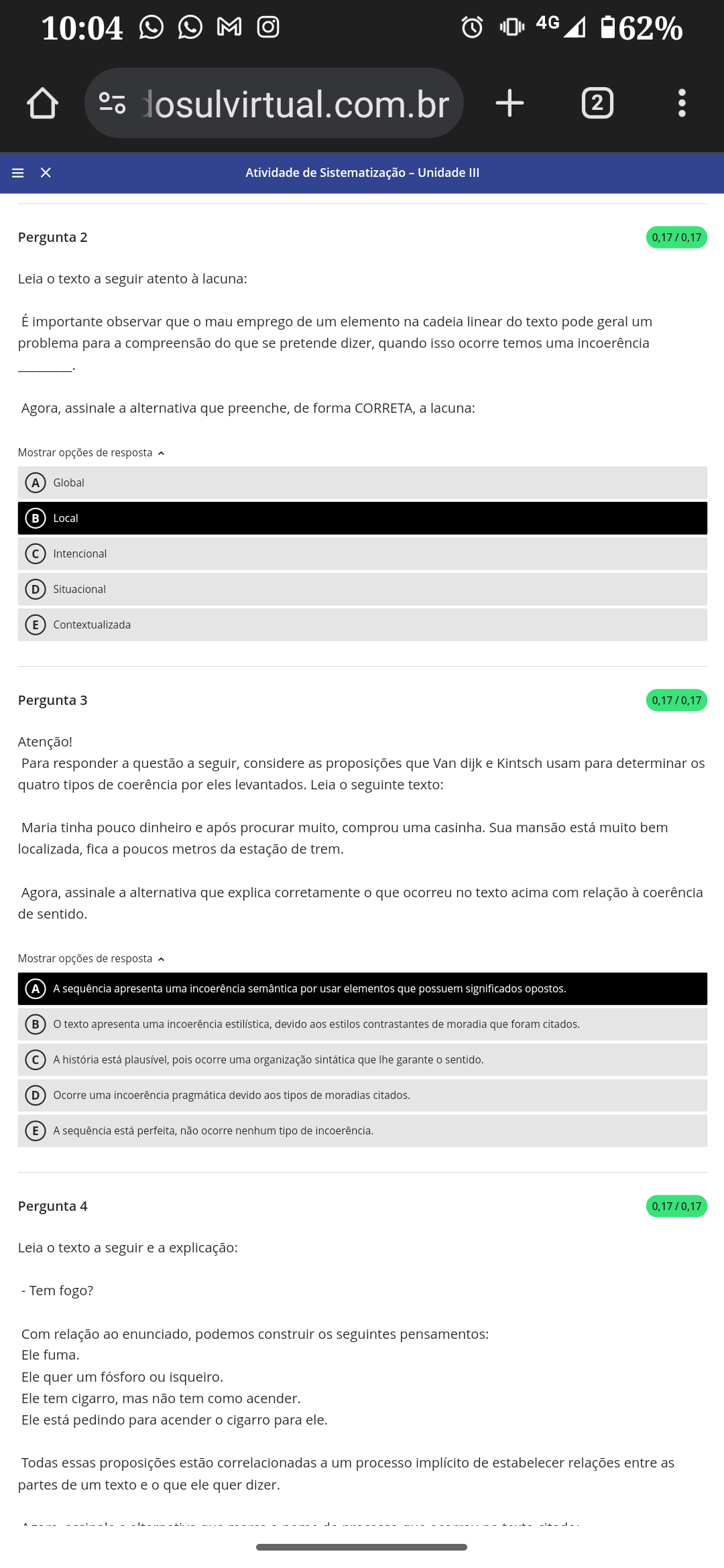 <p>10:04 4G dosulvirtual.com.br + 2 Atividade de Sistematização - Unidade III Pergunta 2 Leia o texto a seguir atento à lacuna: É importante observar que o mau emprego de um elemento na cadeia linear do texto pode geral um problema para a compreensão do que se pretende dizer, quando isso ocorre temos uma incoerência Agora, assinale a alternativa que preenche, de forma CORRETA, a lacuna: Mostrar opções de resposta A Global Local C Intencional D Situacional E Contextualizada Pergunta 3 0,17/0,17 Atenção! Para responder a questão a seguir, considere as proposições que Van dijk e Kintsch usam para determinar os quatro tipos de coerência por eles levantados. Leia o seguinte texto: Maria tinha pouco dinheiro e após procurar muito, comprou uma casinha. Sua mansão está muito bem localizada, fica a poucos metros da estação de trem. Agora, assinale a alternativa que explica corretamente o que ocorreu no texto acima com relação à coerência de sentido. Mostrar opções de resposta A A sequência apresenta uma incoerência semântica por usar elementos que possuem significados opostos. B o texto apresenta uma incoerência estilística, devido aos estilos contrastantes de moradia que foram citados. C A história está plausível, pois ocorre uma organização sintática que lhe garante o sentido. D Ocorre uma incoerência pragmática devido aos tipos de moradias citados. E A sequência está perfeita, não ocorre nenhum tipo de incoerência. Pergunta 4 o texto a seguir e a explicação: Tem fogo? Com relação ao enunciado, podemos construir os seguintes pensamentos: Ele fuma. Ele quer um fósforo ou isqueiro. Ele tem cigarro, mas não tem como acender. Ele está pedindo para acender o cigarro para ele. Todas essas proposições estão correlacionadas a um processo implícito de estabelecer relações entre as partes de um texto e o que ele quer dizer.</p>