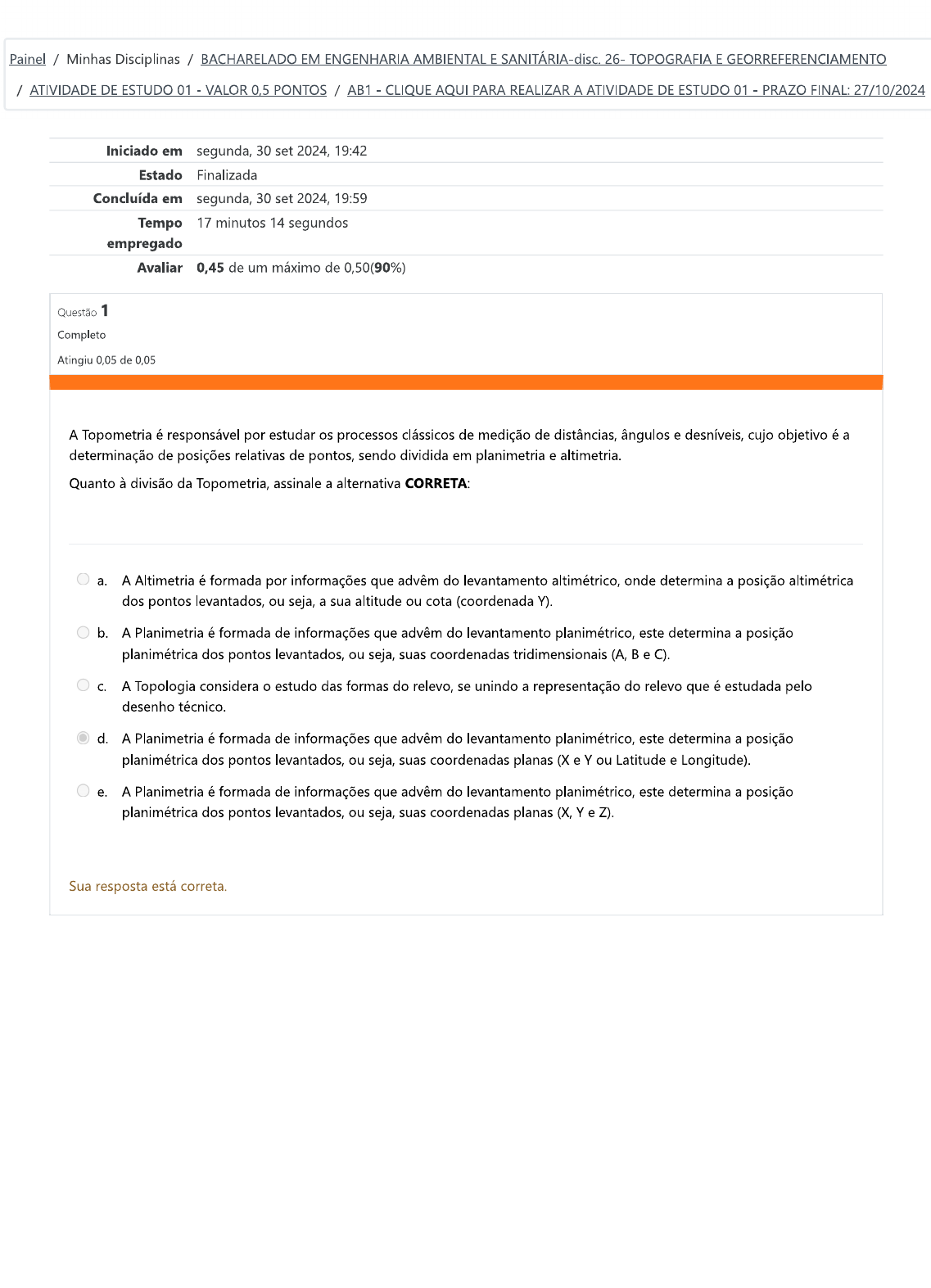 <p>Painel / Minhas Disciplinas / BACHARELADO EM ENGENHARIA AMBIENTAL E SANITÁRIA-disc. 26- TOPOGRAFIA E GEORREFERENCIAMENTO / ATIVIDADE DE ESTUDO 01 - VALOR 0,5 PONTOS / AB1 - CLIQUE PARA REALIZAR A ATIVIDADE DE ESTUDO 01 - PRAZO FINAL: 27/10/2024 Iniciado em segunda, 30 set 2024, 19:42 Estado Finalizada Concluída em segunda, 30 set 2024, 19:59 Tempo 17 minutos 14 segundos empregado Avaliar 0,45 de um máximo de 0,50(90%) Questão 1 Completo Atingiu 0,05 de 0,05 A Topometria é responsável por estudar os processos clássicos de medição de distâncias, ângulos e desníveis, cujo objetivo é a determinação de posições relativas de pontos, sendo dividida em planimetria e altimetria. Quanto à divisão da Topometria, assinale a alternativa CORRETA: a. A Altimetria é formada por informações que advêm do levantamento altimétrico, onde determina a posição altimétrica dos pontos levantados, ou seja, a sua altitude ou cota (coordenada Y). b. A Planimetria é formada de informações que advêm do levantamento planimétrico, este determina a posição planimétrica dos pontos levantados, ou seja, suas coordenadas tridimensionais (A, B e C). C. A Topologia considera o estudo das formas do relevo, se unindo a representação do relevo que é estudada pelo desenho técnico. d. A Planimetria é formada de informações que advêm do levantamento planimétrico, este determina a posição planimétrica dos pontos levantados, ou seja, suas coordenadas planas (X e Y ou Latitude e Longitude). e. A Planimetria é formada de informações que advêm do levantamento planimétrico, este determina a posição planimétrica dos pontos levantados, ou seja, suas coordenadas planas (X, Y e Z). Sua resposta está correta.</p><p>Questão 2 Completo Atingiu 0,05 de 0,05 Os romanos utilizavam instrumentos de alta tecnologia para sua época, em aplicações topográficas, os três instrumentos de medida eram a groma, dioptra e o chorobate. Conhecendo a função de cada um desses instrumentos, assinale a alternativa CORRETA: a. A groma é um esquadro óptico ou esquadro de agrimensor que divide o espaço em quatro quadrantes e serve para o traçado apenas de linhas retas. b. A groma é um esquadro óptico ou esquadro de agrimensor que divide o espaço em três quadrantes e serve para o traçado de linhas retas e ângulos retos. C. A groma é um esquadro óptico ou esquadro de agrimensor que divide o espaço em quatro quadrantes e serve para o traçado de linhas retas e ângulos retos. d. A dioptra é um esquadro óptico ou esquadro de agrimensor que divide o espaço em três quadrantes. e. chorobate é um equipamento que permite a medida de diferença de nível apenas em pontos próximos. Sua resposta está correta.</p><p>Questão 3 Completo Atingiu 0,05 de 0,05 Levando em consideração que o levantamento planimétrico representa o conjunto de processos e operações para obter as informações da área de estudo e ser representado numa planta topográfica, assinale a alternativa CORRETA: I) Para que um levantamento topográfico ocorra com eficiência, o mesmo deve ter no mínimo as seguintes fases: Planejamento e seleção de métodos e aparelhagem, apoio topográfico, levantamento de detalhes, cálculos e ajustes, original topográfico, desenho topográfico e relatório técnico; II) método mais empregado no levantamento topográfico planimétrico é o método denominado poligonação (caminhamento); III) levantamento de uma poligonal é realizado através do método de caminhamento, percorrendo o contorno de um itinerário definido por uma série de pontos e medindo todos os ângulos, lados e uma orientação inicial; IV) De acordo com a norma, a poligonal é classificada em poligonal fechada, aberta e enquadrada; V) A poligonal fechada, parte de um ponto com coordenadas conhecidas e retorna ao mesmo ponto. Sua principal vantagem é permitir a verificação de erro de fechamento angular e linear. Este tipo de levantamento é utilizado para medições de médias a grandes áreas, sendo utilizado para determinar a planta perimétrica, usucapião, entre outros. a. As afirmações I, II, III, IV e V estão corretas. b. Apenas III e IV estão corretas. C. Apenas III, IV e V estão corretas. d. Apenas V está correta. e. Apenas I, e III estão corretas. Sua resposta está correta.</p><p>Questão 4 Completo Atingiu 0,00 de 0,05 Segundo a NBR 13133 (2021), o levantamento planimétrico pode ser definido como o levantamento dos limites e confrontações de uma propriedade, pela determinação do seu perímetro, incluindo, quando houver, o alinhamento da via ou logradouro com o qual faça divisa. Considerando as características deste procedimento, assinale a alternativa CORRETA que corresponde aos principais conceitos da planimetria: I. Métodos de medições de distâncias horizontais; II. Métodos de medições de ângulos horizontais; III. Métodos de medições de ângulos verticais; IV. Orientação e desenho técnico; V. Orientação e memorial descritivo. a. Apenas I, e V estão corretas. b. Apenas III e IV estão corretas. C. Apenas I, III e IV estão corretas. d. As afirmações I, II, III, IV e V estão incorretas. e. Apenas e estão corretas. Sua resposta está incorreta.</p><p>Questão 5 Completo Atingiu 0,05 de 0,05 Segundo o Instituto Brasileiro de Geografia e Estatística (IBGE), é importante ressaltar que não existe uma projeção cartográfica livre de deformações, devido à impossibilidade de se representar uma superfície esférica em uma superfície plana sem que ocorram extensões e/ou contrações. Por meio das características de uma projeção cartográfica, assinale a alternativa CORRETA: a. Ao escolher a projeção cartográfica a ser utilizada, o produtor do mapa não deve realçar atributos que sejam de seu interesse, ou até mesmo esconder ou diminuir elementos, assim, influenciando os leitores dos mapas. b. Os desenhos cartográficos são um conjunto de linhas (paralelos e m