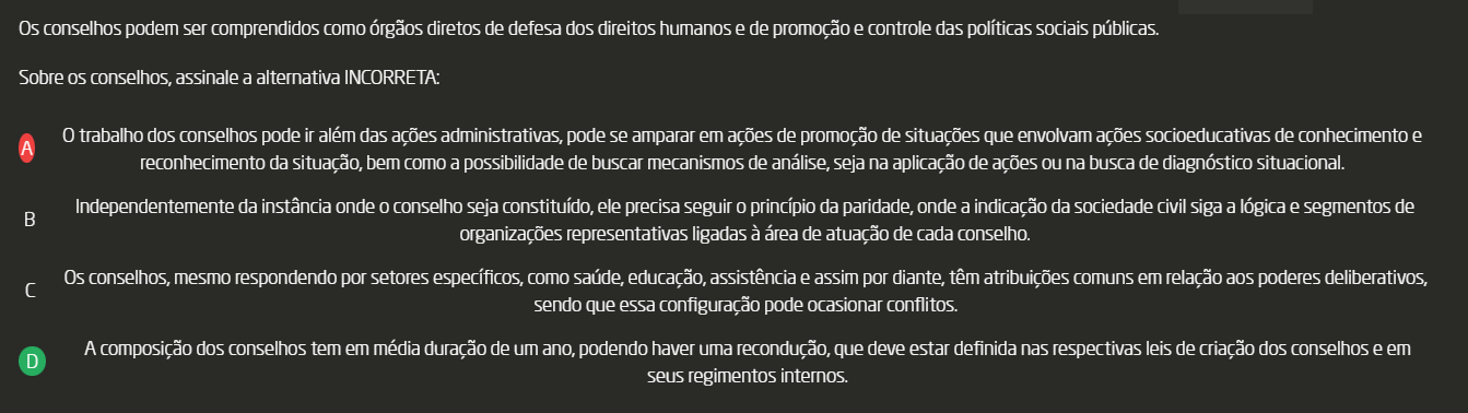 <p>Os conselhos podem ser comprendidos como órgãos diretos de defesa dos direitos humanos e de promoção e controle das políticas sociais públicas. Sobre conselhos, assinale a alternativa INCORRETA: trabalho dos conselhos pode ir além das ações administrativas, pode se amparar em ações de promoção de situações que envolvam ações socioeducativas de conhecimento e reconhecimento da situação, bem como a possibilidade de buscar mecanismos de análise, seja na aplicação de ações ou na busca de diagnóstico situacional. Independentemente da instância onde conselho seja constituído, ele precisa seguir princípio da paridade, onde a indicação da sociedade civil siga a lógica e segmentos de B organizações representativas ligadas à área de atuação de cada conselho. Os conselhos, mesmo respondendo por setores específicos, como saúde, educação, assistência e assim por diante, têm atribuições comuns em relação aos poderes deliberativos, sendo que essa configuração pode ocasionar conflitos. A composição dos conselhos tem em média duração de um ano, podendo haver uma que deve estar definida nas respectivas leis de criação dos conselhos e em D seus regimentos internos.</p>