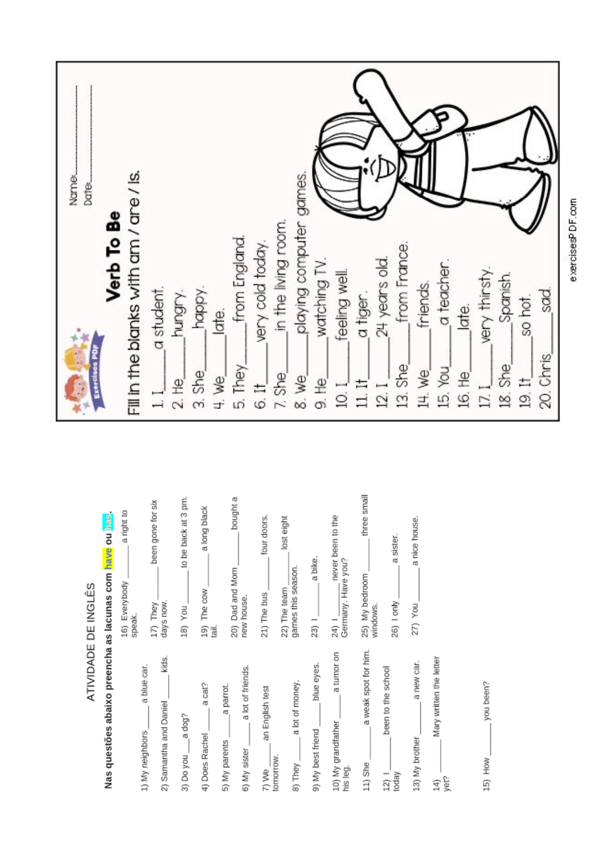 <p>ATIVIDADE DE INGLÊS Exercises PDF Nas questões abaixo preencha as lacunas com have ou has. Verb To Be 16) Everybody a right to speak. Fill in the blanks with am / are / is. 1) My neighbors a blue car. 17) They been gone for six 1. I a student. 2) Samantha and Daniel kids. days now. 2. He 3) Do you a dog? 18) You to be back at 3 pm. hungry. 3. She 4) Does Rachel a cat? 19) The cow a long black happy. tail. 4. We late. 5) My parents a parrot. 20) Dad and Mom bought a 6) My sister a lot of friends. new house. 5. They from 7) We an English test 21) The bus four doors. 6. It very cold today. tomorrow. 22) The team lost eight 7. She in the living room. 8) They a lot of money. games this season. 8. We playing computer games. 9) My best friend blue eyes. 23) I a bike. 9. He watching TV. 10) My grandfather a tumor on 24) I never been to the his leg. Germany. Have you? 10. I feeling well. 11) She a weak spot for him. 25) My bedroom three small 11. It a tiger. windows. 12) I been to the school 12. I 24 years old. today 26) I only a sister. 13. She from France. 13) My brother a new car. 27) You a nice house. 14. We friends. 14) Mary written the letter yet? 15. You a teacher. 16. He late. 15) How you been? I very thirsty. 18. She Spanish. 19. It hot. 20. Chris exercisesP com</p><p>ATIVIDADE DE ESTUDANTE: PROFESSOR (A): DATA: / / ESCOLA: TURMA: 1. Com auxílio dos pronomes, conjugue 3. Considerando os sujeitos de cada o verbo "to be" na forma interrogativa do frase, complete as frases com o verbo "simple "to be" na forma interrogativa. I a) John ready for the meeting? YOU b) Sarah and David coming to HE the concert? SHE c) Emma a doctor? IT d) Mike and Lisa married? WE THEY e) James the new manager? 2. Transforme as seguintes frases em 4. A seguintes frases estão na forma perguntas. negativa, transforme-as para a forma interrogativa. a) We are going the right way. a) Mary is not tired after her workout. b) You are feeling okay. b) Robert and Emily are not married to each other. c) He is coming to the party. d) They are sisters. c) Alex is not interested in playing video games. e) I am late. d) Samantha is not a fan of spicy food. f) You are a student.</p>