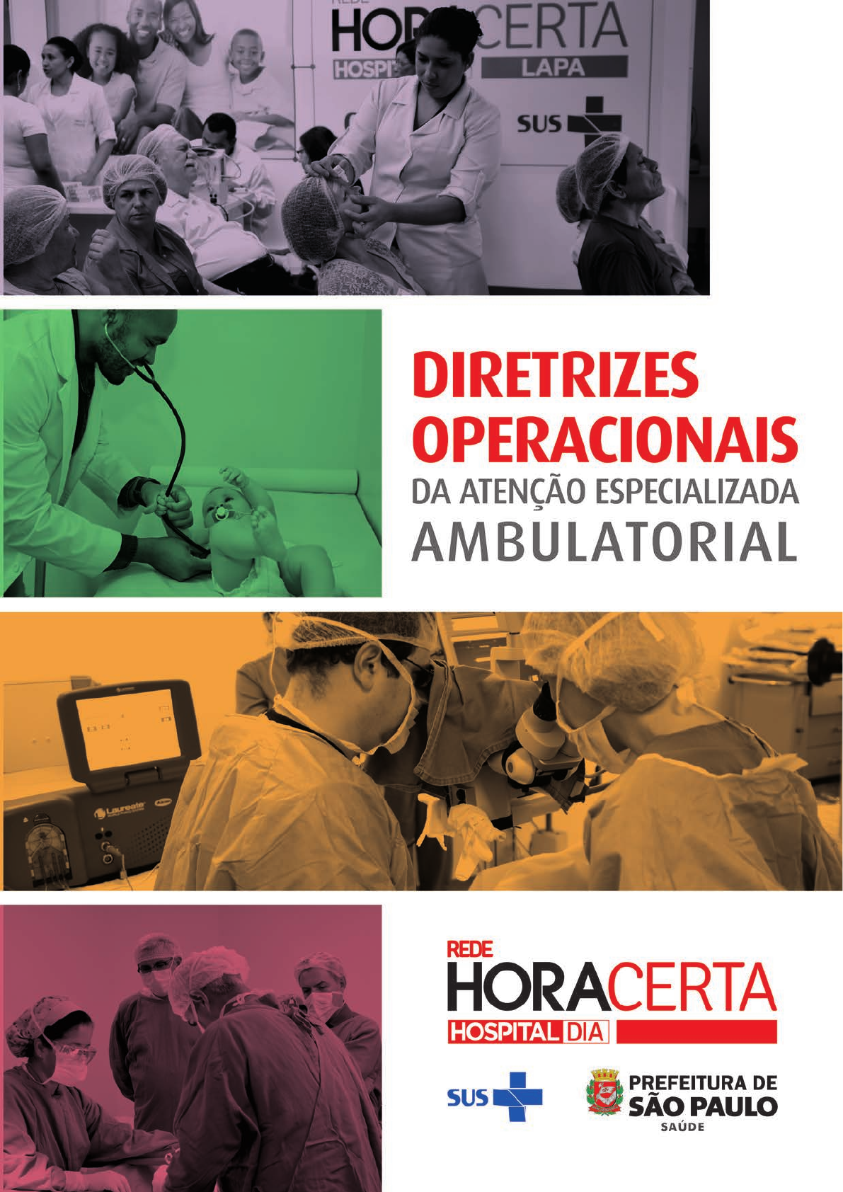 <p>Diretrizes Operacionais da Atenção Especializada Ambulatorial Hospital Dia da Rede Hora Certa 1</p><p>2</p><p>Diretrizes Operacionais da Atenção Especializada Ambulatorial Hospital Dia da Rede Hora Certa 3</p><p>Diretrizes Operacionais</p><p>Da Atenção Especializada</p><p>Ambulatorial</p><p>4</p><p>PREFEITO</p><p>Fernando Haddad</p><p>SECRETÁRIO MUNICIPAL DE SAÚDE</p><p>Alexandre Rocha Santos Padilha</p><p>SECRETÁRIA ADJUNTO MUNICIPAL DE SAÚDE</p><p>Celia Cristina Pereira Bortoletto</p><p>CHEFE DE GABINETE</p><p>Mariana Neubern de Souza Almeida</p><p>COORDENADORES REGIONAIS DE SAÚDE</p><p>Alberto Alves de Oliveira – Norte</p><p>Alexandre Nemes Filho –Oeste</p><p>Claudia Maria Afonso de Castro - Leste</p><p>Clovis Silveira Junior - Centro</p><p>Karina Barros Kalife Batista – Sudeste</p><p>Tânia Zogbi Sahyoun – Sul</p><p>COORDENADOR DA REDE DE ATEN-</p><p>ÇÃO ESPECIALIZADA AMBULATORIAL</p><p>(AEA/ Hospital Dia Rede Hora Certa)</p><p>Flavius Augusto Oliveti Albieri</p><p>Diretrizes Operacionais da Atenção Especializada Ambulatorial Hospital Dia da Rede Hora Certa 5</p><p>EQUIPE TÉCNICA DE FORMULAÇÃO DAS DIRETRI-</p><p>ZES OPERACIONAIS DA ATENÇÃO ESPECIALIZADA</p><p>AMBULATORIAL/HOSPITAL DIA DA REDE HORA</p><p>CERTA / AMBULATÓRIOS DE ATENÇÃO ESPECIALI-</p><p>ZADA (AE/AMA-E)</p><p>I. GRUPO DE TÉCNICO ATENÇÃO ESPECIALIZA-</p><p>DA AMBULATORIAL</p><p>Ana Kelly Malaquias – SMS.G</p><p>Ana Lúcia Paioni – CRS Sudeste</p><p>Celina de Antônio Aquino – CRS Leste</p><p>Débora Rita Burjato Santana – CRS Norte</p><p>Denise Carreira – CRS Oeste</p><p>Evani Marzagão Beringhs – CRS Centro</p><p>Flavius Augusto Olivetti Albieri – SMS.G</p><p>Lais Borba Casella – CRS Sul</p><p>Larissa Desiderá Santo André – SMS.G</p><p>Lucia de Fatima Luna Mota – CRS Sudeste</p><p>Maria Aparecida Lucarelli – CRS Oeste</p><p>Roberto Aparecido Moreira – SMS.G</p><p>II. SUPERVISORES TÉCNICOS DE SAÚDE (STS)</p><p>STS Butantã</p><p>Regina Célia Porto Castanheira</p><p>STS Campo Limpo</p><p>Laina Ramos Lau Dell’ Aquila Gonçalves</p><p>STS Capela do Socorro</p><p>Lúcia Marques Cleto Duarte Iusim</p><p>STS Casa Verde/ Cachoeirinha</p><p>Zeni Rose Toloi</p><p>STS Cidade Tiradentes</p><p>Marta Pozzani Calixto de Jesus</p><p>STS São Miguel Paulista</p><p>Eliete Magda Fávaro</p><p>STS Ermelino Matarazzo</p><p>Tânia Maria Bonfim da Cunha</p><p>STS Freguesia do Ó/ Brasilândia</p><p>Jurema Westin Carvalho</p><p>STS Guaianases</p><p>Sueli Mitie Saito</p><p>STS Ipiranga</p><p>Sandra Regina de Araújo Gonzaga Brandão Tavares</p><p>STS Itaim Paulista</p><p>Ana Cristina Kantzos</p><p>STS Itaquera</p><p>Raquel D’Elia da Silva</p><p>STS Lapa/ Pinheiros</p><p>Ajax Perez Salvador</p><p>STS M’Boi Mirim</p><p>Vera Maria da Silva Ribeira</p><p>STS Mooca/ Aricanduva/ Formosa/ Carrão</p><p>Valéria Verkin Barsoumian</p><p>STS Parelheiros</p><p>Ana Paula Lima Orlando</p><p>STS Penha</p><p>Celso Gualhardo Monteiro</p><p>STS Pirituba/ Perus</p><p>João Marcondes da Silva Filho</p><p>STS Santana/ Jaçanã</p><p>Silvia Masson Braga</p><p>STS Santo Amaro/ Cidade Ademar</p><p>Sandra Maria Sabino Fonseca</p><p>STS São Mateus</p><p>Roberto de Alcantara Madeira</p><p>STS Vila Maria/ Vila Guilherme</p><p>José Mauro Del Roio Correia</p><p>STS Vila Mariana/ Jabaquara</p><p>Douglas Augusto Schneider</p><p>STS Vila Prudente/ Sapopemba</p><p>Rosely Loguercio</p><p>III. GERENTES DE ESTABELECIMENTOS DA</p><p>ATENÇÃO ESPECIALIZADA AMBULATORIAL</p><p>Hospital Dia da Rede Hora Certa:</p><p>Brasilândia</p><p>Rosemeire Fátima Biondo Pinto de Souza</p><p>Ipiranga – Flavio Giannotti</p><p>José Roberto Abdalla</p><p>Itaim Paulista - Carolina Fanaro Da Costa</p><p>Damato</p><p>Lapa</p><p>Marcelo de Paschoal</p><p>6</p><p>AMA - E</p><p>Burgo Paulista</p><p>Antonia Aparecida Ferreira Santos Silva</p><p>Capão Redondo</p><p>Nadja Tavares de França</p><p>Dr. Milton Aldred Ambulatório de Especialidades</p><p>Dirce Ferreira dos Santos</p><p>Itaquera</p><p>Silvia Napoli Fichino</p><p>Izolina Mazzei</p><p>Tatiana Fujinami</p><p>Jardim Cliper Ambulatório de Especialidades</p><p>Marcelo A. Castro</p><p>Jardim Icaraí Quintana</p><p>Lessiléia Gomes de Souza</p><p>Jardim São Luis</p><p>Sandro Norberto Fonseca Valle</p><p>Jd Guairacá</p><p>Elisangela Borges de Lima</p><p>Parque Peruche</p><p>Adalgisa Strumiello</p><p>Perus</p><p>Ana Aparecida O. Santos Liu</p><p>Santa Cecília</p><p>Lélia Teixeira da Silva</p><p>Vila Constância</p><p>Maria Célia Campello Montezuma</p><p>Vila das Mercês</p><p>Marcia Elisa da Silva Naddeo</p><p>Vila Zatt</p><p>Allan de Oliveira Andrade</p><p>M’ Boi Mirim II</p><p>Alexandra Nogueira Pereira Marques</p><p>M’Boi Mirim I</p><p>Vilma Farias dos Santos</p><p>Penha</p><p>Aurea Bianchi Leonardo</p><p>São Miguel</p><p>N ilza Maria Piassi Bertelli</p><p>Cidade Ademar</p><p>Maria Zaira Benites Gonçalves</p><p>Butanã</p><p>Josiane Carmele Homs Manasia</p><p>Vila Prudente</p><p>Cintia Heger</p><p>São Mateus</p><p>Sandra Lazaro Pereira</p><p>Campo Limpo</p><p>Jean Cley Miranda dos Santos</p><p>Mooca</p><p>Patricia Meire Caravante Gaia</p><p>AE</p><p>Ceci “Dr. Alexandre Kalil Yasbec”</p><p>Vania Lúcia Siervi Manso</p><p>Mooca “Dr. Ítalo Domingos Le Vocci”</p><p>Marcos Caldano</p><p>Freguesia do Ó</p><p>Rafael Tadeu de Andrade</p><p>Jose Bonifácio IV</p><p>Alexandra Dias Deodoroviv</p><p>Perus</p><p>Isabel Aparecida Nering Carlos</p><p>Pirituba</p><p>Vera Sales Bueno</p><p>São Carlos</p><p>Dalci Aparecida Figgi</p><p>Sapopemba</p><p>Jeane de Sant’Ana Ramalho</p><p>Tucuruvi</p><p>Braz de Castro Junior</p><p>V. Paranaguá</p><p>Marcia De Souza Dias</p><p>Diretrizes Operacionais da Atenção Especializada Ambulatorial Hospital Dia da Rede Hora Certa 7</p><p>COLABORAÇÕES TÉCNICAS</p><p>Adalberto Kiochi Aguemi;</p><p>Adilson Nunes Guardado;</p><p>Adriana Maria de Andrade Souza;</p><p>Alice Angela C. Almeida;</p><p>Antonio Carlos Barbosa Cintra de Souza