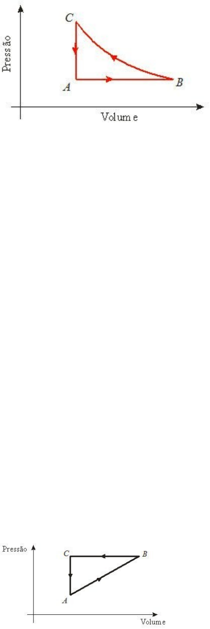 <p>Lista de Termodinâmica</p><p>01. (PUC–PR) Um gás ideal, confinado numa câmara, é submetido ao ciclo termodinâmico ABCA indicado na figura abaixo. A curva BC é uma isoterma.</p><p>Verifique se as proposições a seguir são corretas ou incorretas</p><p>I. Na etapa BC, calor flui do gás para a vizinhança;</p><p>II. Na etapa BC, a energia interna do gás aumenta;</p><p>III. Na etapa AB, a energia interna do gás fica constante;</p><p>IV. Na etapa AB, o gás recebe calor e realiza trabalho sobre a vizinhança;</p><p>V. Num ciclo ABCA, a energia interna do gás aumenta e este aumento é igual à área delimitada pelo ciclo;</p><p>Marque a alternativa que contém as proposições corretas.</p><p>a) I e IV, apenas.</p><p>b) V, apenas.</p><p>c) II e III, apenas.</p><p>d) II e IV, apenas.</p><p>e) I, IV e V, apenas.</p><p>02. (Fafeod-MG) Um gás ideal sofre uma transformação isovolumétrica (M) e uma expansão adiabática (N), partindo da mesma temperatura inicial e chegando, em ambas as transformações, à mesma temperatura final. Sejam ∆UM e ∆UN as variações de energia interna nas transformações M e N, respectivamente. Assim, é necessariamente CORRETO afirmar que</p><p>a) ∆UM = ∆UN.</p><p>b) ∆UM = ∆UN = 0.</p><p>b) ∆UM > ∆UN.</p><p>d) ∆UM 0 e ∆UN WII.</p><p>d) WI > WII > WIII.</p><p>05. (UNIMONTES-MG) Um estudante enche rapidamente o pneu de sua bicicleta. O processo pode ser considerado adiabático, ou seja, não há troca de calor entre o sistema (ar dentro do pneu) e o meio externo. A respeito do trabalho, W, realizado no processo e da variação da energia interna do sistema, ∆U, é CORRETO afirmar que:</p><p>a) W 0 e ∆U > 0.</p><p>c) W > 0 e ∆U 0.</p><p>06. (PUC-MG) Uma amostra de gás ideal sofre as transformações mostradas no diagrama pressão x volume, ilustrado a seguir. Observe-o bem e analise as afirmativas abaixo, apontando a opção correta:</p><p>a) A transformação AB é isobárica e a transformação BC, isométrica.</p><p>b) O trabalho feito pelo gás no ciclo ABCA é positivo.</p><p>c) Na etapa AB, o gás sofreu compressão, e na etapa BC, sofreu expansão.</p><p>d) O trabalho realizado sobre o gás na etapa CA foi de 8 J.</p><p>e) A transformação CA é isotérmica.</p><p>07. (UFBA) Uma certa quantidade de gás ideal realiza o ciclo ABCDA, representado na figura:</p><p>Nessas condições, pode-se concluir:</p><p>(01) No percurso AB, o trabalho realizado pelo gás é igual a 4x102 J.</p><p>(02) No percurso BC, o trabalho realizado é nulo.</p><p>(04) No percurso CD, ocorre aumento da energia interna.</p><p>(08) Ao completar cada ciclo, há conversão de calor em trabalho.</p><p>(16) Utilizando-se esse ciclo em uma máquina, de modo que o gás realize quatro ciclos por segundo, a potência dessa máquina será igual a 8x102 W.</p><p>08. (UECE) No diagrama PxV a seguir, quatro processos termodinâmicos cíclicos executados por um gás, com seus respectivos estados iniciais, estão representados. O processo no qual o trabalho resultante, realizado pelo gás, é menor é o:</p><p>a) I</p><p>b) J</p><p>c) K</p><p>d) L</p><p>09. (UPE) No diagrama PV, a seguir, está representada uma série de processos termodinâmicos. No processo ab, 250 J de calor são fornecidos ao sistema, e, no processo bd, 600 J de calor são fornecidos ao sistema.</p><p>Analise as afirmações que se seguem.</p><p>I. O trabalho realizado no processo ab é nulo.</p><p>II. A variação de energia interna no processo ab é 320 J.</p><p>III. A variação de energia interna no processo abd é 610 J.</p><p>IV. A variação de energia interna no processo acd é 560 J.</p><p>É CORRETO afirmar que apenas as(a) afirmações(ão)</p><p>a) II e IV estão corretas.</p><p>b) IV está correta.</p><p>c) I e III estão corretas.</p><p>d) III e IV estão corretas.</p><p>e) II e III estão corretas.</p><p>10. (UFRJ) A figura representa, num gráfico pressão x volume, um ciclo de um gás ideal:</p><p>a) Calcule o trabalho realizado pelo gás durante este ciclo.</p><p>b) Calcule a razão entre a mais alta e a mais baixa temperatura do gás (em kelvin) durante este ciclo.</p><p>11. (UERN) Considere a transformação cíclica de um gás perfeito representada no gráfico.</p><p>A variação da energia interna e o trabalho em cada ciclo são, respectivamente, iguais a:</p><p>a) 0 e 900 J</p><p>b) 900 J e 0</p><p>c) – 900 J e 0</p><p>d) 0 e – 900 J</p><p>12. Num processo à pressão constante de 1,0.10-5 Pa, um gás aumenta o seu volume de 9.10-6 m3 para 14.10-6 m3. O trabalho realizado pelo gás, em joules, é de:</p><p>a) 0,5</p><p>b) 0,7</p><p>c) 0,9</p><p>d) 1, 4</p><p>e) 2,1</p><p>13. (ENEM) Rudolf Diesel patenteou um motor a combustão interna de elevada eficiência, cujo ciclo está esquematizado no diagrama pressão x volume. O ciclo Diesel é composto por quatro etapas, duas das quais são adiabáticas. O motor de Diesel é caracterizado pela compressão de ar apenas, com a injeção do combustível no final.</p><p>No ciclo Diesel, o calor é absorvido em:</p><p>a) A => B e C => D, pois em ambos ocorre realização de trabalho.</p><p>b) A => B e B => C, pois em ambos ocorre elevação da temperatura.</p><p>c) C => D, pois representa uma expansão adiabática e o sistema realiza trabalho.</p><p>d) A => B, pois representa uma compressão adiabática em que ocorre elevação da temperatura.</p><p>e) B => C, pois representa expansão isobárica em que o sistema realiza trabalho e a temperatura se eleva.</p><p>14. (UNEB-Ba) Na montagem representada na figura abaixo a chama faz o pistão deslocar-se para a direita, mantendo o gás a pressão e temperatura constantes. O volume e a pressão iniciais eram, respectivamente, de 5,00 litros e 5,00 N/m2. O volume foi aumentado para 7,50 litros. A fração de energia da chama que o gás converteu em energia mecânica é, em J, igual a:</p><p>a) 375</p><p>b) 125</p><p>c) 37,5</p><p>d) 25,0</p><p>e) 12,5</p><p>15. (MACKENZIE-SP) Sobre 