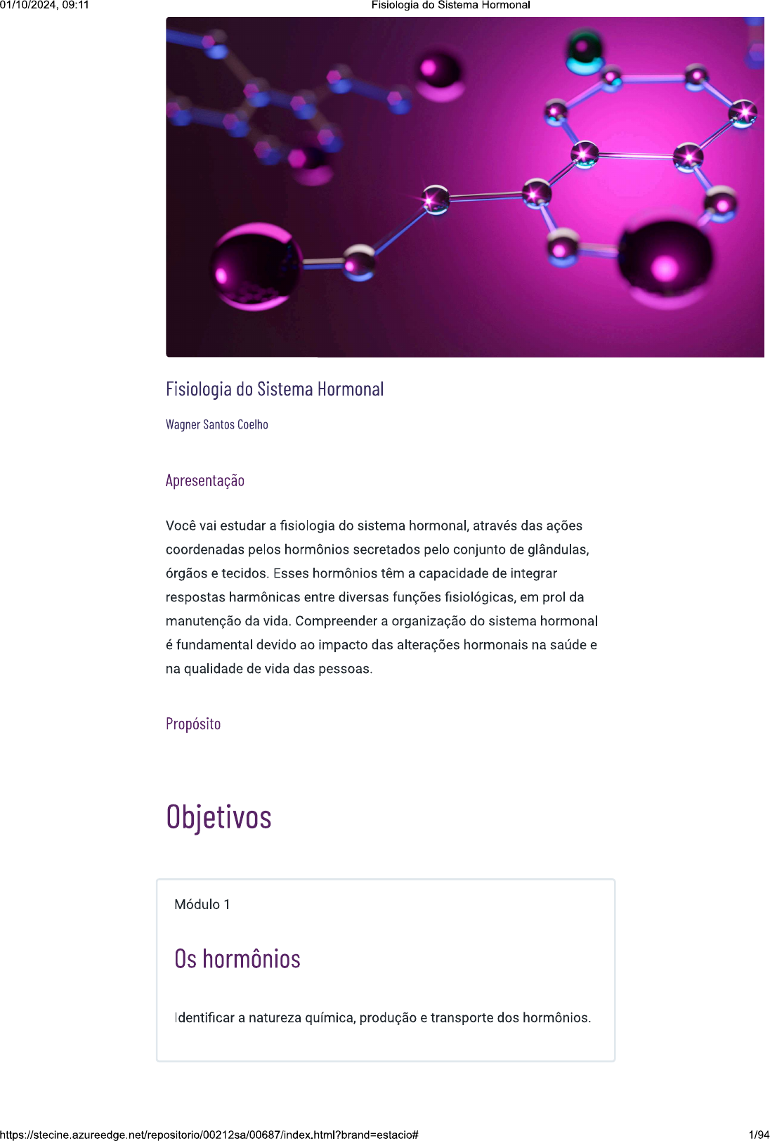 <p>0/2024, 09:11 Fisiologia do Sistema Hormonal Fisiologia do Sistema Hormonal Wagner Santos Coelho Apresentação Você vai estudar a fisiologia do sistema hormonal, através das ações coordenadas pelos hormônios secretados pelo conjunto de glândulas, órgãos e tecidos. Esses hormônios têm a capacidade de integrar respostas harmônicas entre diversas funções fisiológicas, em prol da manutenção da vida. Compreender a organização do sistema hormonal é fundamental devido ao impacto das alterações hormonais na saúde e na qualidade de vida das pessoas. Propósito Objetivos Módulo 1 Os hormônios Identificar a natureza química, produção e transporte dos hormônios. 1/94</p><p>01/10/2024, 09:11 Fisiologia do Sistema Hormonal Módulo 2 As funções fisiológicas e ação hormonal Reconhecer a coordenação e o controle das funções fisiológicas e da ação hormonal. Módulo 3 A integração hormonal Descrever os eixos fisiológicos de integração hormonal. Introdução Ao falarmos em endocrinologia, uma das primeiras coisas que passa pela nossa cabeça é o termo hormônios. A história da endocrinologia começa com a descoberta dos hormônios que são mensageiros químicos do nosso organismo, capazes de integrar funções entre os mais diversos órgãos e tecidos, através de uma complexa e harmônica rede de comunicação, que contribui para a manutenção da homeostase. A partir dessas descobertas, é possível investigar os efeitos fisiológicos, os mecanismos de ação, os tecidos-alvo, o papel dos hormônios em quadros patológicos e as alternativas terapêuticas para várias doenças. diabetes é uma doença conhecida desde a Antiguidade, cuja causa foi desconhecida por muitos anos. Somente em 1889 foi reportado em um estudo que a remoção do pâncreas de cachorros havia provocado aumento dos níveis de "açúcar" ou glicose no sangue, seguido de coma e morte, de forma semelhante à evolução do diabetes em humanos. 2/94</p><p>01/10/2024, 09:11 Fisiologia do Sistema Hormonal Em 1922, pesquisadores da Universidade de Toronto prepararam um extrato pancreático que reduziu os níveis de glicose no sangue de uma criança diabética, representando a descoberta do fator pancreático, que foi denominado insulina. Essas descobertas marcaram a história da fisiologia endócrina; ocorreram em uma época de tecnologia e ferramentas rudimentares e de pouco entendimento sobre a biologia e a fisiologia. De lá para cá, o avanço tecnológico permitiu a descoberta de diversas moléculas que são capazes de atuar como hormônios, como a leptina produzida pelo tecido adiposo, encontrada em 1994, e a grelina secretada pelo estômago, revelada em 1999, que são capazes de controlar a fome e a saciedade. Em 2012, foi descoberto um hormônio produzido pelo músculo esquelético, principalmente, de pessoas fisicamente ativas, denominado irisina, que ajuda a compreender os efeitos positivos de uma vida fisicamente ativa. Essas descobertas indicam que a fisiologia endócrina, através da descoberta de novos hormônios, ainda tem muito a revelar para a nossa compreensão da fisiologia humana. Material para download Clique no botão abaixo para fazer o download do conteúdo completo em formato PDF. Download material 3/94</p><p>01/10/2024, 09:11 Fisiologia do Sistema Hormonal 1 Os hormônios Ao final deste módulo, você será capaz de identificar a natureza química, produção e transporte dos hormônios. Natureza química e classificação dos hormônios Confira neste vídeo as características dos hormônios peptídicos, hormônios esteroides e hormônios derivados do aminoácido tirosina. Para assistir a um vídeo sobre o assunto, acesse a versão online deste conteúdo. Natureza química Os hormônios podem ser considerados os primeiros mensageiros químicos do sistema endócrino. Tradicionalmente, consideravam-se os hormônios substâncias secretadas pelas glândulas endócrinas. Hoje, sabe-se que outros órgãos também produzem, eventualmente armazenam e liberam hormônios, dentre eles: certos neurônios e células especializadas do trato digestivo, incluindo o estômago; coração, rins, pele, tecido adiposo e muscular esquelético. Você pode dizer que, no nosso corpo, vários tipos de mensageiros químicos são produzidos e liberados para atender necessidades 4/94</p><p>01/10/2024, 09:11 Fisiologia do Sistema Hormonal fisiológicas específicas, promovendo a coordenação e integração de respostas entre os mais diversos órgãos Mensageiros químicos Incluem os hormônios endócrinos, parácrinos, autócrinos, neuro- hormônios, citocinas, interleucinas, adipocinas, miocinas. Os hormônios são mensageiros químicos produzidos por células especializadas de glândulas e outros tecidos, que desempenham papel-chave na regulação de praticamente todas as funções do organismo, incluindo o controle do metabolismo, os processos bioenergéticos, a síntese de proteínas, o crescimento, o desenvolvimento, o equilíbrio hidroeletrolítico, a reprodução e o comportamento. Classificação dos hormônios Os hormônios são classificados de acordo com a natureza ou estrutura química da molécula e isso tem a ver com a "matéria-prima" usada na síntese desses mensageiros químicos. Você pode assumir que 0 que importa na determinação de um hormônio não é do que ele é feito e, sim, 0 que e como ele faz. Existem basicamente três classes gerais de hormônios em função da estrutura química do composto: 1 Hormônios peptídicos 2 Hormônios esteroides 3 Hormônios derivados do aminoácido tirosina 5/94</p><p>01/10/2024, 09:11 Fisiologia do Sistema Hormonal Hormônios peptídicos Os hormônios peptídicos são de origem proteica, ou seja, são formados a partir de sequências de aminoácidos e, assim, conservam as mesmas propriedades das proteínas. Entretanto, em comparação com as proteínas com funções estruturais ou dinâmicas, os hormônios são compostos por sequênc