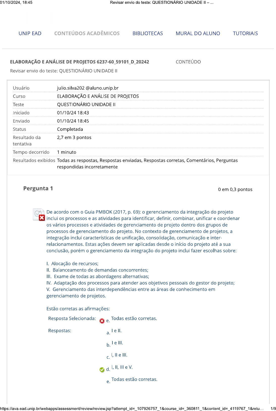 <p>01/10/2024, 18:45 Revisar envio do teste: QUESTIONÁRIO UNIDADE UNIP EAD CONTEÚDOS ACADÊMICOS BIBLIOTECAS MURAL DO ALUNO TUTORIAIS ELABORAÇÃO E ANÁLISE DE PROJETOS CONTEÚDO Revisar envio do teste: QUESTIONÁRIO UNIDADE Usuário julio.silva202@aluno.unip.br Curso ELABORAÇÃO E ANÁLISE DE PROJETOS Teste QUESTIONÁRIO UNIDADE II Iniciado 01/10/24 18:43 Enviado 01/10/24 18:45 Status Completada Resultado da 2,7 em 3 pontos tentativa Tempo decorrido 1 minuto Resultados exibidos Todas as respostas, Respostas enviadas, Respostas corretas, Comentários, Perguntas respondidas incorretamente Pergunta 1 0 em 0,3 pontos De acordo com o Guia PMBOK (2017, p. 69): o gerenciamento da integração do projeto inclui os processos e as atividades para identificar, definir, combinar, unificar e coordenar os vários processos e atividades de gerenciamento de projeto dentro dos grupos de processos de gerenciamento do projeto. No contexto de gerenciamento de projetos, a integração inclui características de unificação, consolidação, comunicação e inter- relacionamentos. Estas ações devem ser aplicadas desde o início do projeto até a sua conclusão, porém o gerenciamento da integração do projeto inclui fazer escolhas sobre: I. Alocação de recursos; II. Balanceamento de demandas concorrentes; III. Exame de todas as abordagens alternativas; IV. Adaptação dos processos para atender aos objetivos pessoais do gestor do projeto; V. Gerenciamento das interdependências entre as áreas de conhecimento em gerenciamento de projetos. Estão corretas as afirmações: Resposta Selecionada: Todas estão corretas. e. Respostas: a. II. b. le III. I, e III. C. d. I, II, III e V. Todas estão corretas. e. 1/9</p><p>18:45 Revisar envio do teste: QUESTIONÁRIO UNIDADE Pergunta 2 0,3 em 0,3 pontos A área de conhecimento do gerenciamento da integração do projeto requer combinar os resultados de todas as outras áreas de conhecimento. Conforme vimos no nosso LT, esses caminhos progressivos em processos de integração incluem, mas não estão restritos ao(a): I. Uso de ferramentas automatizadas: o volume de dados e informações que os gerentes de projeto precisam integrar torna necessária a utilização de um sistema de informações de gerenciamento de projetos (SIGP) e ferramentas automatizadas para coletar, analisar e utilizar informações para atender aos objetivos do projeto e realizar os benefícios dele. II. Uso de ferramentas visuais de gerenciamento: algumas equipes de projeto usam ferramentas visuais de gerenciamento, em vez de planos e outros documentos escritos, para capturar e supervisionar os elementos críticos do projeto. Tornar elementos-chave do projeto visíveis para toda a equipe fornece uma visão geral em tempo real do status do projeto, facilita a transferência de conhecimentos e capacita os membros da equipe e outras partes interessadas a ajudar a identificar e resolver problemas. III. Gerenciamento do conhecimento do projeto: a força de trabalho cada vez mais móvel e transitória exige um processo mais rigoroso para identificar o conhecimento em todo o ciclo de vida do projeto e transferi-lo para o público-alvo, para que o conhecimento não seja perdido. IV. Expandir as responsabilidades do gerente do projeto: os gerentes de projeto estão sendo instados a iniciar e finalizar o projeto, com o desenvolvimento de business case e o gerenciamento de benefícios. Historicamente, essas atividades têm sido responsabilidade da gerência e do escritório de gerenciamento de projetos, mas os gerentes de projeto estão colaborando mais frequentemente com eles para melhor cumprir os objetivos do projeto e entregar benefícios. Os gerentes de projeto também estão envolvidos numa identificação e engajamento mais abrangentes das partes interessadas. Isso inclui gerenciar as interfaces com os vários departamentos funcionais e operacionais, além do pessoal de gerenciamento sênior V. Metodologias híbridas: algumas metodologias de gerenciamento de projetos estão evoluindo para incorporar com sucesso novas práticas aplicadas. Exemplos incluem o uso de práticas ágeis e de outras práticas iterativas; técnicas de análise de negócios para o gerenciamento de requisitos; ferramentas para a identificação de elementos complexos em projetos; e métodos de gerenciamento de mudança organizacional para preparar a transição dos resultados do projeto para a organização. Estão corretas as afirmações: Resposta Selecionada: Todas estão corretas. e. Respostas: a. II. b. le III. I, II e III. C. d. I, II, III e V. Todas estão corretas. e. Comentário da Resposta: e) resposta: Comentário: todas as afirmações acima fazem parte da área de conhecimento do gerenciamento da integração do projeto e estão corretas segundo o LT. 2/9</p><p>01/10/2024, 18:45 Revisar envio do teste: QUESTIONÁRIO UNIDADE Pergunta 3 0,3 em 0,3 pontos gerenciamento do escopo estabelece como o escopo será definido, desenvolvido, monitorado, controlado e validado. Segundo Sotille et al. (2010, p. 24), podemos dizer que: I. O escopo do produto está relacionado ao conjunto de características e funções que descrevem o que a empresa faz, por exemplo: um produto, serviço ou resultado, seja ele parcial ou final. II. Está intimamente relacionado aos requisitos e especificações fornecidos pelo cliente e por outras partes interessadas, os quais podem ser mais ou menos detalhados. III. Ele é desenvolvido pela equipe do projeto junto ao próprio cliente. IV. escopo do projeto refere-se ao trabalho que deve ser realizado para entregar um produto, serviço ou resultado com as características e funções especificadas. V. A conclusão do escopo do projeto é comparada ao plano de gerenciamento do projeto e a conclusão do escopo do produto é comparada aos requisitos do produto. Estão corretas as afirmações: Resposta Selecionada: d. II, III, IV e V. Respostas: a. II. e III. b. I, e IV. C. d. II, III, IV e V.