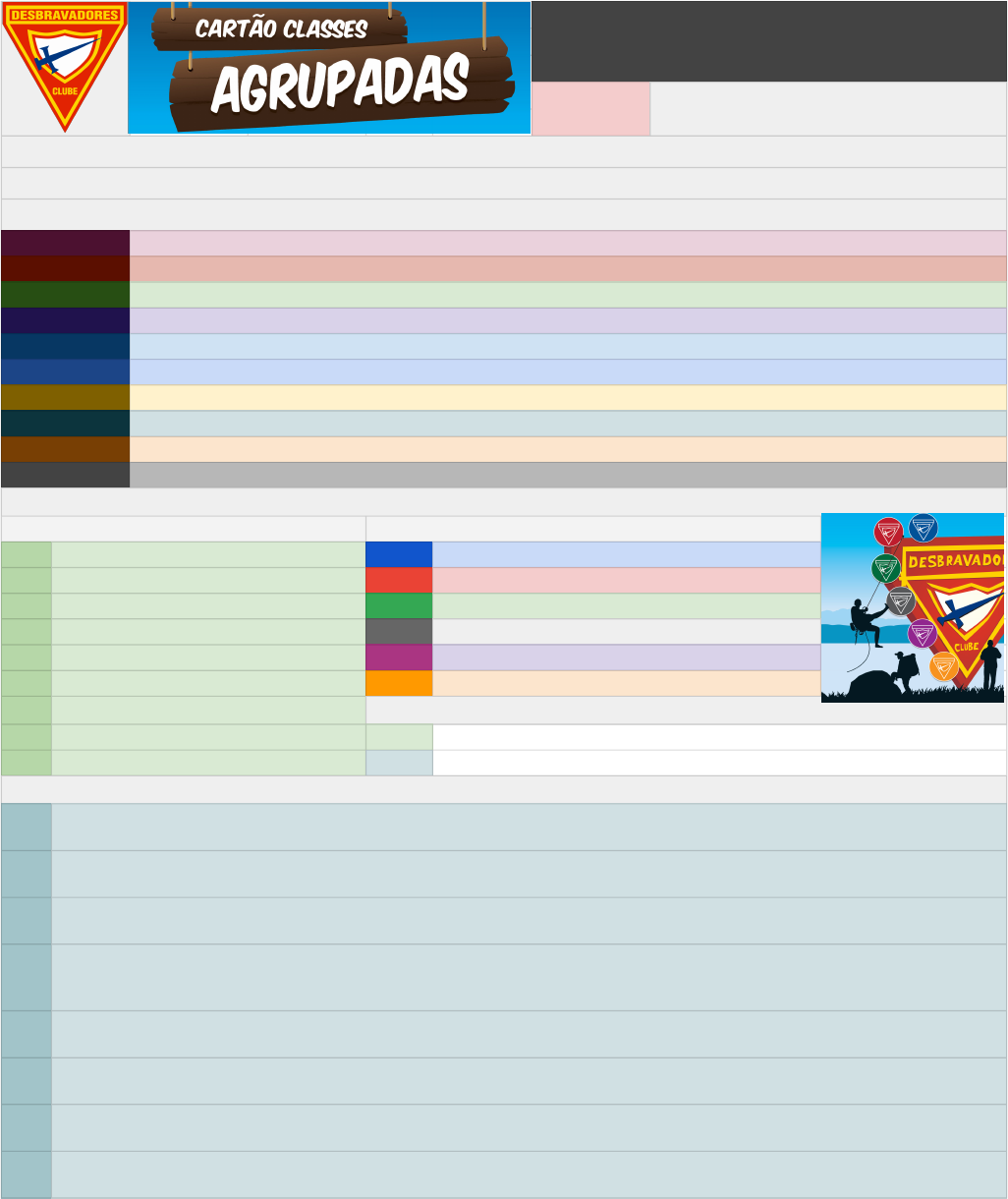 <p>Planilha de Controle de Requisitos</p><p>0.0%</p><p>Na coluna "OK" da lista de requisitos, marque "S" para</p><p>requisitos concluídos e "N" para requisitos pendentes. Assim a</p><p>porcentagem geral, e de cada categoria é atualizada.</p><p>Para usar esta planilha, você precisa fazer uma cópia dela para o seu Google Drive.</p><p>Quaisquer dúvidas, sugestões ou correções que você encontrar, pode mandar email para: henrique.asakura@yahoo.com</p><p>Os requisitos estão dividos em abas da planilha, nas seguintes categorias:</p><p>Livros Leitura e resumo de livros.</p><p>Bíblia Requisitos de leitura e interpretação bíblica.</p><p>Especialidades Especialidades obrigatórias para cumprir os requisitos das classes agrupadas.</p><p>Amigos Requisitos que envolvem convidar conhecidos ou amigos pra participar de programações da igreja ou do clube.</p><p>Externo Atividades práticas externas como caminhadas ou trilhas.</p><p>Comunidade Serviço social à comunidade, como cidade, bairro ou vizinhança.</p><p>Igreja Atividades colaborativas com departamentos, eventos ou atividades da igreja local.</p><p>Acampamento Requisitos que precisam ser cumpridas em acampamentos com o clube ou Unidade.</p><p>Clube Requisitos pra se fazer juntamente com a Unidade, instrutor ou líder, ou durante eventos, atividades e programações do clube.</p><p>Individual Estes são requisitos que você pode cumprir sozinho(a), em qualquer lugar e em qualquer hora.</p><p>Cada requisito possui um código que equivale à classe avançada ou ao grupo de classe regular, e o número do requisito:</p><p>Grupos das Classes Regulares: Classes Avançadas:</p><p>I Gerais AN Amigo da Natureza</p><p>II Descoberta Espiritual CE Companheiro de Excursionismo</p><p>III Servindo aos Outros PCB Pesquisador de Campo e Bosque</p><p>IV Desenvolvendo Amizade PNF Pioneiro de Novas Fronteiras</p><p>V Saúde e Aptidão Física EM Excursionista na Mata</p><p>VI Organização e Liderança GE Guia de Exploração</p><p>VII Estudo da Natureza Por exemplo:</p><p>VIII Arte de Acampar PNF-10 É o décimo requisito da classe avançada de Pioneiro</p><p>IX Estilo de Vida VIII-8 É o oitavo requisito do grupo "Arte de Acampar" das classes regulares</p><p>Algumas sugestões de planejamento: (claro que você faz do jeito que achar melhor)</p><p>1</p><p>Comece pelos livros. São uns 11 livros no total para serem lidos. Escolha o primeiro e já comece a ler um pouco todos os dias, e depois um</p><p>atrás do outro, fazendo o resumo de cada livro assim que terminar.</p><p>2</p><p>Praticamente toda a Bíblia será lida, então comece com um ano bíblico desde já, seguindo os versículos que constam na lista de requisitos.</p><p>A cada livro da Bíblia finalizado, verifique se há algum requisito da lista que requer a interpretação escrita de versículos que você leu.</p><p>3</p><p>No mínimo 42 especialidades serão adquiridas ao longo do cartão. Se quiser dividir o tempo entre elas de forma equilibrada e não deixar</p><p>tudo pro final, você pode se planejar a fazer uma especialidade em média a cada 2 semanas.</p><p>4</p><p>Acompanhe o calendário anual do seu clube e da sua igreja local, e veja quais requisitos você consegue cumprir nas programações e</p><p>eventos anuais das categorias Clube e Igreja. Marque na sua agenda as datas dos eventos, e o requisitos que serão cumpridos, e também</p><p>o que será necessário ser feito (relatório, fotos, material, etc).</p><p>5</p><p>No caso dos requisitos a serem feitos em grupo ou debates, verifique quais colegas de agrupadas ou desbravadores também não possuem</p><p>ainda o mesmo requisito. Você pode criar um grupo temporário pra fazerem juntos (whatsapp, etc).</p><p>6</p><p>Para os grupos Acampamento e Externo, verifique quando serão os próximos eventos, e já anote que tipo de material você precisa levar, e</p><p>quais relatórios, anotações, fotos ou vídeos você precisa fazer. Tenha tudo preparado antecipadamente pra levar pro evento.</p><p>7</p><p>Os requisitos dos grupos Comunidade e Amigos, você também vai precisar programar a sua agenda com outras pessoas ou órgãos, a</p><p>diferença é que não possuem datas tão limitadas durante o ano, então são mais fáceis de programar.</p><p>8</p><p>Por fim, a categoria Individual possui 64 requisitos. Pra não ficar tão pesado e nem deixar pra fazer de última hora, você pode cumprir um</p><p>requisito a cada em média uma semana e meia.</p><p>Livros 0.0% Leitura e resumo de livros.</p><p>Código OK Requisito</p><p>I-8 N</p><p>Ler o livro do Clube de Leitura do ano em curso e escrever um parágrafo sobre o que mais lhe chamou atenção ou considerou</p><p>mais importante.</p><p>I-9 N</p><p>Ler o livro do Clube de Leitura do ano em curso e escrever dois parágrafos sobre o que mais lhe chamou atenção ou considerou</p><p>importante.</p><p>I-10 N Ler o livro do Clube de Leitura do ano em curso e resumi-lo em uma página.</p><p>I-11 N Vaso de Barro</p><p>I-12 N Caminho a Cristo</p><p>I-13 N Além da Magia</p><p>I-14 N A História da Vida</p><p>I-15 N Nos Bastidores da Mídia</p><p>I-16 N Nossa Herança</p><p>II-29 N Ler e resumir três histórias de pioneiros adventistas. Contar essa história na reunião do Clube, no Culto JA ou na Escola Sabatina.</p><p>V-10 N</p><p>Completar uma das seguintes atividades:</p><p>a) Escrever uma poesia ou artigo sobre saúde para ser divulgado em uma revista, boletim ou jornal da igreja.</p><p>b) Individualmente ou em grupo, organizar e participar de uma corrida ou atividade similar e apresentar com antecedência um</p><p>programa de treinamento físico para esse evento.</p><p>c) Ler as páginas 102-125 do livro "Temperança", de Ellen G. White, e apresentar em uma página ou mais, 10 textos selecionados</p><p>da leitura.</p><p>d) Completar a especialidade de Nutrição ou liderar um grupo para a especialidade de Cultura Física.</p><p>VII-6 N</p><p>Ler o capítulo 7 do livro "O Desejado de 