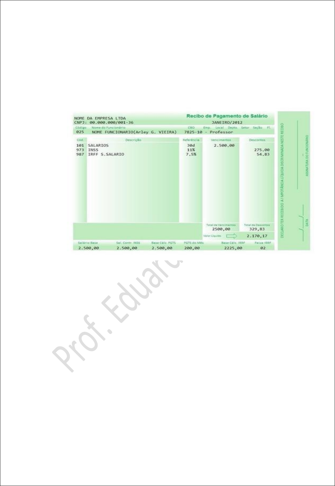 <p>Professor Eduardo Arcoverde</p><p>✉arcoverde.daltro@gmail.com</p><p>✆ 9 8067-3797</p><p>RELAÇÕES DE TRABALHO</p><p>1</p><p>Contracheque/Holerite</p><p>Contracheque ou Holerite é o documento que registra o salário de um</p><p>trabalhador. Ele serve como certificado de que a pessoa é realmente empregada</p><p>naquela empresa e, por vezes, como comprovante de renda – costuma ser pedido</p><p>por imobiliárias para quem deseja alugar um imóvel, por exemplo.</p><p>Para, além disso, o holerite é uma prestação de contas da empresa a seu</p><p>funcionário. Lá estão às informações combinadas no contrato, como o salário bruto e</p><p>os benefícios, e os descontos obrigatórios que a companhia realiza em seu nome.</p><p>Em geral, o contracheque ou holerite é disponibilizado todo mês com os rendimentos</p><p>e descontos desse período. A data em que ele fica disponível depende da empresa.</p><p>O documento indica os ganhos brutos de um funcionário, os descontos realizados e</p><p>o valor líquido que foi depositado no dia do pagamento.</p><p>Professor Eduardo Arcoverde</p><p>✉arcoverde.daltro@gmail.com</p><p>✆ 9 8067-3797</p><p>RELAÇÕES DE TRABALHO</p><p>2</p><p>No caso de empresas que pagam remunerações uma única vez no mês (no 5º dia</p><p>útil, por exemplo), o contracheque traz os dados consolidados do período.</p><p>No caso de empresas que dividem o pagamento salarial (com uma parte no dia 15 e</p><p>outra no dia 30, por exemplo), é possível que existam 2 contracheques, cada um</p><p>relacionado a uma data de pagamento.</p><p>Entre as informações que precisam constar no documento, estão:</p><p> As informações da empresa, como nome e CNPJ;</p><p> Dados do funcionário, como nome e informações bancárias;</p><p> Informações financeiras, como salário, horas extras e comissões;</p><p> Descontos, como adiantamento, recolhimento de Imposto de Renda e</p><p>contribuição ao INSS;</p><p> Descontos causados por faltas injustificadas.</p><p>Composição do Contracheque.</p><p>Estes são os campos que a maioria das pessoas encontra em seus holerites:</p><p>Cabeçalho do holerite</p><p> Dados da empresa costuma ser a primeira informação do holerite, no lado</p><p>esquerdo superior, com o nome e CNPJ da companhia.</p><p> Dados do funcionário logo em seguida vêm os dados pessoais. Deve</p><p>aparecer aqui o nome completo do trabalhador, seu código de registro na</p><p>empresa, cargo para o qual foi contratado e, se for o caso, informações da</p><p>conta para depósito.</p><p> Data no lado direito do cabeçalho está a data referente àquele pagamento.</p><p> Salário não é regra, mas, em alguns casos, este campo também está no</p><p>cabeçalho. Ele diz respeito ao salário bruto, ou seja, ainda sem nenhum</p><p>desconto.</p><p>Professor Eduardo Arcoverde</p><p>✉arcoverde.daltro@gmail.com</p><p>✆ 9 8067-3797</p><p>RELAÇÕES DE TRABALHO</p><p>3</p><p>Colunas do corpo do holerite</p><p> Códigos de referência o corpo do holerite é uma tabela e, portanto, se divide</p><p>em dois eixos. A primeira coluna da esquerda, que nem sempre vem</p><p>nomeada, apresenta pequenas sequências numéricas, normalmente de</p><p>quatro dígitos. São os códigos de referência, usados apenas pela empresa, e</p><p>servem para identificar cada item do holerite.</p><p> Descrição é a coluna que vem em seguida dos códigos de referência. Ali</p><p>estão discriminados cada um dos itens do holerite</p><p> Referência ou quantidade esta coluna contém os números sobre os quais</p><p>itens do holerite são baseados. Se você entrou em um emprego no dia 10 de</p><p>um mês e o recebimento acontece no dia 30, por exemplo, seu salário será</p><p>calculado com base na quantidade de dias trabalhados – neste caso, 20.</p><p> Vencimentos coluna que mostra o dinheiro que entra na remuneração. Aqui</p><p>aparecem, por exemplo, o salário base, horas extras, gratificações etc.</p><p> Descontos coluna destinada a valores que saem da remuneração, como</p><p>impostos e benefícios dedutíveis.</p><p>Linhas do corpo do holerite</p><p> Salário Base é o salário bruto (sem nenhum desconto), sobre o qual são</p><p>calculados os impostos. A não ser em casos de deduções por dias não</p><p>trabalhados, o valor que aparece nesta linha deve ser o combinado em</p><p>contrato.</p><p> Adiantamento algumas empresas remuneram seus funcionários mais de</p><p>uma vez ao mês. Se você recebe de 15 em 15 dias, a primeira parte do</p><p>salário entrará como adiantamento na parte de descontos.</p><p> Horas extras as horas extras são aquelas trabalhadas além da jornada</p><p>combinada e só vão para o holerite se o contrato de trabalho determinar que</p><p>elas sejam pagas – algumas empresas convertem em banco de horas e</p><p>remuneram o trabalhador com tempo de folga. A hora extra comum (cumprida</p><p>em dias de semana ou sábados) tem um acréscimo de 50% a mais da hora</p><p>Professor Eduardo Arcoverde</p><p>✉arcoverde.daltro@gmail.com</p><p>✆ 9 8067-3797</p><p>RELAÇÕES DE TRABALHO</p><p>4</p><p>comum; a hora extra realizada em domingos ou feriados vale o dobro da hora</p><p>comum.</p><p>Para uma jornada de 44 horas semanais, a base de cálculo é de 220 horas no</p><p>mês. Se a jornada for de 40 horas, a base será de 200 horas.</p><p>Cálculo da hora extra com acréscimo de 50%</p><p>Para calcular a hora extra trabalhada durante a semana ou aos sábados, multiplica-</p><p>se o valor do salário-hora por 1,5. No caso do trabalhador que tem um salário-hora</p><p>de R$ 8,95, fica assim:</p><p>Hora extra com 50% = R$ 8,95 x 1,5 = R$ 13,42</p><p>Para saber o acréscimo total no salário, basta multiplicar esse valor pelo</p><p>número de horas extras feitas no mês. Se o funcionário trabalhou 8 horas extras em</p><p>dias da semana, o cálculo fica:</p><p>Acréscimo no salário = 8 x R$ 13,42 = R$ 107,36</p><p>Cálculo da hora extra com acréscimo de 100%<