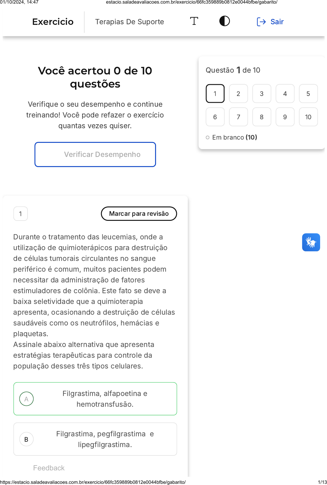 <p>Você acertou 0 de 10</p><p>questões</p><p>Verifique o seu desempenho e continue</p><p>treinando! Você pode refazer o exercício</p><p>quantas vezes quiser.</p><p>Verificar Desempenho</p><p>A</p><p>B</p><p>1 Marcar para revisão</p><p>Durante o tratamento das leucemias, onde a</p><p>utilização de quimioterápicos para destruição</p><p>de células tumorais circulantes no sangue</p><p>periférico é comum, muitos pacientes podem</p><p>necessitar da administração de fatores</p><p>estimuladores de colônia. Este fato se deve a</p><p>baixa seletividade que a quimioterapia</p><p>apresenta, ocasionando a destruição de células</p><p>saudáveis como os neutrófilos, hemácias e</p><p>plaquetas.</p><p>Assinale abaixo alternativa que apresenta</p><p>estratégias terapêuticas para controle da</p><p>população desses três tipos celulares.</p><p>Filgrastima, alfapoetina e</p><p>hemotransfusão.</p><p>Filgrastima, pegfilgrastima  e</p><p>lipegfilgrastima.</p><p>Questão 1 de 10</p><p>Em branco �10�</p><p>1 2 3 4 5</p><p>6 7 8 9 10</p><p>Feedback</p><p>Exercicio Terapias De Suporte Sair</p><p>01/10/2024, 14:47 estacio.saladeavaliacoes.com.br/exercicio/66fc359889b0812e0044bfbe/gabarito/</p><p>https://estacio.saladeavaliacoes.com.br/exercicio/66fc359889b0812e0044bfbe/gabarito/ 1/13</p><p>C</p><p>D</p><p>E</p><p>Pegfilgrastima, lipegfilgrastima e</p><p>romiplostim.</p><p>Romiplostim, eltrombopague e</p><p>hemotransfusão.</p><p>Romiplostim, alfapoetina e</p><p>alfadarbepoetina.</p><p>Questão não respondida</p><p>Opa! A alternativa correta é a letra</p><p>A. Confira o gabarito comentado!</p><p>Gabarito Comentado</p><p>Constituem o grupo dos estimulantes de</p><p>colônia de hemácias os agentes alfapoetina</p><p>e alfadarbepoetina. São estimulantes de</p><p>colônia para neutrófilos os agentes</p><p>filgrastima, pegfilgrastima  e</p><p>lipegfilgrastima. São agentes estimulantes</p><p>de colônia de plaquetas os agentes</p><p>romiplostim e eltrombopague, entretanto</p><p>sem indicação para tratamento associado à</p><p>quimioterapia.</p><p>2 Marcar para revisão</p><p>A evolução das práticas médicas e do</p><p>entendimento dos conceitos de saúde nos</p><p>mostrou ao longo dos anos que a saúde é</p><p>composta pelo bem-estar físico, mental, social</p><p>e espiritual. Atualmente, um paciente com</p><p>câncer busca inúmeros especialistas e</p><p>estratégias de tratamento tanto para o câncer</p><p>quanto para os sintomas que podem estar a ele</p><p>01/10/2024, 14:47 estacio.saladeavaliacoes.com.br/exercicio/66fc359889b0812e0044bfbe/gabarito/</p><p>https://estacio.saladeavaliacoes.com.br/exercicio/66fc359889b0812e0044bfbe/gabarito/ 2/13</p><p>A</p><p>B</p><p>C</p><p>D</p><p>E</p><p>associados. Sobre o tema, leia as assertivas</p><p>abaixo:</p><p>I � A utilização de técnicas da medicina</p><p>tradicional chinesa, como acupuntura, pode ser</p><p>aplicada em pacientes oncológicos visando a</p><p>minimização de efeitos adversos relacionados</p><p>ao tratamento.</p><p>Porque,</p><p>II � Práticas como aromaterapia, utilização de</p><p>ervas medicinais, meditação e outras</p><p>estratégias terapêuticas são denominadas</p><p>práticas integrativas e complementares. E como</p><p>o próprio nome diz, devem complementar os</p><p>tratamentos oncológicas e não substituí-los.</p><p>Marque a alternativa que apresenta a relação</p><p>correta entre as asserções I e II.</p><p>Ambas as asserções são verdadeiras,</p><p>e a asserção II é uma justificativa para</p><p>a asserção I.</p><p>Ambas as asserções são verdadeiras,</p><p>mas a asserção II não é uma</p><p>justificativa para a asserção I.</p><p>A asserção I é verdadeira e a asserção</p><p>II é falsa.</p><p>A asserção I é falsa e a asserção II é</p><p>verdadeira.</p><p>Ambas as asserções são falsas.</p><p>Questão não respondida</p><p>Opa! A alternativa correta é a letra</p><p>B. Confira o gabarito comentado!</p><p>01/10/2024, 14:47 estacio.saladeavaliacoes.com.br/exercicio/66fc359889b0812e0044bfbe/gabarito/</p><p>https://estacio.saladeavaliacoes.com.br/exercicio/66fc359889b0812e0044bfbe/gabarito/ 3/13</p><p>A</p><p>B</p><p>C</p><p>Gabarito Comentado</p><p>As práticas integrativas e complementares</p><p>são bem-vindas durante o tratamento</p><p>oncológico. Atualmente, sabemos que a</p><p>saúde e o bem-estar dos pacientes</p><p>oncológicos dependem de atenção em</p><p>muitos parâmetros, que podem ser</p><p>complementados por práticas como a</p><p>homeopatia, fitoterapia, medicina</p><p>tradicional chinesa e outras técnicas.</p><p>Entretanto, é preciso orientar o paciente</p><p>que essas práticas são complementares, e</p><p>não devem, sob nenhuma ótica, substituir</p><p>completamente o tratamento convencional.</p><p>3 Marcar para revisão</p><p>O bloqueio do plexo celíaco é um procedimento</p><p>invasivo que promove danos aos nervos</p><p>celíacos para que eles não sejam capazes de</p><p>transmitir mensagens de dor ao Sistema</p><p>nervoso central. Sua utilização é restrita ao</p><p>tratamento da dor abdominal em pacientes com</p><p>câncer pancreático. Esta modalidade de</p><p>tratamento da dor é considerada</p><p>Leve.</p><p>Moderada.</p><p>Intensa.</p><p>01/10/2024, 14:47 estacio.saladeavaliacoes.com.br/exercicio/66fc359889b0812e0044bfbe/gabarito/</p><p>https://estacio.saladeavaliacoes.com.br/exercicio/66fc359889b0812e0044bfbe/gabarito/ 4/13</p><p>D</p><p>E</p><p>Farmacológica.</p><p>Invasiva.</p><p>Questão não respondida</p><p>Opa! A alternativa correta é a letra</p><p>E. Confira o gabarito comentado!</p><p>Gabarito Comentado</p><p>No insucesso de terapias convencionais</p><p>contra a dor, é possível a realização de</p><p>tratamentos invasivos, como por exemplo o</p><p>bloqueio de plexos nervosos.</p><p>4 Marcar para revisão</p><p>O farmacêutico clínico tem papel de destaque</p><p>na prática oncológica. Dentro do escopo das</p><p>atividades d