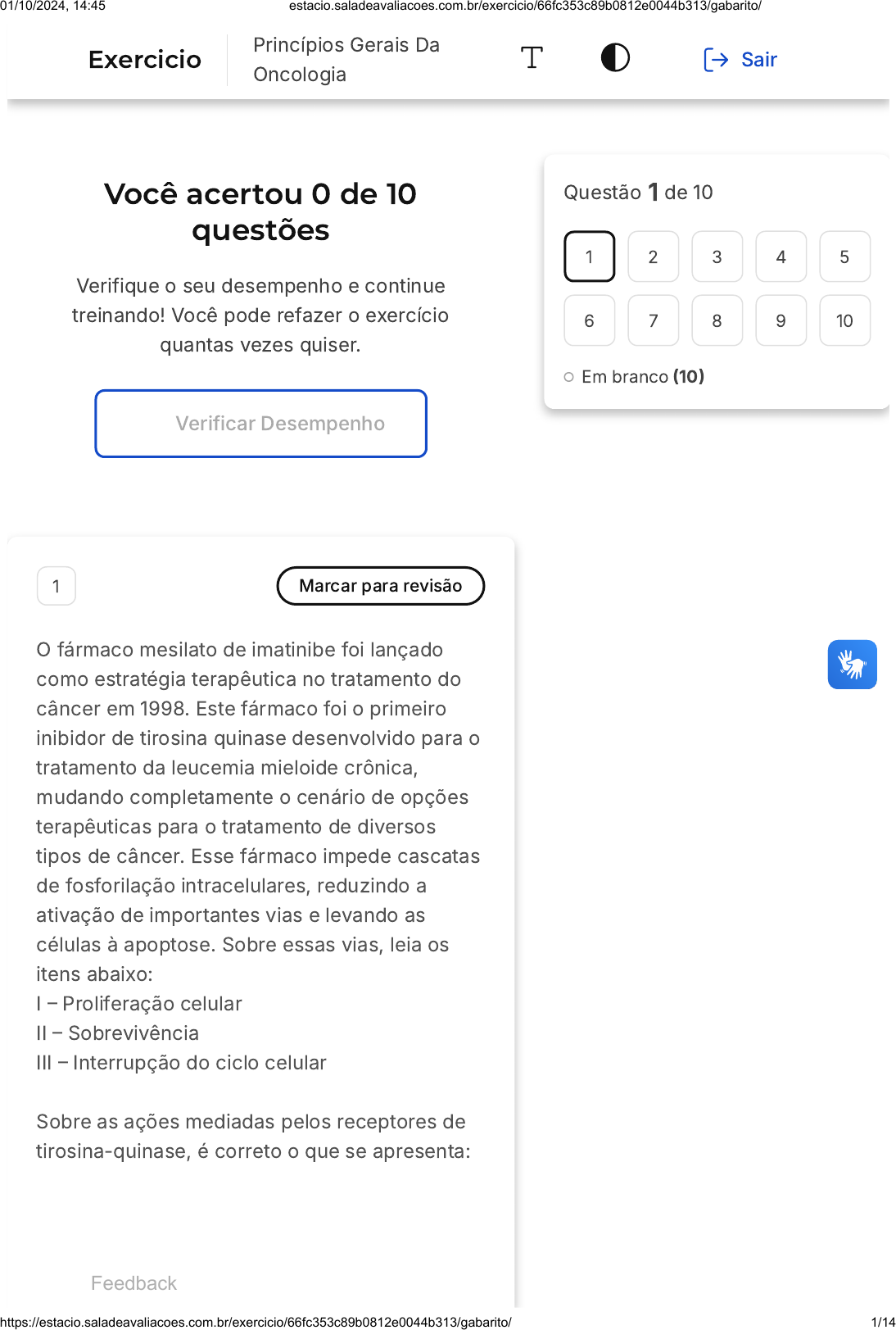 <p>Você acertou 0 de 10</p><p>questões</p><p>Verifique o seu desempenho e continue</p><p>treinando! Você pode refazer o exercício</p><p>quantas vezes quiser.</p><p>Verificar Desempenho</p><p>1 Marcar para revisão</p><p>O fármaco mesilato de imatinibe foi lançado</p><p>como estratégia terapêutica no tratamento do</p><p>câncer em 1998. Este fármaco foi o primeiro</p><p>inibidor de tirosina quinase desenvolvido para o</p><p>tratamento da leucemia mieloide crônica,</p><p>mudando completamente o cenário de opções</p><p>terapêuticas para o tratamento de diversos</p><p>tipos de câncer. Esse fármaco impede cascatas</p><p>de fosforilação intracelulares, reduzindo a</p><p>ativação de importantes vias e levando as</p><p>células à apoptose. Sobre essas vias, leia os</p><p>itens abaixo:</p><p>I � Proliferação celular</p><p>II � Sobrevivência</p><p>III � Interrupção do ciclo celular</p><p>Sobre as ações mediadas pelos receptores de</p><p>tirosina-quinase, é correto o que se apresenta:</p><p>Questão 1 de 10</p><p>Em branco �10�</p><p>1 2 3 4 5</p><p>6 7 8 9 10</p><p>Feedback</p><p>Exercicio</p><p>Princípios Gerais Da</p><p>Oncologia</p><p>Sair</p><p>01/10/2024, 14:45 estacio.saladeavaliacoes.com.br/exercicio/66fc353c89b0812e0044b313/gabarito/</p><p>https://estacio.saladeavaliacoes.com.br/exercicio/66fc353c89b0812e0044b313/gabarito/ 1/14</p><p>A</p><p>B</p><p>C</p><p>D</p><p>E</p><p>Nos itens I e II, apenas.</p><p>Nos itens II e III, apenas.</p><p>Apenas no item I, apenas.</p><p>Apenas no item II, apenas.</p><p>Apenas no item II, apenas.</p><p>Questão não respondida</p><p>Opa! A alternativa correta é a letra</p><p>A. Confira o gabarito comentado!</p><p>Gabarito Comentado</p><p>Os receptores de tirosina-quinase quando</p><p>estimulados levam as células tumorais ao</p><p>crescimento, com estímulo à proliferação,</p><p>sobrevivência e progressão do ciclo</p><p>celular. Com isso, o item III está incorreto.</p><p>2 Marcar para revisão</p><p>O receptor do fator de crescimento epidérmico</p><p>�EGFR) é um domínio de membrana plasmática</p><p>que quando estimulado por fatores de</p><p>crescimento promove o estímulo de</p><p>diferenciação e proliferação celular. Na</p><p>literatura já são encontradas muitas evidências</p><p>da atuação desses receptores no</p><p>desenvolvimento de tumores, especialmente</p><p>nas mutações dos genes que codificam esse</p><p>01/10/2024, 14:45 estacio.saladeavaliacoes.com.br/exercicio/66fc353c89b0812e0044b313/gabarito/</p><p>https://estacio.saladeavaliacoes.com.br/exercicio/66fc353c89b0812e0044b313/gabarito/ 2/14</p><p>A</p><p>B</p><p>C</p><p>D</p><p>E</p><p>domínio e levam aos receptores de EGFR</p><p>mutados. O tipo de tratamento que leva em</p><p>consideração a expressão de alvos específicos</p><p>de células tumorais é chamado de:</p><p>Radioterapia.</p><p>Quimioterapia.</p><p>Terapia Alvo.</p><p>Fitoterapia.</p><p>Hemoterapia.</p><p>Questão não respondida</p><p>Opa! A alternativa correta é a letra</p><p>C. Confira o gabarito comentado!</p><p>Gabarito Comentado</p><p>A terapia alvo representa uma das</p><p>modalidades de tratamento mais modernas</p><p>contra o câncer. Sua ação é pautada nos</p><p>achados moleculares que definem alvos</p><p>específicos de células tumorais, ou alvos</p><p>que sejam mais expressos nesses tipos</p><p>celulares, com uma tendencia de poupar as</p><p>células sadias ou minimizar os efeitos dos</p><p>tratamentos sobre elas. As demais</p><p>alternativas apresentam abordagens</p><p>menos seletivas.</p><p>01/10/2024, 14:45 estacio.saladeavaliacoes.com.br/exercicio/66fc353c89b0812e0044b313/gabarito/</p><p>https://estacio.saladeavaliacoes.com.br/exercicio/66fc353c89b0812e0044b313/gabarito/ 3/14</p><p>A</p><p>B</p><p>C</p><p>D</p><p>E</p><p>3 Marcar para revisão</p><p>A compreensão dos aspectos moleculares das</p><p>células tumorais é indispensável para</p><p>elaboração de novas alternativas terapêuticas.</p><p>Uma técnica importante que vem ganhando</p><p>destaque no cenário global é um modelo de</p><p>interferência que promove o silenciamento</p><p>genético da expressão de proteínas</p><p>oncogênicas. Esta técnica promete veicular</p><p>pequenos fragmentos de material genético em</p><p>nanopartículas endereçadas aos tumores para</p><p>promover alterações nessas células reduzindo</p><p>a proliferação tumoral. Assinale abaixo a</p><p>alternativa que contêm o nome deste pequeno</p><p>fragmento:</p><p>Genoma.</p><p>Cdna.</p><p>DNA.</p><p>mRNA.</p><p>siRNA.</p><p>Questão não respondida</p><p>Opa! A alternativa correta é a letra</p><p>E. Confira o gabarito comentado!</p><p>Gabarito Comentado</p><p>Os siRNA ou pequenos RNAs de</p><p>interferência, são fragmentos de RNA</p><p>01/10/2024, 14:45 estacio.saladeavaliacoes.com.br/exercicio/66fc353c89b0812e0044b313/gabarito/</p><p>https://estacio.saladeavaliacoes.com.br/exercicio/66fc353c89b0812e0044b313/gabarito/ 4/14</p><p>A</p><p>B</p><p>C</p><p>D</p><p>E</p><p>responsáveis por destruir moléculas de</p><p>RNA mensageiro evitando assim que estes</p><p>sejam traduzidos em proteínas. Esta</p><p>técnica pode ser útil na redução de</p><p>tumores ao inibir a formação de proteínas</p><p>oncogênicas. Os demais itens apresentam</p><p>o material genético como um todo, ou</p><p>outras moléculas deste com outras</p><p>funções.</p><p>4 Marcar para revisão</p><p>A mama feminina pode apresentar uma</p><p>condição patológica rara chamada adenoma do</p><p>mamilo, que acomete os ductos lactíferos,</p><p>podendo inclusive ser confundida clinicamente</p><p>com o carcinoma intraductal de mama. Para</p><p>sanar essa dúvida, os exames de imagem e os</p><p>achados histopatológicos confirmam tratar-se</p><p>de um tumor benigno. Assinale abaixo a</p><p>alternativa que apresenta características de</p><p>tumores benignos:</p><p>Intensa atividade mitótica.</p><p>Infiltração de outros tecidos.</p><p>Habi