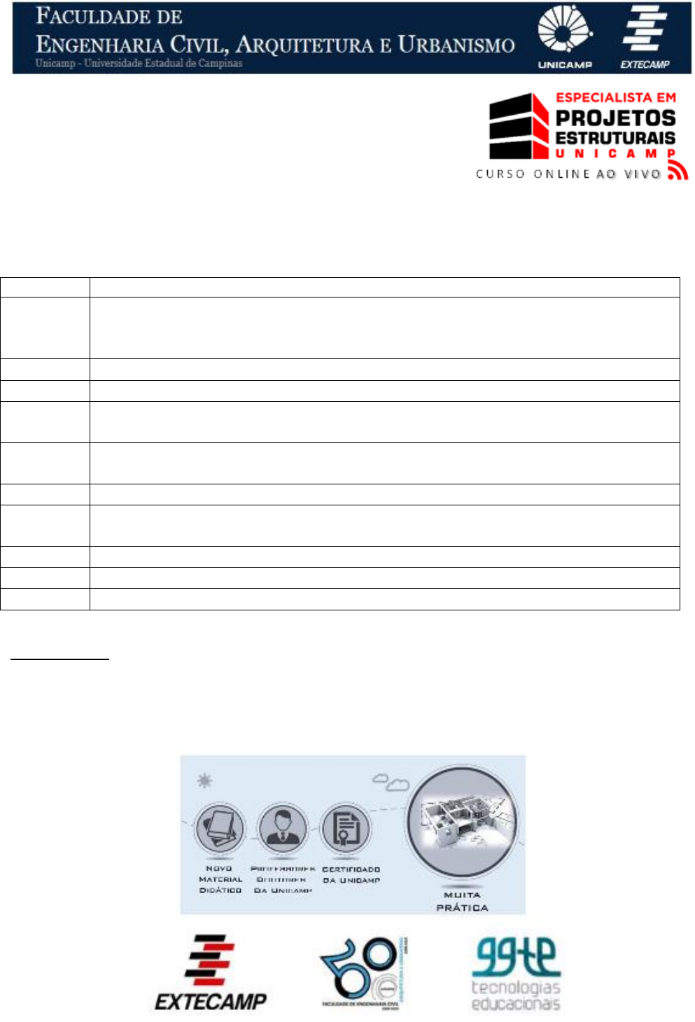<p>FEC0175</p><p>Projeto de elementos especiais de concreto armado para</p><p>Fundação - blocos e sapatas.</p><p>Prof. Dr. Luiz Carlos de Almeida</p><p>Prof. Dr. Leandro Mouta Trautwein</p><p>Prof. MSc. Ricardo de Paula Randi</p><p>1º bimestre de 2024 - Segundas-feiras das 19 às 22 horas</p><p>Aula Assunto</p><p>19/02/2024</p><p>Apresentação do Curso. Critério de Avaliação. Bibliografia.</p><p>Apresentação dos principais aspectos das fundações. Método das bielas aplicado</p><p>ao cálculo dos blocos de Fundação. Dimensionamento de blocos sobre 2 estacas.</p><p>26/02/2024 Prof. Dr. Paulo José Rocha de Albuquerque. Aula Geotecnia (Parte 1).</p><p>04/03/2024 Prof. Dr. Paulo José Rocha de Albuquerque. Aula Geotecnia (Parte 2).</p><p>11/03/2024</p><p>Exemplo: Cálculo e detalhamento de blocos sobre 2 estacas.</p><p>Dimensionamento de blocos sobre 3 e 4 estacas.</p><p>18/03/2024</p><p>Dimensionamento de blocos sobre 2 e 4 estacas com momento fletor.</p><p>Exemplo: Cálculo e detalhamento de Blocos sobre quatro estacas com momento.</p><p>25/03/2024 Cálculo e detalhamento de blocos com estacas tracionadas.</p><p>01/04/2024</p><p>Principais aspectos das Fundações Diretas.</p><p>Cálculo e detalhamento da Armadura de Flexão das Sapatas Rígidas.</p><p>08/04/2024 Cálculo e detalhamento de Sapatas com momento Fletor em uma direção.</p><p>15/04/2024 Cálculo e detalhamento de Sapatas com momento Fletor em duas direções.</p><p>22/04/2024 Fundações de divisas e viga alavanca.</p><p>Metodologia</p><p>As aulas serão online na plataforma Zoom com gravação e posterior disponibilização na plataforma Moodle,</p><p>juntamente com todo material do curso. Para cada aula haverá um plantão de dúvidas online. Implementação</p><p>de Chat para comunicação específica.</p>