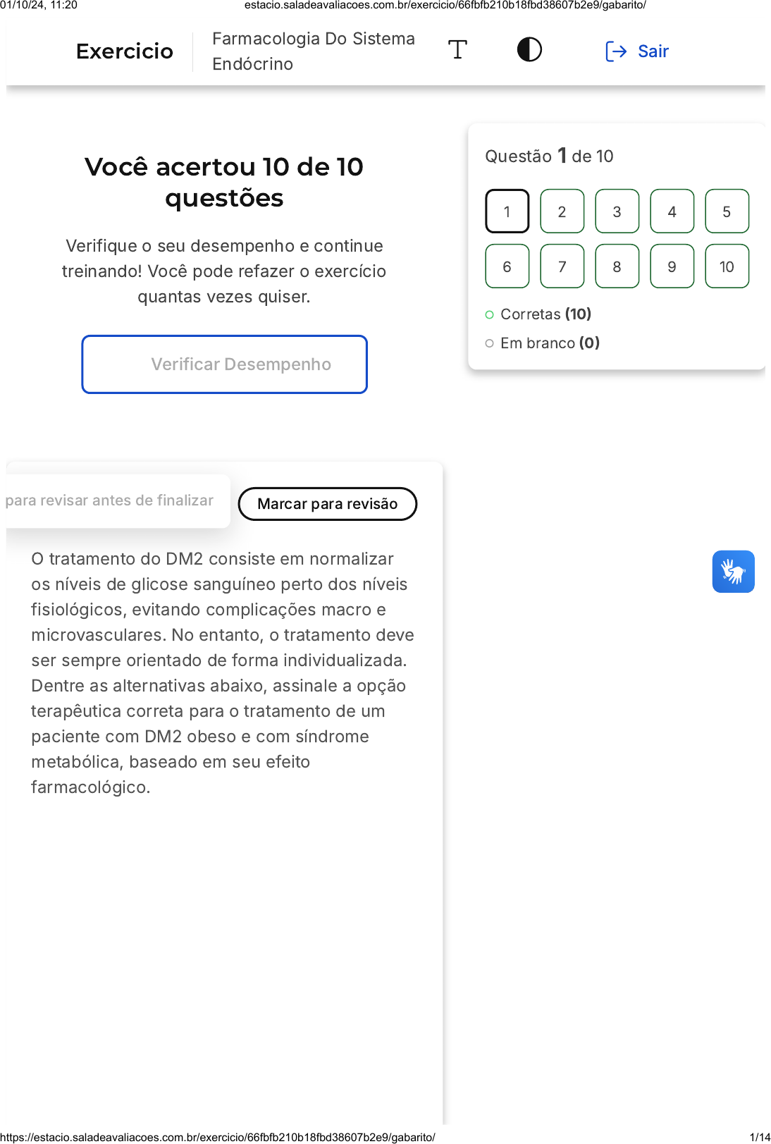 <p>Você acertou 10 de 10</p><p>questões</p><p>Verifique o seu desempenho e continue</p><p>treinando! Você pode refazer o exercício</p><p>quantas vezes quiser.</p><p>Verificar Desempenho</p><p>1 Marcar para revisãopara revisar antes de finalizar</p><p>O tratamento do DM2 consiste em normalizar</p><p>os níveis de glicose sanguíneo perto dos níveis</p><p>fisiológicos, evitando complicações macro e</p><p>microvasculares. No entanto, o tratamento deve</p><p>ser sempre orientado de forma individualizada.</p><p>Dentre as alternativas abaixo, assinale a opção</p><p>terapêutica correta para o tratamento de um</p><p>paciente com DM2 obeso e com síndrome</p><p>metabólica, baseado em seu efeito</p><p>farmacológico.</p><p>Questão 1 de 10</p><p>Corretas �10�</p><p>Em branco �0�</p><p>1 2 3 4 5</p><p>6 7 8 9 10</p><p>Exercicio</p><p>Farmacologia Do Sistema</p><p>Endócrino</p><p>Sair</p><p>01/10/24, 11:20 estacio.saladeavaliacoes.com.br/exercicio/66fbfb210b18fbd38607b2e9/gabarito/</p><p>https://estacio.saladeavaliacoes.com.br/exercicio/66fbfb210b18fbd38607b2e9/gabarito/ 1/14</p><p>A</p><p>B</p><p>C</p><p>D</p><p>E</p><p>A Repaglinida, pois reduz a absorção</p><p>de carboidratos no trato</p><p>gastrointestinal e reduz o</p><p>esvaziamento gástrico, auxiliando na</p><p>restrição calórica.</p><p>A Metformina, pois causa glicosúria</p><p>associada a perda hídrica auxiliando</p><p>na redução da pressão arterial e perda</p><p>ponderal.</p><p>A Exenatida, pois reduz o</p><p>esvaziamento gástrico, reduz o</p><p>apetite, e auxilia a perda de peso.</p><p>A Pioglitazona, pois aumenta a perda</p><p>hídrica e causa perda de peso.</p><p>A Dapagliflozina, pois causa aumento</p><p>da secreção de insulina associada a</p><p>perda de apetite.</p><p>Resposta correta</p><p>Parabéns, você selecionou a</p><p>alternativa correta. Confira o</p><p>gabarito comentado!</p><p>Gabarito Comentado</p><p>A alternativa correta é a Exenatida. Este</p><p>medicamento é eficaz no tratamento de</p><p>pacientes com DM2 obesos e com</p><p>síndrome metabólica, pois atua reduzindo o</p><p>esvaziamento gástrico, diminuindo o</p><p>apetite e auxiliando na perda de peso.</p><p>Essas ações conjuntas contribuem para a</p><p>normalização dos níveis de glicose no</p><p>sangue, evitando complicações macro e</p><p>01/10/24, 11:20 estacio.saladeavaliacoes.com.br/exercicio/66fbfb210b18fbd38607b2e9/gabarito/</p><p>https://estacio.saladeavaliacoes.com.br/exercicio/66fbfb210b18fbd38607b2e9/gabarito/ 2/14</p><p>A</p><p>B</p><p>C</p><p>D</p><p>E</p><p>microvasculares, que são objetivos</p><p>primordiais no tratamento do DM2.</p><p>2 Marcar para revisão</p><p>Qual é o termo utilizado para descrever a</p><p>condição resultante da produção inadequada</p><p>dos hormônios tireoidianos, caracterizada por</p><p>sintomas como bradicardia, fala arrastada,</p><p>letargia e baixa resistência ao frio?</p><p>Hipertireoidismo</p><p>Mixedema</p><p>Cretinismo</p><p>Taquicardia</p><p>Hipotiroidismo</p><p>Resposta correta</p><p>Parabéns, você selecionou a</p><p>alternativa correta. Confira o</p><p>gabarito comentado!</p><p>Gabarito Comentado</p><p>A condição descrita, que inclui sintomas</p><p>como bradicardia, fala arrastada, letargia e</p><p>baixa resistência ao frio, é associada ao</p><p>hipotiroidismo. As opções</p><p>"Hipertireoidismo", "Taquicardia" e</p><p>01/10/24, 11:20 estacio.saladeavaliacoes.com.br/exercicio/66fbfb210b18fbd38607b2e9/gabarito/</p><p>https://estacio.saladeavaliacoes.com.br/exercicio/66fbfb210b18fbd38607b2e9/gabarito/ 3/14</p><p>A</p><p>B</p><p>C</p><p>D</p><p>E</p><p>"Cretinismo" não se alinham com os</p><p>sintomas mencionados. O "Mixedema" é</p><p>mencionado no texto, mas não é a</p><p>condição que descreve os sintomas</p><p>apresentados.</p><p>3 Marcar para revisão</p><p>Qual é o principal objetivo do tratamento com</p><p>hormônios tireoidianos (liotironina e</p><p>levotiroxina) em pacientes com hipotireoidismo</p><p>ou hipotireoidismo autoimune (tireoidite de</p><p>Hashimoto)?</p><p>Estimular a síntese excessiva de</p><p>hormônios tireoidianos</p><p>Prevenir o acúmulo de iodo-131 no</p><p>fígado</p><p>Reduzir a absorção de hormônios</p><p>tireoidianos pelo fígado</p><p>Induzir a liberação excessiva de</p><p>hormônios tireoidianos</p><p>Repor os hormônios tireoidianos</p><p>deficientes</p><p>Resposta correta</p><p>Parabéns, você selecionou a</p><p>alternativa correta. Confira o</p><p>gabarito comentado!</p><p>01/10/24, 11:20 estacio.saladeavaliacoes.com.br/exercicio/66fbfb210b18fbd38607b2e9/gabarito/</p><p>https://estacio.saladeavaliacoes.com.br/exercicio/66fbfb210b18fbd38607b2e9/gabarito/ 4/14</p><p>A</p><p>B</p><p>C</p><p>Gabarito Comentado</p><p>O principal objetivo do tratamento com</p><p>hormônios tireoidianos em pacientes com</p><p>hipotireoidismo ou hipotireoidismo</p><p>autoimune é repor os hormônios</p><p>tireoidianos que estão deficientes no</p><p>organismo. Esses hormônios, liotironina</p><p>�T3) e levotiroxina �T4�, são administrados</p><p>oralmente para restabelecer os níveis</p><p>adequados de hormônios tireoidianos no</p><p>corpo.</p><p>4 Marcar para revisão</p><p>O diabetes é uma condição metabólica crônica</p><p>que afeta a maneira como o corpo regula os</p><p>níveis de açúcar no sangue. Existem diferentes</p><p>tipos de diabetes, sendo os mais comuns o</p><p>diabetes tipo 1 �DM1) e o diabetes tipo 2 �DM2�.</p><p>Qual é a principal diferença entre o diabetes</p><p>tipo 1 �DM1) e o diabetes tipo 2 �DM2�?</p><p>O DM1 é mais comum em idosos,</p><p>enquanto o DM2 é mais comum em</p><p>crianças e adolescentes.</p><p>O DM1 é causado por fatores</p><p>genéticos, enquanto o DM2 é causado</p><p>pela destruição autoimune das células</p><p>β.</p><p>O DM1 apresenta resistência à insulina</p><p>nos tecidos periféricos, enquanto o</p><p>DM2 apresenta deficiência absoluta</p><p>de insulina.</p><p>01/10/