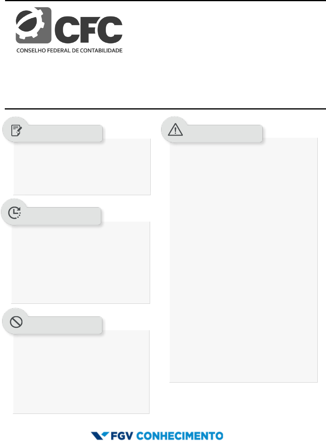 <p>EXAME DE SUFICIÊNCIA</p><p>EDITAL Nº 01/2024</p><p>REAPLICAÇÃO RIO GRANDE DO SUL</p><p>PROVA OBJETIVA</p><p>TIPO 1 – BRANCA</p><p>• Além deste caderno contendo 50 (cinquenta)</p><p>questões objetivas, você receberá do fiscal de prova</p><p>o cartão de respostas;</p><p>• As questões objetivas têm 4 (quatro) opções de</p><p>resposta (A, B, C e D) e somente uma delas está</p><p>correta.</p><p>•</p><p>• Verifique se seu caderno de questões está completo,</p><p>sem repetição de questões ou falhas. Caso contrário,</p><p>notifique imediatamente o fiscal da sala, para que sejam</p><p>tomadas as devidas providências;</p><p>• Confira seus dados pessoais, especialmente nome,</p><p>número de inscrição e documento de identidade e leia</p><p>atentamente as instruções para preencher o cartão de</p><p>respostas;</p><p>• Para o preenchimento do cartão de respostas, use</p><p>somente caneta esferográfica, fabricada em material</p><p>transparente, com tinta preta ou azul;</p><p>• Assine seu nome apenas no(s) espaço(s) reservado(s) no</p><p>cartão de respostas;</p><p>• Confira seu cargo, cor e tipo do caderno de questões.</p><p>Caso tenha recebido caderno de cargo ou cor ou tipo</p><p>diferente do impresso em seu cartão de respostas, o</p><p>fiscal deve ser obrigatoriamente informado para o</p><p>devido registro na ata da sala;</p><p>• Reserve tempo suficiente para o preenchimento do seu</p><p>cartão de respostas. O preenchimento é de sua</p><p>responsabilidade e não será permitida a troca do cartão</p><p>de respostas em caso de erro cometido pelo candidato;</p><p>• Para fins de avaliação, serão levadas em consideração</p><p>apenas as marcações realizadas no cartão de respostas;</p><p>• A FGV coletará as impressões digitais dos candidatos na</p><p>lista de presença;</p><p>• Os candidatos serão submetidos ao sistema de detecção</p><p>de metais quando do ingresso e da saída de sanitários</p><p>durante a realização das provas.</p><p>• Boa sorte!</p><p>• Você dispõe de 4 (quatro) horas para a realização da</p><p>prova, já incluído o tempo para a marcação do cartão</p><p>de respostas;</p><p>• 1 (uma) hora e 30 (trinta) minutos após o início da</p><p>prova, é possível retirar-se da sala, sem levar o</p><p>caderno de questões;</p><p>• A partir dos 30 (trinta) minutos anteriores ao</p><p>término da prova é possível retirar-se da sala</p><p>levando o caderno de questões.</p><p>• Qualquer tipo de comunicação entre os candidatos</p><p>durante a aplicação da prova;</p><p>• Anotar informações relativas às respostas em</p><p>qualquer outro meio que não seja o caderno de</p><p>questões;</p><p>• Levantar da cadeira sem autorização do fiscal de</p><p>sala;</p><p>• Usar o sanitário ao término da prova, após deixar a</p><p>sala.</p><p>SUA PROVA</p><p>TEMPO</p><p>NÃO SERÁ PERMITIDO</p><p>INFORMAÇÕES GERAIS</p><p>CONSELHO FEDERAL DE CONTABILIDADE - CFC FGV CONHECIMENTO</p><p>CONTADOR – MANHÃ TIPO BRANCA – PÁGINA 2</p><p>1</p><p>Quando escrevemos, devemos procurar ser claros e uma das maneiras de conseguir clareza é produzir frases na ordem direta,</p><p>ou seja, sujeito + verbo + complementos + adjuntos.</p><p>Assinale a frase em que isso foi feito.</p><p>(A) Reservaremos nossas passagens para depois de amanhã.</p><p>(B) As passeatas, quando repletas, indicam algum anseio popular.</p><p>(C) No final do mês compraremos novos móveis para a sala.</p><p>(D) Os turistas, apesar da insegurança, gostam da cidade.</p><p>2</p><p>Assinale o pensamento que mostra oposição de termos.</p><p>(A) As pessoas a quem servimos de apoio é que nos dão firmeza na vida.</p><p>(B) Podemos pretender ser o que queiramos; mas não é lícito fingir que somos o que não somos.</p><p>(C) Somos criaturas tão instáveis que acabamos vivendo os sentimentos que fingimos.</p><p>(D) A flor não nasceu para decorar uma casa, embora o morador pense o contrário.</p><p>3</p><p>Em relação a fundamentos de matemática financeira, avalie as afirmativas a seguir.</p><p>I. O conceito de taxas proporcionais está interligado ao regime de juros compostos, ao passo que o conceito de taxas</p><p>equivalentes está interligado ao regime de juros simples.</p><p>II. Se a inflação do período analisado foi menor que zero, então a taxa real será maior que a taxa nominal.</p><p>III. Em uma mesma aplicação, se o período de capitalização for menor que uma unidade, o montante no regime de juros</p><p>simples será maior que o montante no regime de juros compostos.</p><p>Está correto o que se afirma em</p><p>(A) I, apenas.</p><p>(B) II e III, apenas.</p><p>(C) I e II, apenas.</p><p>(D) I, II e III.</p><p>4</p><p>Em relação a conceitos básicos de estatística, avalie se as afirmativas a seguir são falsas (F) ou verdadeiras (V).</p><p>I. A moda é uma medida de tendência central que apresenta a possibilidade de ser aplicada às variáveis qualitativas.</p><p>II. São exemplos de medida de dispersão a variância e o desvio-padrão, sendo a variância obtida pela raiz quadrada do desvio-</p><p>padrão.</p><p>III. A média apresenta, em relação à mediana, a vantagem de não sofrer influência de valores extremos (outliers).</p><p>IV. Se uma variável é representada por números, ela será, necessariamente, uma variável quantitativa.</p><p>As afirmativas são, respectivamente,</p><p>(A) F – F – V – V.</p><p>(B) F – V – F – V.</p><p>(C) V – F – V – F.</p><p>(D) V – F – F – F.</p><p>5</p><p>João recebeu comunicação da associação de moradores do Bairro Alfa informando que ele se encontrava em débito com as</p><p>respectivas mensalidades desde a criação da associação, o que ocorrera dois anos antes. Ao comparecer perante a associação,</p><p>João informou que jamais se associara, logo, não poderia ter débitos pendentes. Foi-lhe informado, no entanto, que isto era</p><p>irrelevante, j