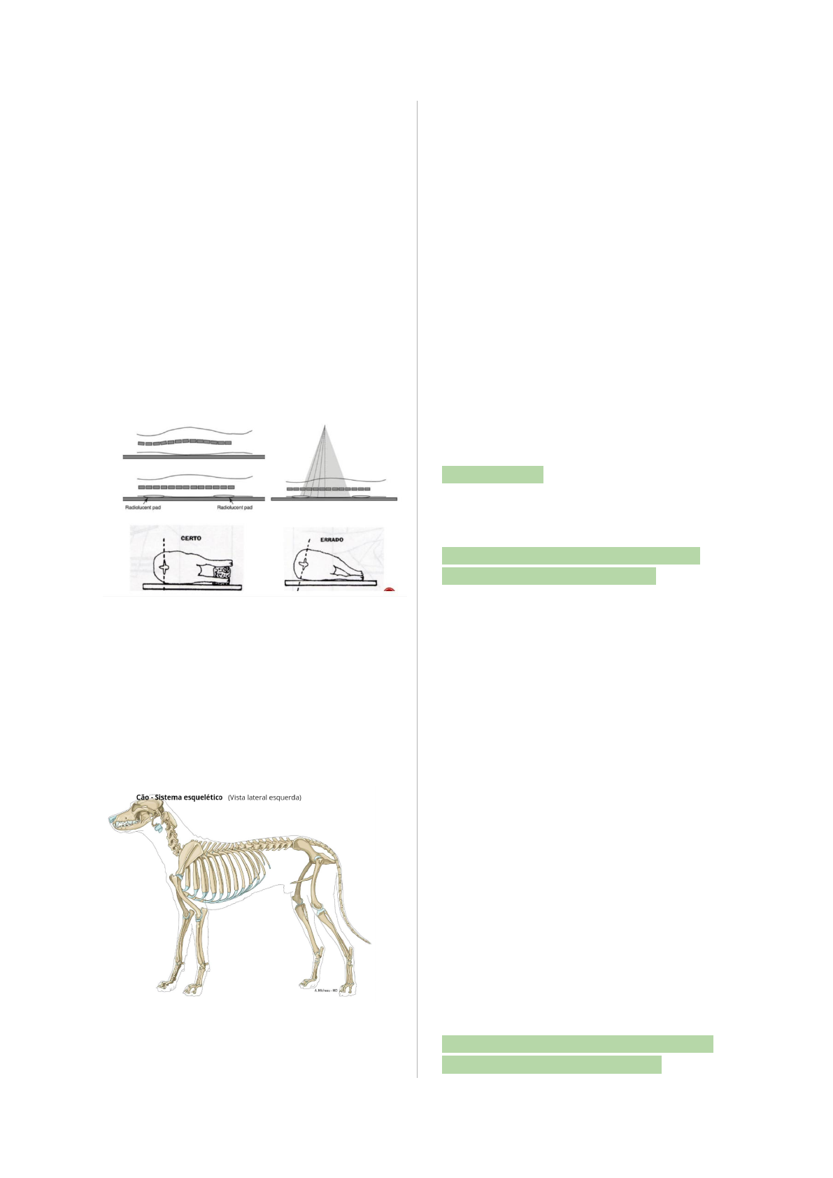 <p>Coluna</p><p>vertebral</p><p>Importante</p><p>Avaliar os espaços vertebrais e a</p><p>mineralização dos discos vertebrais.</p><p>Posicionamento</p><p>Anatomia</p><p>Mamíferos: 7 vértebras cervicais</p><p>Cão, gato e bovino: 13 vértebras torácicas</p><p>Equino: 18 vértebras torácicas</p><p>Medula</p><p>A medula espinhal transmite sinais do</p><p>cérebro para o corpo, como instruções</p><p>para movimentar os membros. Também</p><p>transmite sinais do corpo para o cérebro,</p><p>como informações sobre o que está</p><p>sendo tocado ou onde dói.</p><p>Quando há compressão da medula</p><p>espinhal essa comunicação pode ser</p><p>comprometida. Dependendo do ponto</p><p>afetado, pode causar, por exemplo,</p><p>paralisia dos membros.</p><p>Hérnia de disco</p><p>O disco vertebral tem função de</p><p>amortecimento. A absorção do impacto</p><p>depende de um núcleo hidratado</p><p>deformável e de um ânulo elástico intacto.</p><p>A cartilagem do disco pode fazer uma</p><p>compressão da medula/nervos.</p><p>● Hérnia de disco extrusa (Hansen</p><p>tipo I): É considerada mais grave</p><p>do que a protusa, pois o material</p><p>do disco pode causar compressão</p><p>significativa dos nervos. A parte</p><p>externa e fibrosa do disco se fende</p><p>e permite que o núcleo vaze para</p><p>fora.</p><p>● Hérnia de disco protusa (Hansen</p><p>tipo II): É considerada menos</p><p>grave do que a extrusa, pois o</p><p>material do disco ainda está</p><p>contido pelo anel fibroso. A base</p><p>do disco fica mais larga e com</p><p>mais volume, tocando em áreas</p><p>sensíveis aos nervos. A dor é</p><p>geralmente mais aguda e intensa,</p><p>devido à pressão direta sobre os</p><p>nervos.</p><p>O esperado é ver diminuição do espaço</p><p>intervertebral. > Não é certeza!!!</p><p>Síndrome da cauda equina</p><p>A Síndrome da Cauda Equina é um</p><p>conjunto de sinais neurológicos causados</p><p>pela compressão de raízes nervosas que</p><p>correm pelo canal espinhal lombossacral.</p><p>Sua origem pode ser congênita ou</p><p>adquirida, sendo as principais causas a</p><p>má formação congênita do canal</p><p>vertebral, protrusões de disco</p><p>intervertebral, espondilose, fraturas e</p><p>luxações vertebrais, discoespondilite e</p><p>neoplasias de vértebras.</p><p>Predisposição em cães de grande porte</p><p>(ex: Pastor Alemão), machos. Raro em</p><p>gatos.</p><p>Causas diagnosticadas no raio x:</p><p>- Hérnia lombossacra - diminuição</p><p>do espaço intervertebral</p><p>lombossacro</p><p>- Massa comprimindo a cauda</p><p>equina</p><p>- Mineralização do disco</p><p>- Desalinhamento entre L7 e S1 -</p><p>pode ser observado em</p><p>radiografias dinâmicas.</p><p>*É importante o posicionamento correto</p><p>para um resultado bom</p><p>Alterações congênitas</p><p>- Vértebras transicionais</p><p>- Hemivértebra</p><p>- Vértebras-borboleta</p><p>- Vértebras em bloco</p><p>Muitas anomalias congênitas são</p><p>hereditárias e são frequentemente</p><p>encontradas em raças braquicefálicas</p><p>(Pugs, Bulldogs) mas podem ocorrer</p><p>espontaneamente em qualquer animal.</p><p>Alterações no Número de Vértebras</p><p>Alteração mais comum de observar-se, na</p><p>presença de vértebras transicionais.</p><p>Ocorrem mais frequentemente nas</p><p>regiões toracolombar e lombossacral.</p><p>Como exemplo, temos a última vértebra</p><p>torácica apresentando um processo</p><p>transverso em vez de uma costela (Fig.</p><p>11-1, A) ou a última vértebra lombar</p><p>apresentando um processo transverso</p><p>fundido ao ílio (Fig. 11-1, B e C).</p><p>As vértebras em bloco são mais</p><p>comumente reconhecidas quando o</p><p>desenvolvimento do disco intervertebral</p><p>está incompleto, com a fusão completa ou</p><p>parcial de duas vértebras adjacentes.</p><p>Pode haver alguma evidência do</p><p>desenvolvimento parcial do disco ou pode</p><p>estar completamente obliterado.</p><p>Uma observação: o espaço do disco</p><p>intervertebral imediatamente adjacente ao</p><p>bloco de vértebras pode estar predisposto</p><p>a degeneração e subsequente herniação</p><p>devido às forças alteradas que são</p><p>colocadas sobre elas (efeito fulcrum)</p><p>(Figs. 11-2 e 11-3).1</p><p>Alterações no Formato Vertebral</p><p>Hemivértebras ocorrem com a</p><p>recombinação inadequada de sômitos</p><p>e/ou falhas na formação de uma porção</p><p>das vértebras durante o desenvolvimento.</p><p>As hemivértebras podem ser unilaterais,</p><p>dorsais ou ventrais, dependendo de qual</p><p>porção foi afetada. As hemivértebras</p><p>apresentam, caracteristicamente, formato</p><p>de cunha e resultam, frequentemente em</p><p>angulação da coluna vertebral (escoliose,</p><p>cifose, lordose). Radiograficamente, as</p><p>hemivértebras possuem um córtex de</p><p>aparência lisa e normal, mas o corpo é</p><p>malformado. Os espaços intervertebrais</p><p>também são bem formados, mas são</p><p>maiores que o normal.</p><p>O principal diagnóstico diferencial para</p><p>hemivértebras é uma fratura do corpo</p><p>vertebral. Contudo, uma vez que é comum</p><p>observar hemivértebras nas raças com</p><p>cauda espiralada (Bulldogs, Pugs e</p><p>Boston terriers), a sinalização pode ser útil</p><p>para distinguir hemivértebra de fratura.</p><p>A espinha bífida, outro defeito na</p><p>formação do corpo vertebral, consiste na</p><p>falha dos arcos vertebrais, com ou sem</p><p>saliência, ou a displasia da medula</p><p>espinhal e/ou das meninges.</p><p>Radiograficamente, a espinha bífida é</p><p>observada como ausência do arco</p><p>vertebral ou uma falha de fusão dos</p><p>processos espinhosos em uma ou mais</p><p>vértebras. É frequentemente observada</p><p>em Bulldogs e gatos Manx.</p><p>Anomalias vertebrais de</p><p>desenvolvimento</p><p>Subluxação atlantoaxial ou instabilidade</p><p>atlantoaxial, que podem ser congênitas ou</p><p>adquiridas.