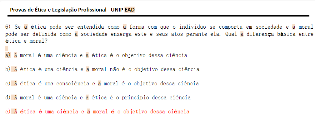 <p>Provas de Ética e Legislação Profissional - UNIP EAD 6) Se a ética pode ser entendida como a forma com que individuo se comporta em sociedade e a mora pode ser definida como a sociedade enxerga este e seus atos perante ela. Qual a diferença básica entr ética e moral? a) A moral é uma ciência e a ética é objetivo dessa ciência b) A ética é uma ciência e a moral não é objetivo dessa ciência c) A ética é uma consciência e a moral é o objetivo dessa ciência d) A moral é uma ciência e a ética é o princípio dessa ciência e) A ética é uma ciência e a moral é O objetivo dessa ciência</p>