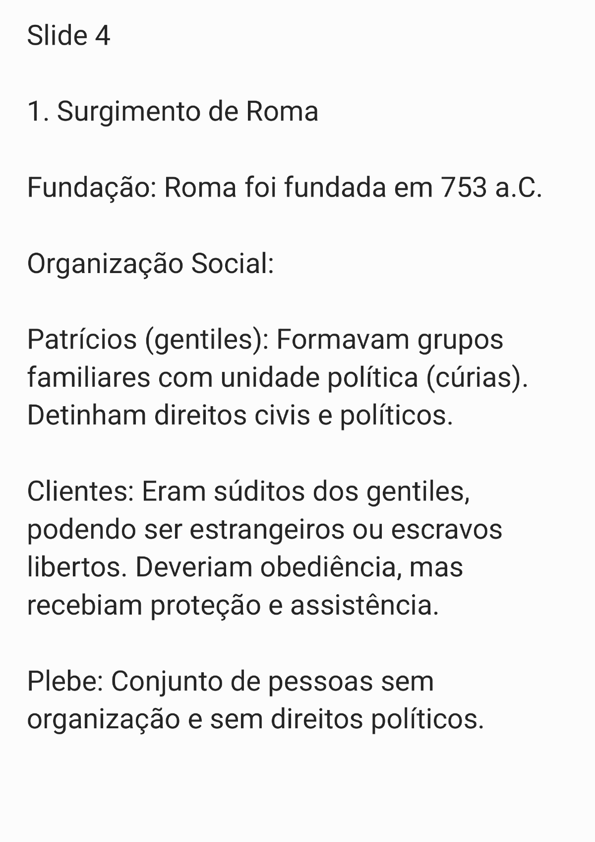 <p>Slide 4 1. Surgimento de Roma Fundação: Roma foi fundada em 753 a.C. Organização Social: Patrícios (gentiles): Formavam grupos familiares com unidade política (cúrias). Detinham direitos civis e políticos. Clientes: Eram súditos dos gentiles, podendo ser estrangeiros ou escravos libertos. Deveriam obediência, mas recebiam proteção e assistência. Plebe: Conjunto de pessoas sem organização e sem direitos políticos.</p><p>2. História Política Realeza: Rei: Cargo vitalício, porém eletivo, com poder civil, militar, religioso e judicial (imperium). Comícios curiatos: Assembleia formada pelas cúrias. Senado: Composto por anciãos com cargo vitalício (300 membros), serviam como conselheiros do rei. República: Senado: Vitalício, cuidava de questões externas. Magistrados:</p><p>Ordinários: Cargos permanentes com eleição anual. Extraordinários: Cargos temporários. Requisitos para ser magistrado: Optimo iure (ser cidadão pleno), Cursus honorum (reputação e experiência), Idade mínima. Magistrados Principais: Cônsules: Comandavam o exército e chefiavam a administração pública. Pretores: Administravam a justiça</p><p>(urbanos e peregrinos). Edis: Responsáveis pela segurança, abastecimento, limpeza, trânsito e lazer. Questores: Cuidavam do tesouro público e impostos. Censores (extraordinários): Responsáveis por recenseamento e policiamento dos costumes (regimen morum). Império: Imperador: Poder civil, militar e judiciário. Senado: Competência penal para crimes de Estado. Diminuição dos poderes dos magistrados.</p><p>3. Periodização do Direito Romano Período Arcaico (VIII a a.C.): Caracterizado pelo formalismo e rigidez, com a Lei das XII Tábuas (451-450 a.C.). Período Clássico a III d.C.): Apogeu da cultura romana, com jurisconsultos e pretores exercendo centralização jurídica. Período Pós-Clássico (III a VI d.C.): Vulgarização e positivação do Direito. Destaca-se o Corpus luris Civilis de Justiniano (Codex, Digesto, Institutas e Novelas). 4. Fontes do Direito Romano Costume (mores maiorum).</p><p>Leis e plebiscitos: Lex privatae (direito privado), Lex publica (direito público), Lex rogata (votadas pelos cidadãos), Lex data (decretos de magistrados ou Senado). Plebiscito: Inicialmente só para plebeus, mas tornaram-se universais após a Lei Hortênsia (286 a.C.). Édito dos magistrados (ius honorarium). Constituições imperiais: Edicta: Deliberações gerais,</p><p>Mandata: Administração, Decreta: Jurisdição, Rescripta: Respostas solicitadas ao Imperador. 5. Divisão do Direito Romano Origem: lus civile: Aplicável aos cidadãos romanos. lus gentium: Aplicável a homens livres, incluindo estrangeiros. lus honorarum: Normas de magistrados. lus extraordinarium: Atividades jurisdicionais do Imperador.</p><p>Aplicabilidade: lus cogens: Direito obrigatório, não negociável. lus dispositivum: Direito negociável pelas partes. Sujeito: lus commune: Aplicabilidade geral. lus singulare: Aplicabilidade específica. Privilegium: Aplicabilidade singular. 6. Institutos do Direito Romano (Capacidade Jurídica)</p><p>Status Libertatis: Escravidão: Origem: guerra, sanções penais, nascimento, dívida (até a Lei Licínia Sextia). Libertação (manumissio): Várias formas como por processo judicial (vindicta), testamento ou por carta (epistulam). Status Civitatis: A cidadania romana podia ser adquirida por casamento válido, nascimento de mãe cidadã ou por lei imperial. Status Familiae:</p><p>Sui iuris: Não submetido ao pater familias. Alieni iuris: Submetido ao pater familias. Capitis diminutio: Perda de status, podendo ser: Máxima: Escravidão, Média: Expatriação, Mínima: Emancipação. Este esquema oferece uma visão coesa e detalhada da estrutura social, política e jurídica de Roma antiga, destacando as principais instituições e períodos do Direito Romano.</p>