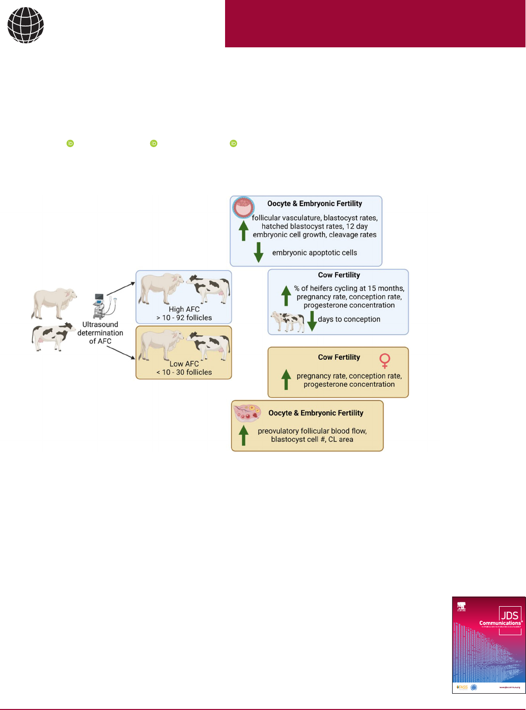 <p>School of Animal Science, Virginia Tech, Blacksburg 24060. *Corresponding author: kalward@ vt .edu. © 2023, The Authors. Published by Elsevier Inc. and Fass</p><p>Inc. on behalf of the American Dairy Science Association®. This is an open access article under the CC BY license (http: / / creativecommons .org/ licenses/ by/ 4</p><p>.0/ ). Received June 18, 2022. Accepted October 31, 2022.</p><p>JDS</p><p>Communications®</p><p>2023; 4:132–137• AMERI</p><p>CA</p><p>N</p><p>D</p><p>AIR</p><p>Y SCIENCE ASSO</p><p>C</p><p>IATION •</p><p>®</p><p>https: / / doi .org/ 10 .3168/ jdsc .2022 -0283</p><p>Mini-Review</p><p>Physiology</p><p>Associations of antral follicle count with fertility</p><p>in cattle: A review</p><p>K. J. Alward,* R. R. Cockrum, and A. D. Ealy</p><p>Graphical Abstract</p><p>Summary</p><p>Ultrasonic determination of antral follicle count (AFC) is used to classify animals into high or low AFC</p><p>categories. These categories have a wide range and animals classified as low on one study may be considered</p><p>high by another study based on the population. Associations with high AFC cows include greater follicular</p><p>vasculature, blastocyst rates, hatched blastocyst rates, 12-d embryonic cell growth and cleavage rates, along</p><p>with a lower number of embryonic apoptotic cells. More high AFC cows cycled as heifers at 15 months, had a</p><p>greater pregnancy rate and conception rate and progesterone concentration after breeding, and fewer days to</p><p>conception. However, other studies have found that low AFC animals had greater pregnancy and conception</p><p>rates and progesterone concentration after breeding compared with high AFC cows. Low AFC cows also</p><p>showed greater preovulatory follicle blood flow, greater blastocyst cell number, and greater area of the corpus</p><p>luteum.</p><p>Highlights</p><p>• Antral follicle count is highly correlated with superovulatory response in cattle.</p><p>• Antral follicle count is more heritable than any other reproductive traits thus far identified.</p><p>• There is a positive relationship between AFC and embryo production.</p><p>• Antral follicle count is related to pregnancy and conception rates, but data are conflicting.</p><p>mailto:kalward@vt.edu</p><p>https://orcid.org/0000-0002-7584-5759</p><p>https://orcid.org/0000-0002-0040-238X</p><p>https://orcid.org/0000-0002-8507-6578</p><p>School of Animal Science, Virginia Tech, Blacksburg 24060. *Corresponding author: kalward@ vt .edu. © 2023, The Authors. Published by Elsevier Inc. and Fass</p><p>Inc. on behalf of the American Dairy Science Association®. This is an open access article under the CC BY license (http: / / creativecommons .org/ licenses/ by/ 4</p><p>.0/ ). Received June 18, 2022. Accepted October 31, 2022.</p><p>JDS</p><p>Communications®</p><p>2023; 4:132–137• AMERI</p><p>CA</p><p>N</p><p>D</p><p>AIR</p><p>Y SCIENCE ASSO</p><p>C</p><p>IATION •</p><p>®</p><p>https: / / doi .org/ 10 .3168/ jdsc .2022 -0283</p><p>Mini-Review</p><p>Physiology</p><p>Abstract: Ovarian antral follicle count (AFC) is a marker of ovarian stimulatory response to superovulation protocols in cattle. This</p><p>article reviews novel research from the past 10 years, focusing on the relationship between AFC and embryo production and cow fertil-</p><p>ity. Substantial evidence indicates a positive relationship between AFC with embryo production; however, conflicting findings exist</p><p>regarding the relationship of AFC with conception and pregnancy rates. This lack of consistent association with pregnancy outcomes is</p><p>perplexing given the differences detected in oocytes, embryos, and endometria from high- versus low-AFC animals. Those differences</p><p>include markers of embryonic viability such as protein level, blastocyst development rates, cleavage rates, and blastocyst cell numbers</p><p>that differ between high- and low-AFC groups, as well as differential gene expression at the cow and embryo level with genes associated</p><p>with fertility. In addition, Bos indicus and Bos taurus cattle appear to have different fertility responses based on their AFC category. In</p><p>summary, clearly more studies are needed to elucidate the true associations between AFC and cow fertility, but the data that have been</p><p>accumulated thus far indicate that AFC has the potential to be a useful marker of lifetime cow fertility.</p><p>Subfertility is the number-one reason for culling on US dairy</p><p>operations (USDA/NAHMS, 2018). Regardless of herd size or</p><p>region of the US, approximately 25% of a dairy farm’s cull cows</p><p>are due to reproductive problems. It is very interesting to consider</p><p>that this culling rate is so high even though our definition of “nor-</p><p>mal” fertility has changed from 50 years ago to today. For example,</p><p>first-service conception rate is reduced from 55% (Casida, 1961)</p><p>to an average of 30 to 40% (Norman et al., 2020). More recently,</p><p>days to first breeding after calving has increased by 3.5 d, and the</p><p>calving interval has increased by 2.5 d since 2010 (Norman et al.,</p><p>2020). This can be partially attributed to increased selection for</p><p>high-producing animals without co-selection for fertility traits</p><p>(Windig et al., 2006). High-producing dairy cows pose manage-</p><p>ment challenges that compromise fertility. One example of this is</p><p>the rapid breakdown of steroid hormones (namely estradiol and</p><p>progesterone) that occurs within the liver of high-producing dairy</p><p>cows due to increased blood flow through the gastrointestinal tract</p><p>to digest feedstuffs (Sangsritavong et al., 2002; Wiltbank et al.,</p><p>2006). This causes decreased duration and intensity of estrus and</p><p>reduced GnRH and LH surges at ovulation, which can lead to larger,</p><p>older follicles at ovulation (Lopez et al., 2004). Lowering circulat-</p><p>ing progesterone limits uterine support for embryo and co