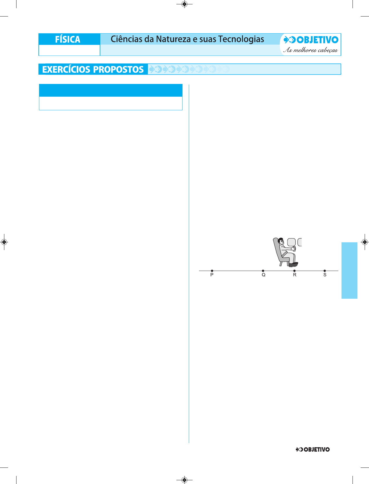 <p>1. Dona Cacilda está sentada em um ônibus que trafega a 100km/h,</p><p>observa uma árvore à beira da estrada e comenta com seu colega</p><p>Ptolomeu:</p><p>“Eu estou parada e a árvore está em movimento ou é a árvore que está</p><p>parada e eu que estou em movimen to?”</p><p>Ptolomeu responde com sua habitual precisão:</p><p>“Para um referencial ligado à estrada, a árvore está em ...............</p><p>................................ e você está em ............................... . Para um</p><p>referencial ligado ao ônibus, a árvore está em ......................................</p><p>e você está em .................................... .”</p><p>Complete as lacunas com as palavras adequadas e justifique.</p><p>RESOLUÇÃO:</p><p>Repouso – movimento – movimento – repouso.</p><p>Repouso e movimento são conceitos relativos que dependem do refe rencial</p><p>adotado.</p><p>2. (IJSO-Brasil-MODELO ENEM) – Dois amigos, Carlos e Fran -</p><p>cis co, estão em seus carros parados num semáforo, um ao lado do</p><p>outro. Quando o farol fica verde, Francisco parte e Carlos, não</p><p>percebendo a abertura do sinal, pisa no freio, pois tem a impressão de</p><p>que seu carro está indo para trás. A respeito desta situação, podemos</p><p>afirmar:</p><p>I. A sensação que Carlos teve decorreu do fato de ter tomado o carro</p><p>de Francisco como referencial.</p><p>II. Em relação ao carro de Francisco, o carro de Carlos se deslocou</p><p>para trás, colidindo com outro carro que estava atrás do seu,</p><p>parado em relação ao semáforo.</p><p>III. Em relação ao semáforo, o carro de Carlos não se movimentou.</p><p>Analisando-se as afirmações, conclui-se que:</p><p>a) Somente a afirmação I é correta.</p><p>b) Somente as afirmações I e II são corretas.</p><p>c) Somente as afirmações I e III são corretas.</p><p>d) Somente as afirmações II e III são corretas.</p><p>e) Todas as afirmações são corretas.</p><p>RESOLUÇÃO:</p><p>I. ( V) Em relação ao carro de Francisco, o carro de Carlos se deslocou</p><p>para trás.</p><p>II. (F) Em relação ao solo, o carro de Carlos continuou parado e</p><p>portanto, não pode ter colidido com o carro de trás.</p><p>III.(V)</p><p>Resposta: C</p><p>3. (UERJ-MODELO ENEM) – No interior de um avião que se</p><p>des loca horizontalmente em relação ao solo, com velocidade constante</p><p>de módulo 1000km/h, um passageiro deixa cair um copo. Observe a</p><p>ilustração abaixo, na qual estão indicados quatro pontos no piso do</p><p>corredor do avião e a posição desse passageiro.</p><p>O copo, ao cair, atinge o piso do avião próximo ao ponto indicado pela</p><p>seguinte letra:</p><p>a) P b) Q c) R d) S e) P ou Q</p><p>RESOLUÇÃO:</p><p>A trajetória depende do referencial adotado.</p><p>Para um referencial no avião, a trajetória do copo é um segmento de reta</p><p>vertical e o copo atinge o chão no ponto R.</p><p>Resposta: C</p><p>MÓDULO 1</p><p>FUNDAMENTOS DA CINEMÁTICA</p><p>– 1</p><p>FÍ</p><p>S</p><p>IC</p><p>A</p><p>B</p><p>D</p><p>E</p><p>FRENTE 1 – MECÂNICA</p><p>C1_BDE_Curso_Fisica_Alelex 11/11/12 18:36 Página 1</p><p>1. Uma partícula, em trajetória retilínea, tem seu movimento descrito</p><p>pela seguinte função horária dos espaços:</p><p>s = 27,0 – 3,0t2</p><p>válida em unidades do SI e para t � 0.</p><p>A respeito do movimento dessa partícula, é correto afirmar que:</p><p>a) o gráfico espaço x tempo é uma reta porque a trajetória é retilínea.</p><p>b) o espaço inicial vale –3,0m.</p><p>c) a partícula não passa pela origem dos espaços.</p><p>d) a partícula passa pela origem dos espaços apenas no instante</p><p>t = 3,0s.</p><p>e) a partícula passa pela origem dos espaços em dois instantes</p><p>distintos.</p><p>RESOLUÇÃO:</p><p>a) Falso: o gráfico espaço x tempo tem a forma de uma parábola e não</p><p>tem nada a ver com a trajetória descrita pela partícula.</p><p>b) Falso: t = 0 ⇒ s = s0 = 27,0m</p><p>c) Falso.</p><p>d) Correto: s = 0</p><p>27,0 – 3,0t2 = 0</p><p>A solução t1 = –3,0s é rejeitada porque foi dito no texto: “Válida para</p><p>t � 0”.</p><p>e) Falso.</p><p>Resposta: D</p><p>2. (UNICAMP-2013-MODELO ENEM) – Para fins de registros</p><p>de recordes mundiais, nas provas de 100 metros rasos não são consi -</p><p>deradas as marcas em competições em que houver vento favorável</p><p>(mesmo sentido do corredor) com velocidade de módulo superior a</p><p>2,0m/s. Sa be-se que, com vento favorável de 2,0m/s, o tempo neces -</p><p>sário para a conclusão da prova é reduzido em 0,1s. Se um velocista</p><p>realiza a prova em 10,0s sem vento, qual seria sua velocidade escalar</p><p>média se o vento fosse favorável com velocidade de módulo 2,0m/s?</p><p>a) 8,0m/s. b) 9,9m/s. c) 10,1m/s. d) 12,0m/s.</p><p>RESOLUÇÃO:</p><p>1) Velocidade escalar média do atleta na ausência de vento:</p><p>V1 = = = 10m/s</p><p>2) Velocidade escalar média do atleta na condição de vento favorável:</p><p>V2 = = = 10,1m/s</p><p>Resposta: C</p><p>3. (UFRN-MODELO ENEM) – Um carro percorre uma estrada com</p><p>velocidade escalar constante de 120km/h. O motor do carro tem um</p><p>rendimento de 1,6km/�, e o tanque só comporta 60 litros de</p><p>combustível. Supondo-se que o carro inicie o percurso com o tanque</p><p>cheio, o tempo necessário, para que, a essa velocidade, todo o</p><p>combustível seja consumido é:</p><p>a) 0,5h b) 0,6h c) 0,8h d) 1,0h e) 2,0h</p><p>RESOLUÇÃO:</p><p>1) 1� ………… 1,6km</p><p>60� ………… �s</p><p>2) V =</p><p>120 =</p><p>�t = (h)</p><p>Resposta: C</p><p>t1 = –3,0s</p><p>t2 = 9,0</p><p>t2 = 3,0s</p><p>MÓDULO 2</p><p>EQUAÇÃO HORÁRIA DOS</p><p>ESPAÇOS E VELOCIDADE ESCALAR MÉDIA</p><p>�s = 96km</p><p>�s</p><p>–––</p><p>�t</p><p>96</p><p>–––</p><p>�t</p><p>96</p><p>––––</p><p>120</p><p>�t = 0,8h</p><p>Δs</p><p>–––</p><p>Δt</p><p>100m