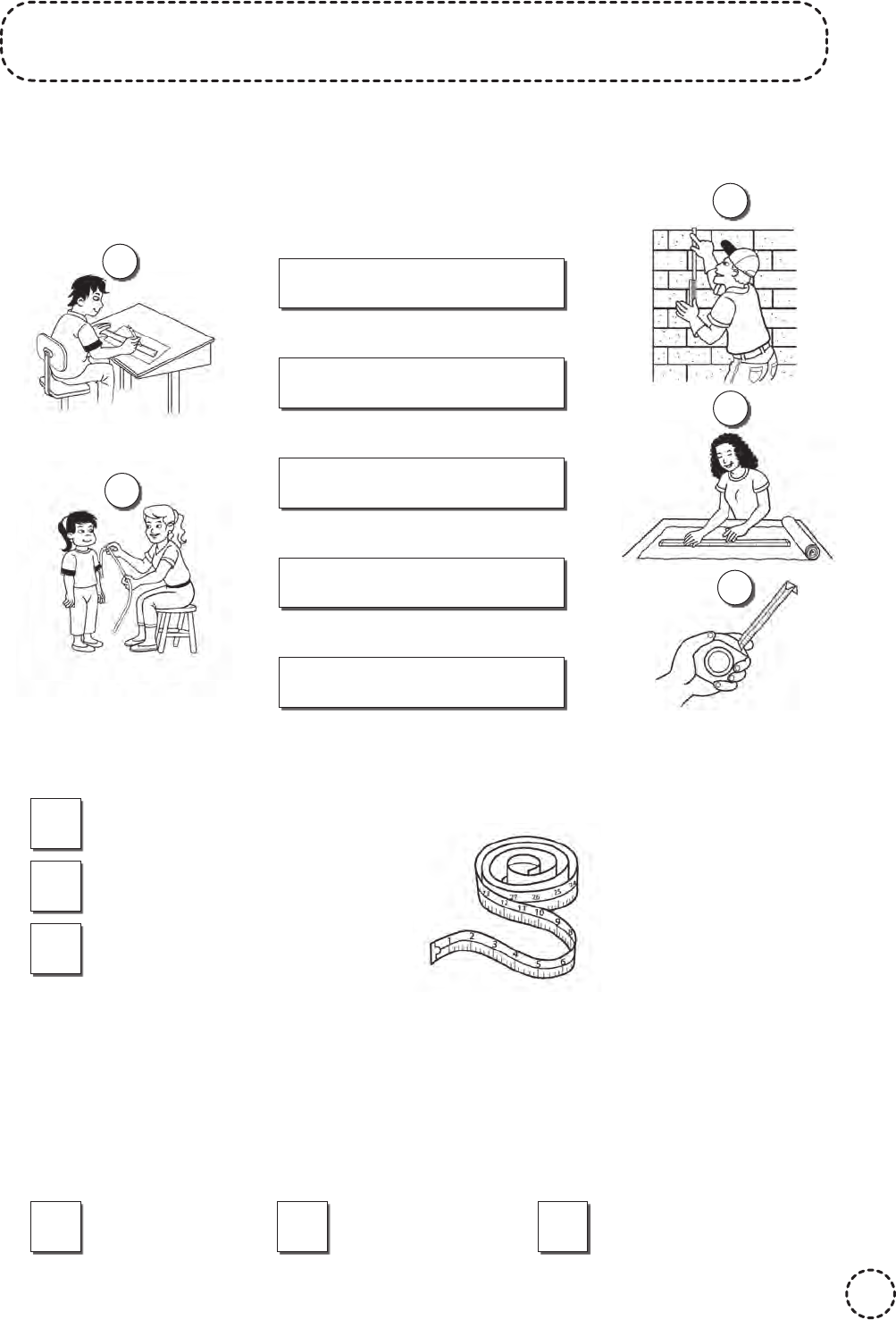 <p>Nome: ________________________________________ Data: ____ /____ /____</p><p>101</p><p>MEDIDAS DE COMPRIMENTO</p><p>1. Ligue a imagem ao instrumento usado.</p><p>FITA MÉTRICA</p><p>METRO DE PEDREIRO</p><p>RÉGUA</p><p>TRENA</p><p>METRO DE MADEIRA</p><p>2. O metro é subdividido em cem partes iguais chamadas de:</p><p>decímetros.</p><p>milímetros.</p><p>centímetros.</p><p>3. Anote a abreviatura de:</p><p>a) metro __________________ b) centímetros __________________</p><p>4. Quantos centímetros tem um metro?</p><p>10 centímetros 100 centímetros 1.000 centímetros</p><p>B</p><p>D</p><p>E</p><p>C</p><p>A</p><p>102</p><p>5. Pinte ou circule o que é medido por metro ou centímetro.</p><p>6. Use uma régua e meça o seu caderno.</p><p>a) Qual é a largura?</p><p>b) Qual é o comprimento?</p><p>7. Usando uma fita métrica ou trena, meça e anote:</p><p>a) a altura de um colega.</p><p>b) a largura de uma janela da sala de aula.</p><p>Nome: ________________________________________ Data: ____ /____ /____</p><p>103</p><p>QUILÔMETRO</p><p>1. Para medir grandes distâncias, usamos o quilômetro. O que,</p><p>normalmente, é medido em quilômetros?</p><p>janela estradas árvore</p><p>corda parede ruas</p><p>2. Um quilômetro é igual a:</p><p>10 metros 100 metros 1.000 metros</p><p>3. Qual é a abreviatura de quilômetro?</p><p>k kg km</p><p>4. Observe esta placa colocada em uma estrada brasileira.</p><p>a) Explique o que significam os símbolos 80 km/h e</p><p>60 km/h.</p><p>b) Cite dois veículos leves.</p><p>c) Cite dois veículos pesados.</p><p>d) Você sabe como é feita a fiscalização eletrônica de velocidade?</p><p>e) O que ocorre ao motorista que desrespeita os limites de velocidade?</p><p>Nome: ________________________________________ Data: ____ /____ /____</p><p>104</p><p>CALCULANDO: MEDIDAS DE COMPRIMENTO</p><p>1. Ana comprou 2 metros e meio de tecido para fazer um vestido. Ela</p><p>gastou 1 metro e 70 centímetros. Quanto sobrou do tecido?</p><p>2. Um fazendeiro comprou 90 metros de arame farpado para fazer</p><p>uma cerca, mas precisou de mais um terço para terminar a cerca.</p><p>Quantos metros de arame ele usou no total?</p><p>3. Um alfaiate vai costurar 22 uniformes para uma empresa. Para</p><p>cada uniforme, são usados 3 metros de tecido.</p><p>a) Quantos metros de tecido serão necessários?</p><p>b) Cada metro de tecido custa 18 reais. Quanto será gasto em tecido?</p><p>105</p><p>4. A distância entre Salvador (BA) e Aracaju (SE) é de 356 quilômetros.</p><p>Com seu automóvel, Simone já percorreu 213 quilômetros dessa</p><p>distância. Quantos quilômetros faltam para ela chegar?</p><p>5. Um ciclista irá percorrer 405 quilômetros de São Paulo ao Rio de</p><p>Janeiro. Na manhã do primeiro dia, ele percorreu 86 quilômetros e, à</p><p>tarde, 75 quilômetros.</p><p>a) Quantos quilômetros ele já percorreu?</p><p>b) Quantos quilômetros ainda faltam percorrer?</p><p>6. A cada hora, um automóvel percorre 80 quilômetros de uma estrada.</p><p>Quantos quilômetros já foram percorridos, se o tempo de percurso</p><p>desse automóvel já dura 2 horas e meia?</p>