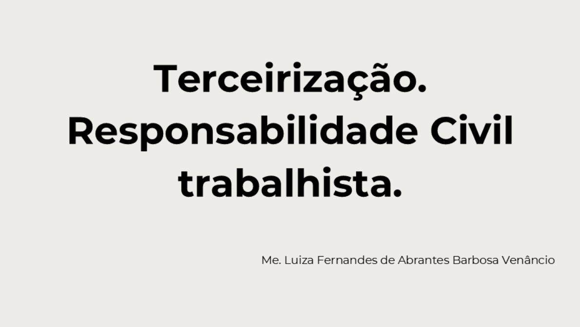 <p>Terceirização. Responsabilidade Civil trabalhista. Me. Luiza Fernandes de Abrantes Barbosa Venâncio</p><p>Terceirização Conceito; e lícita; Responsabilidade; Atividade meio e atividade fim.</p><p>Efeitos da terceirização Vínculo com tomador de serviço; Isonomia salarial; Administração pública.</p><p>Súmula 331 TST - CONTRATO DE PRESTAÇÃO DE SERVIÇOS. I - - A contratação de trabalhadores por empresa interposta é ilegal, formando-se vínculo diretamente com tomador dos serviços, salvo no caso de trabalho temporário (Lei 6.019, de 03.01.1974). II - A contratação irregular de trabalhador, mediante empresa interposta, não gera vínculo de emprego com os órgãos da Administração Pública direta, indireta ou fundacional (art. 37, II, da CF/1988). III - Não forma vínculo de emprego com tomador a contratação de serviços de vigilância (Lei n° 7.102, de 20.06.1983) e de conservação e limpeza, bem como a de serviços especializados ligados à atividade-meio do tomador, desde que inexistente a pessoalidade e a subordinação direta. IV - O inadimplemento das obrigações trabalhistas, por parte do empregador, implica a responsabilidade subsidiária do tomador dos serviços quanto obrigações, desde que haja participado da relação processual e conste também do título executivo judicial.</p><p>Súmula 331 TST - CONTRATO DE PRESTAÇÃO DE SERVIÇOS. LEGALIDADE. V - Os entes integrantes da Administração Pública direta e indireta respondem subsidiariamente, nas mesmas condições do item IV, caso evidenciada a sua conduta culposa no cumprimento das obrigações da Lei 8.666, de 21.06.1993, especialmente na fiscalização do cumprimento das obrigações contratuais e legais da prestadora de serviço como empregadora. A aludida responsabilidade não decorre de mero inadimplemento das obrigações trabalhistas assumidas pela empresa regularmente contratada. VI A responsabilidade subsidiária do tomador de serviços abrange todas as verbas decorrentes da condenação referentes ao período da prestação laboral. Observação: (nova redação do item IV e inseridos os itens V e VI à redação) - Res. 174/2011, DEJT divulgado em 27, 30 e 31.05.2011</p><p>Tema 725 - Terceirização de serviços para a consecução da atividade-fim da empresa. É lícita a terceirização ou qualquer outra forma de divisão do trabalho entre pessoas jurídicas distintas, independentemente do objeto social das empresas envolvidas, mantida a responsabilidade subsidiária da empresa contratante.</p><p>RECURSO DE REVISTA INTERPOSTO PELA RECLAMADA. LEI 13.467/2017. TERCEIRIZAÇÃO ARTIGO 25 DA LEI N° 8.987/95. ADPF N° 324 E RE N° DISTINGUISHING VERIFICAÇÃO DA PRESENÇA DOS REQUISITOS DOS 2.° E 3.° DA CLT. 1. Supremo Tribunal Federal, no julgamento da ADPF 324 e do RE 958252, aprovou tese com repercussão geral no sentido de que: "É licita a terceirização ou qualquer outra forma de divisão do trabalho entre pessoas jurídicas distintas, independentemente do objeto social das empresas envolvidas, mantida a responsabilidade subsidiária da empresa contratante" ( RE 958252). Portanto, de acordo com a Suprema Corte, é lícita a terceirização em todas as etapas do processo produtivo, sem distinção entre atividade-meio ou atividade-fim 2. Todavia, admite-se a aplicação do distinguishing quanto à tese fixada pelo STF, quando, na análise do caso concreto, verificar-se a presença dos requisitos dos arts. e da CLT entre o empregado e a empresa tomadora dos serviços, situação que autoriza o reconhecimento do vínculo empregatício diretamente com esta, pois desfigurada a própria utilizada apenas com o intuito de mascarar vínculo empregatício do trabalhador. 3. Vale dizer, caso constatada fraude na aplicação da legislação trabalhista, não em decorrência do labor na atividade-fim da tomadora, mas pela constatação dos requisitos da relação de emprego, como no caso dos autos, em que comprovada a subordinação direta do trabalhador aos prepostos da ré, forçoso reconhecer a ilicitude da terceirização. Recurso de revista não conhecido. (TST RR: Relator: Delaide Alves Miranda Arantes, Data de Julgamento: 06/04/2022, Turma, Data de Publicação: 11/04/2022)</p><p>RECURSO DE REVISTA INTERPOSTO NA VIGÊNCIA DA LEI N° 13.015/2014 . TERCEIRIZAÇÃO. RESPONSABILIDADE SUBSIDIÁRIA DO TOMADOR DE SERVIÇOS PELOS CRÉDITOS DO TRABALHADOR TERCEIRIZADO. ABRANGÊNCIA DE TODAS AS VERBAS DA CONDENAÇÃO, INCLUSIVE A MULTA PREVISTA NO ARTIGO 477, § DA CLT. A jurisprudência desta Corte pacificou-se no entendimento de que a responsabilização subsidiária, prevista na Súmula 331, item IV, do TST, implica pagamento da totalidade dos débitos trabalhistas, inclusive as multas legais ou convencionais e verbas rescisórias ou indenizatórias. Esse entendimento foi consolidado no item VI da Súmula 331 do TST, in verbis : "A responsabilidade subsidiária do tomador de serviços abrange todas as verbas decorrentes da condenação referentes ao período da prestação laboral". O Regional, ao manter a responsabilização subsidiária da tomadora de serviços pela multa prevista no artigo 477, § da CLT, decidiu em sintonia com a súmula desta Corte. Recurso de revista não (TST RR: 10092820155050221, Relator: Jose Roberto Freire Pimenta, Data de Julgamento: 09/02/2022, Turma, Data de Publicação: 11/02/2022)</p><p>Responsabilidade civil trabalhista Regra: Empregador; Grupo econômico; Sócios e sócio retirante;</p><p>Art. Sempre que uma ou mais empresas, tendo, embora, cada uma delas, personalidade jurídica própria, estiverem sob a direção, controle ou administração de outra, ou ainda quando, mesmo guardando cada uma sua autonomia, integrem grupo serão responsáveis solidariamente pelas obrigações decorrentes da relação de emprego.</p><p>Art. 10-A. O sócio retirante responde subsidiariamente pelas obrigações trabalhistas da sociedade relativas ao período em que figu
