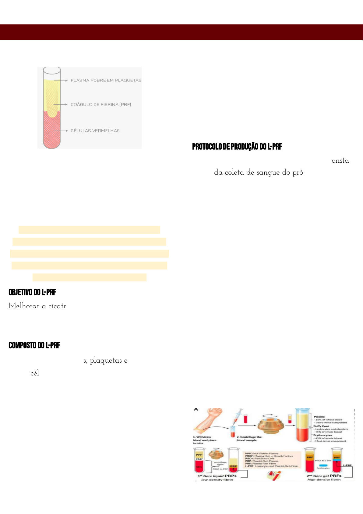 <p>PERIODONTIA II</p><p>L-PRF em periodontia</p><p>A Fibrina Rica em Plaquetas (PRF) e a Fibrina</p><p>Rica em Plaquetas e Leucócitos (L-PRF) foram</p><p>desenvolvidas por Choukroun et al. (2006) e são</p><p>classificadas como concentrados de plaquetas de</p><p>segunda geração</p><p>A L-PRF é uma malha de fibrina autóloga</p><p>obtida a partir da centrifugação controlada do</p><p>plasma, que possui todos os constituintes de uma</p><p>amostra de sangue conhecidos como favoráveis</p><p>ao processo de reparo e imunidade</p><p>Objetivo do L-PRF</p><p>Melhorar a cicatrização de feridas e a</p><p>regeneração tecidual após procedimentos</p><p>cirúrgicos intraorais</p><p>Composto do l-prf</p><p>● Contém citocinas, plaquetas e</p><p>células-tronco embutidas</p><p>A L-PRF contém diferentes tipos de células e</p><p>proteínas que trabalham juntas para promover</p><p>a regeneração e cicatrização dos tecidos</p><p>Os leucócitos são importantes por suas</p><p>propriedades imunológicas e antibacterianas,</p><p>enquanto os monócitos/macrófagos contribuem</p><p>com a fagocitose e secreção de fatores de</p><p>crescimento e colagenase para estimular a</p><p>limpeza da ferida.</p><p>● o TGF-β1, VEGF e PDGF-AB, juntamente</p><p>com proteínas da matriz, que</p><p>desempenham um papel importante no</p><p>processo de cicatrização e regeneração.</p><p>PROTOCOLO DE PRODUÇÃO DO L-PRF</p><p>1. O protocolo de obtenção do L-PRF consta</p><p>da coleta de sangue do próprio paciente</p><p>por venopunção, em tubos de 9-10mL</p><p>revestidos por vidro/plástico</p><p>2. Deve ser imediatamente centrifugada alta</p><p>velocidade a 400g RCF: 2700 rpm</p><p>durante 12 minutos</p><p>3. Com a centrifugação, ocorre a</p><p>transformação da trombina em fibrina,</p><p>gerando um coágulo de fibrina no meio</p><p>do tubo, enquanto os eritrócitos se</p><p>depositam na parte inferior e o plasma</p><p>celular na parte superior do tubo</p><p>O material bioativo resultante do processamento</p><p>de L-PRF é estável, resiliente, forte, adesivo e</p><p>maleável, permitindo fácil adaptação a</p><p>diferentes defeitos anatômicos e aplicações,</p><p>podendo ser misturado com enxertos ósseos,</p><p>usado como preenchimento direto ou</p><p>compactado em uma membrana de fibrina mais</p><p>resistente</p><p>PERIODONTIA II</p><p>Como utilizar clinicamente?</p><p>Para o uso clínico do L-PRF o coágulo é</p><p>removido do tubo com uma pinça e a porção de</p><p>células vermelhas aderidas ao coágulo é então</p><p>removida com uma espátula, tesoura ou lâmina</p><p>de bisturi.</p><p>● Para a formação da membrana, o coágulo</p><p>de fibrina é posicionado sobre uma</p><p>superfície perfurada em uma caixa</p><p>metálica (PRF box), sendo comprimido</p><p>por ação da gravidade com a ajuda da</p><p>placa metálica da caixa por um período</p><p>de 5 minutos</p><p>O exsudato liberado pelo coágulo, devido à sua</p><p>compressão, ficará armazenado no</p><p>compartimento inferior da caixa. Este exsudato é</p><p>rico em proteínas (fibronectina e vitronectina) e</p><p>poderá ser utilizado para hidratar enxertos e</p><p>biomateriais, assim como para lavar feridas</p><p>cirúrgicas</p>