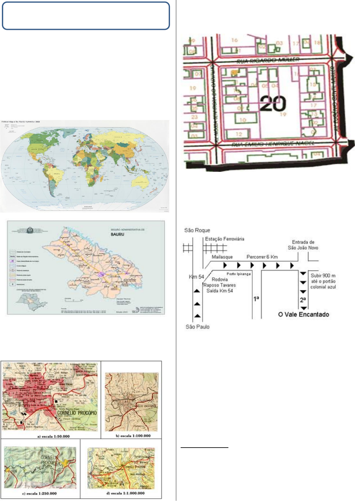 <p>Capítulo 1 - Noções básicas de cartografia</p><p>A cartografia é uma ferramenta para a construção dos</p><p>estudos e análises geográfica. Ela consiste na elaboração do</p><p>espaço geográfico. As principais cartografias são os:</p><p> Mapas – são representações geométricas planas e</p><p>simplificadas da superfície terrestres. Os mapas</p><p>podem representar desde o globo terrestre, por</p><p>exemplo: Mapa Mundi, até dimensões menores, como</p><p>um município ou um bairro.</p><p>Mapa Mundi.</p><p>Mapa Municipal:</p><p> Cartas – são representações com um nível de</p><p>detalhamento e precisão maior e tendem a</p><p>representar espaços de menos dimensões, como</p><p>municípios ou bairros:</p><p> Plantas – são cartas que representam áreas pequenas,</p><p>com ausência de qualquer referencia a curvatura da</p><p>Terra, possuem escala constante:</p><p> Croquis – são mapas de alinhamento aproximados,</p><p>sem controle, ou seja, esboço de levantamento</p><p>expedito entre determinados pontos:</p><p>As cartas e os mapas podem ser reproduzidos através de</p><p>fotografias aéreas, imagens de satélite e trabalho em campo,</p><p>com a utilização de GPS (Sistema Global de Posicionamento).</p><p>Orientação – localizar-se, estabelecer caminhos e orientar-</p><p>se para seguir a direção certa: isso sempre acompanhou a</p><p>historia do homem na terra. O que mudou, ao longo do</p><p>tempo, foram os recursos tecnológicos, as características do</p><p>espaço geográfico e os referenciais para a localização e para</p><p>orientação.</p><p>Pontos cardeais – conhecidos como pontos de referência,</p><p>são de extrema importância para a localização e a</p><p>orientação geográfica. Os quatro pontos cardeais são:</p><p>1. Norte (N) – marca a direção do Polo Norte da Terra.</p><p>Existem dois sinônimos; setentrional e boreal.</p><p>2. Sul (S) – marca a direção do Polo Sul da Terra. Existem</p><p>dois sinônimos; meridional e austral.</p><p>3. Leste (E/L) – o referencial aproximado é o “nascer do</p><p>Sol”. Como a Terra gira de oeste para leste, visualiza-</p><p>se o nascente a leste. O sinônimo é oriente;</p><p>4. Oeste (W/O) – o referencial aproximado é o “pôr do</p><p>Sol”. O sinônimo é ocidente.</p><p>Através do sol é possível identificar os quatros pontos</p><p>cardeais. Para isso, estique o braço direito na direção em</p><p>que o sol nasce (nascente), esse será o ponto Leste (E/L). Em</p><p>seguida estique o braço esquerdo na direção em que o sol se</p><p>põe (poente), esse será o ponto Oeste (W/O). O Norte (N)</p><p>está a sua Frente e o Sul (S), atrás de você.</p><p>No entanto, é importante ressaltar que, durante o ano, o sol</p><p>nasce em pontos distintos. Sendo assim, não podemos</p><p>afirmar que o sol nasce sempre no ponto cardeal Leste.</p><p>Portanto, essa metodologia indica os pontos cardeais em</p><p>relação ao lugar em que estamos.</p><p>Pontos Colaterais – encontra-se entre os pontos cardeais:</p><p> Nordeste (NE), entre o norte e o leste;</p><p> Sudeste (SE), entre o sul e o leste;</p><p> Sudoeste (SW/SO), entre o sul e o oeste;</p><p> Noroeste (NW/NO), entre o norte e o oeste.</p><p>Pontos Subcolaterais – são os pontos que ficam entre os</p><p>pontos cardeais e os pontos colaterais, apresentam um grau</p><p>de precisão melhor, são eles;</p><p>1. Norte-Nordeste (NNE);</p><p>2. Leste-Nordeste (LNE ou ENE);</p><p>3. Leste-Sudeste (LSE ou ESE);</p><p>4. Sul-Sudeste (SSE);</p><p>5. Sul-Sudoeste (SSO ou WSW);</p><p>6. Oeste-Sudoeste (OSO ou WSW);</p><p>7. Oeste-Noroeste (ONO ou WNW);</p><p>8. Norte-Noroeste (NNO ou NNW).</p><p>Outros meios de orientações:</p><p> Sol – nasce do Leste e se põe no Oeste;</p><p> Estrela Polar – visível apenas no hemisfério Norte;</p><p> Cruzeiro do Sul – constelação em forma de cruz</p><p>localizada no hemisfério Sul;</p><p> Lua;</p><p> Musgos – existente no hemisfério Sul;</p><p> Girassol – no Sul, voltam sua flor para o Norte;</p><p> Bússola – indica o Norte geográfico da terra;</p><p> GPS – (sistema de posicionamento global)</p><p>constituído por uma rede de 24 satélites.</p><p>Localização: Coordenadas Geográficas – são linhas</p><p>imaginarias que cortam o planeta nos sentidos horizontal e</p><p>vertical, servindo para a localização de qualquer ponto na</p><p>superfície terrestre. A distância das coordenadas geográficas</p><p>são medidas em graus, minutos e segundos. (Importante: 1°</p><p>é igual a 60’’ minutos). Chamamos essas linhas de:</p><p>Rosa-dos-ventos</p><p>Obs. Linha do Equador é a Latitude e o Meridiano de Greenwich é</p><p>a Longitude.</p><p>1. Paralelos (Latitude) – são linhas imaginarias na posição</p><p>horizontal que cruzam o sentido leste - Oeste, os</p><p>principais são:</p><p> Linha do Equador (0°) – principal paralelo mede</p><p>aproximadamente, 40.000 km. Divide a Terra em</p><p>dois hemisférios: Norte (Boreal ou Setentrional) e</p><p>Sul (Austral ou Meridional). É a base para</p><p>determinar a Latitude que variam de 0° a 90°. A</p><p>linha atravessa os estados de: Amapá, Amazônia,</p><p>Pará e Roraima. Macapá é a única capital cortada</p><p>pela linha do Equador.</p><p> Trópico de Câncer (23°27’’) – É uma linha</p><p>imaginaria localizado no hemisfério Norte, sobre a</p><p>Latitude de 23°27’’. Além de marca a inclinação dos</p><p>raios, situa-se entre os dois trópicos e são</p><p>chamadas de regiões intertropicais.</p><p> Trópico de Capricórnio (-23°27’’) – É uma linha</p><p>imaginaria localizado no hemisfério Sul, sobre a</p><p>Latitude de 23°27’’. Além de marca a inclinação dos</p><p>raios, situa-se entre os dois trópicos e são</p><p>chamadas de regiões intertropicais. No Brasil, a</p><p>linha atravessa os estados de: Mato grosso do sul,</p><p>Paraná e São Paulo.</p><p> Círculo Polar Ártico (66°33’