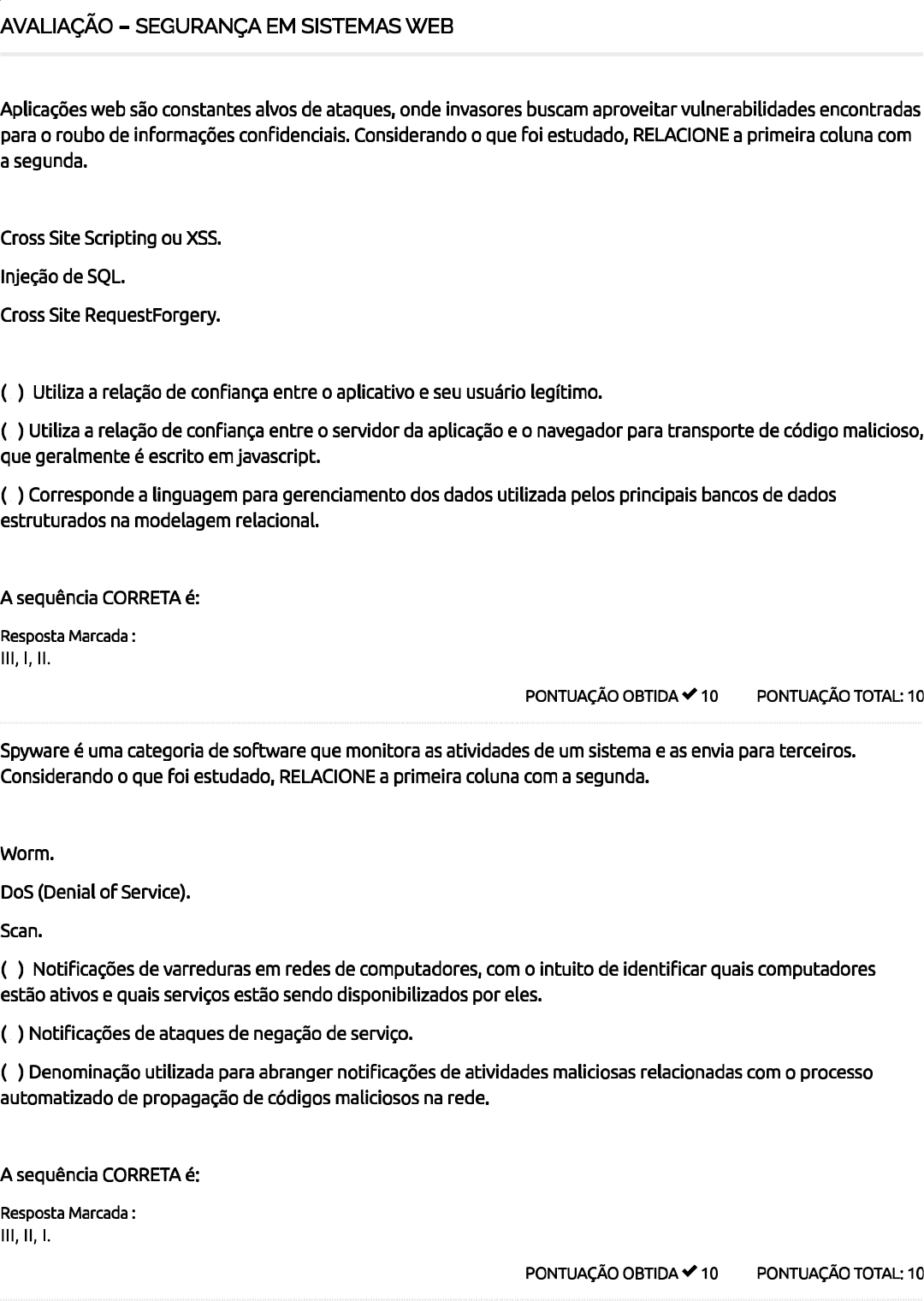 <p>AVALIAÇÃO - SEGURANÇA EM SISTEMAS WEB Aplicações web são constantes alvos de ataques, onde invasores buscam aproveitar vulnerabilidades encontradas para o roubo de informações confidenciais. Considerando o que foi estudado, RELACIONE a primeira coluna com a segunda. Cross Site Scripting ou Injeção de SQL. Cross Site RequestForgery. ( ) Utiliza a relação de confiança entre o aplicativo e seu usuário legítimo. ( ) Utiliza a relação de confiança entre o servidor da aplicação e o navegador para transporte de código malicioso, que geralmente é escrito em javascript. ( ) Corresponde a linguagem para gerenciamento dos dados utilizada pelos principais bancos de dados estruturados na modelagem relacional. A CORRETA é: Resposta Marcada : III, I, II. PONTUAÇÃO OBTIDA 10 PONTUAÇÃO TOTAL: 10 Spyware é uma categoria de software que monitora as atividades de um sistema e as envia para terceiros. Considerando o que foi estudado, RELACIONE a primeira coluna com a segunda. Worm. DoS (Denial of Service). Scan ( ) Notificações de varreduras em redes de computadores, com o intuito de identificar quais computadores estão ativos e quais serviços estão sendo disponibilizados por eles. ( ) Notificações de ataques de negação de serviço. ( ) Denominação utilizada para abranger notificações de atividades maliciosas relacionadas com o processo automatizado de propagação de códigos maliciosos na rede. A sequência CORRETA é: Resposta Marcada : III, II, I. PONTUAÇÃO OBTIDA 10 PONTUAÇÃO TOTAL: 10</p><p>Os sites podem ser afetado por algum tipo de ataque DDoS. De acordo com que foi estudado, assinale a opção CORRETA: Resposta Marcada : Ataques DDoS dependem do seu provedor de hospedagem, datacenter ou CDN para serem apropriadamente mitigados. PONTUAÇÃO OBTIDA 10 PONTUAÇÃO TOTAL 10 No Broken Autenticação e Gestão de Sessões, oinvasor utiliza-se de falhas da aplicação no gerenciamento de sessão ou na autenticação, como por exemplo, contas expostas, senhas, IDs de sessão, para representar um usuário legítimo. De acordo com Owasp (2017) deve-se verificar as seguintes diretrizes, EXCETO: Resposta Marcada : Os IDs de sessão não são rodados após o login mal-sucedido. PONTUAÇÃO OBTIDA 10 PONTUAÇÃO TOTAL: 10 Depois de concluir o inventário de seus aplicativos web, classificá-los em ordem de prioridade é o próximo passo lógico. De acordo com que foi estudado, assinale a opção CORRETA: Resposta Marcada Mesmo depois de categorizar suas aplicações de acordo com a importância, será necessário um investimento considerável de recursos para analisá-las. PONTUAÇÃO OBTIDA 10 PONTUAÇÃO TOTAL: 10 o primeiro passo para assegurar-se que se está utilizando as melhores práticas de segurança para aplicações web é ter um plano traçado. Analise as frases a seguir e assinale a opção CORRETA: I. Embora o plano de segurança e a lista de verificação de cada empresa sejam diferentes e dependam da arquitetura de sua infraestrutura, é importante que você defina especificamente quais os requisitos de segurança a serem atendidos e os critérios para avaliação. II. Se sua organização é grande o suficiente, seu plano deve relacionar os indivíduos dentro da organização que serão responsáveis pela manutenção contínua dessas melhores práticas. Resposta Marcada : A asserção e II são verdadeiras. PONTUAÇÃO OBTIDA 10 PONTUAÇÃO TOTAL: 10 Durante a implementação do software é aconselhado que seja feito um plano de ação, descrevendo como a equipe tratará uma eventual descoberta de vulnerabilidades ou a ocorrência de um ataque, para que se este vier a ocorrer, a equipe não demore muito para responder e aplicar as correções necessárias. Acerca do tema estudado assinale a opção INCORRETA: Resposta Marcada Senhas padrões devem ser utilizadas em qualquer ambiente, principalmente quando lidamos com servidores. PONTUAÇÃO OBTIDA 10 PONTUAÇÃO TOTAL: 10</p><p>o primeiro grande ataque a WEB ocorreu em 1988. Considerando tema estudado, assinale a alternativa CORRETA: Resposta Marcada : Um estudante da universidade de Cornell criou um worm, programa que se propaga através de vulnerabilidades ou falhas de configuração de software criando cópias de si mesmo. PONTUAÇÃO OBTIDA 10 PONTUAÇÃO 10 A internet é um conjunto de redes interligadas. Utilizando determinadas regras para a comunicação entre os computadores, conhecidos como protocolos de comunicação. Considerando tema estudado, assinale a alternativa INCORRETA: Resposta Marcada : A internet já tem por volta de setenta anos e, nesse tempo tem crescido extremamente lento, com o ritmo lento do desenvolvimento tecnológico. PONTUAÇÃO OBTIDA 10 PONTUAÇÃO TOTAL: 10 De acordo com a McAfee for Businesss4 (2014), uma das maiores ameaças que as organizações enfrentam nos dias atuais são os softwares desprotegidos. Analise as frases a seguir e assinale a opção CORRETA: I. Terto (2011), afirma que processo de hardware é um conjunto de fatores e resultados associados desenvolvidos de forma cíclica em uma organização que produz hardware e buscam desenvolver aplicações com qualidade. II. A forma mais comum de garantir que será produzido código seguro é por meio de aderência ao uso de padrões de codificação que aumentam a ocorrência de vulnerabilidades de código. Assinale a alternativa CORRETA: Resposta Marcada : As asserções e são falsas PONTUAÇÃO OBTIDA 10 PONTUAÇÃO TOTAL: 10 Total 100 / 100</p>