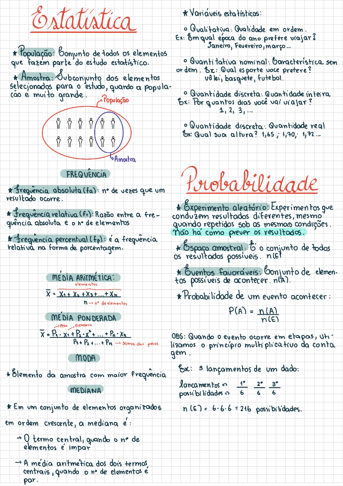 <p>Qualitativa: Qualidade em Ex: Emqual epoca do ano prefere População: Conjunto de todos elementos Fevereiro, que fazem parte do estudo estatistico. Quanti tativa nominal: sem Amostra: Subconjunto dos elementos or Ex: Qual esporte voce pretere? basquete, futebol. selecionados para estudo, quando a popula- e muito Quantidade discreta: Quantidade in terra Ex: Por quantos dras voce vai viajar? 1,2,3, Quantidade discreta: Quantidade real Ex: Qual sua altura? 1,65; 1,70, 1,72 Amostra frequencia absoluta (fa): de vezes que um Probabilidade resultado ocorre. frequencia relativa (fr): Razão entre a fre- Experimento Experimen tos que conduzem resultados diferentes, mesmo quência absoluta e de elementos quando repetidos sob as mesmas condições. percentual (fp) a frequencia nao como prever resultados. relativa na forma de porcentagem. conjunto de todos OS resultados possiveis. MEDIA Eventos elemen. elementos tos de n(A). = Xn Probabilidade de um evento n no de elementos P(A) = n(A) MEDIA PONDERADA n(E) PESO ELEMENTO X = OBS: Quando evento ocorre em etapas, Pn dos pesos lizamos da conta MODA gem * Elemento da amostra com maior frequencia Ex: 3 lançamentos de um dado: lancamentos 1° 2° 3° MEDIANA possibilidades 6 6 6 Em um conjunto de elementos organizados n (E) = 6.6.6 = 216 possibilidades. em ordem crescente, a mediana 0 termo central, quando de elementos impar A média aritmetica dos dois termos quando de elementos par.</p>