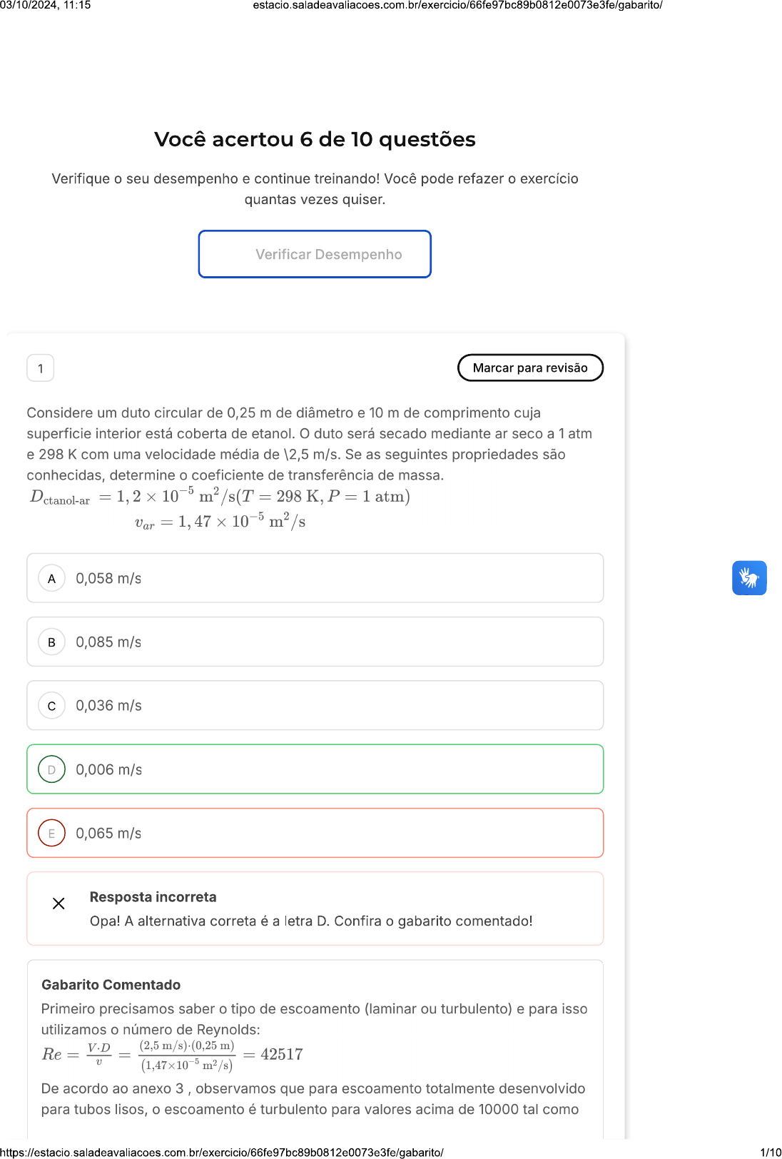 <p>03/10/2024, 11:15 Você acertou 6 de 10 questões Verifique o seu desempenho e continue treinando! Você pode refazer o exercício quantas vezes quiser. Verificar Desempenho 1 Marcar para revisão Considere um duto circular de 0,25 m de diâmetro e 10 m de comprimento cuja superficie interior está coberta de etanol. duto será secado mediante ar seco a 1 atm e 298 K com uma velocidade média de m/s. Se as seguintes propriedades são conhecidas, determine o coeficiente de transferência de massa. 1 atm) A 0,058 m/s B 0,085 m/s C 0,036 m/s D 0,006 m/s E 0,065 m/s X Resposta incorreta Opa! A alternativa correta é a letra D. Confira o gabarito comentado! Gabarito Comentado Primeiro precisamos saber o tipo de escoamento (laminar ou turbulento) e para isso utilizamos o número de Reynolds: 42517 De acordo ao anexo 3 observamos que para escoamento totalmente desenvolvido para tubos lisos, o escoamento é turbulento para valores acima de 10000 tal como 1/10</p><p>03/10/2024, 11:15 é neste caso. Para escoamento turbulento, neste mesmo anexo, encontramos que o número de Sherwood é: Sh = Onde o por definição é: DMB Por tanto, Sh: 0,023 (42517)0,8 (1,225)0,4 = 125,8 por definição do número de Sherwood é: Ou seja: hmassa : = D 2 Marcar para revisão Gás hidrogênio (H2) é armazenado a 298 K e 2 bar de pressão num tanque esférico de raio interno e externo de 2 me 2,02 respectivamente. o material do tanque é de (Ni). Assumindo as seguintes propriedades: Qual é o valor da taxa de transferência de massa por difusão pela parede em base molar? A kmol/s B kmol/s C kmol/s D kmol/s E kmol/s Resposta correta Parabéns, você selecionou a alternativa correta. Confira o gabarito comentado! Gabarito Comentado 2/10</p><p>03/10/2024, 11:15 Primeiro determinamos com os dados de solubilidade e pressão a concentração molar do H2 na interfase. Posteriormente, utilizamos a equação de taxa de difusão molar para esferas em estado estacionário e unidimensional. CH2-NI = (2 = 0,01504 Em base temos a taxa de transferência de massa para esferas: Ajustando para nosso sistema: = Assumindo que pela sílica ser um sólido, a concentração de H2 no lado oposto da parede é quase nula, ou seja, CH2.2 = por tanto: = 3 Marcar para revisão Considere uma peça de aço 1045 que experimenta um processo de descarbonização a 973 K. A difusividade da massa de carbono no aço a essa temperatura é de 1x 10-11 Determine o valor da profundidade abaixo da superfície do aço em que a concentração de carbono se reduz a 70% a partir do valor inicial da concentração como resultado do término do processo de descarbonização após 1 hora. Assuma que a concentração de carbono na superfície é nula durante o processo. A 0,098 mm B 0,256 mm C 0,326 mm D 0,225 mm E 0,273 mm Resposta correta Parabéns, você selecionou a alternativa correta. Confira o gabarito comentado! Gabarito Comentado Para um sistema transiente, a variação da concentração ou da fração mássica é definida assim: = 3/10</p><p>03/10/2024, 11:15 tanto: = erfc 2 AB t 2 D AB t Procurando no anexo 2, para um valor de \erfc(n) = 0, 3 encontramos um valor aproximado de 72. Ou seja: = 0,72 Para um tempo de 1j (3600s) temos: = 0,72 (3600 s) m ou 0, 273 mm 4 Marcar para revisão Uma peça de aço 1045 quente com uma concentração uniforme inicial de carbono de 0,45% em base mássica é exposta a uma atmosfera carburante durante 2 horas. Durante todo o processo, a concentração de carbono na superfície foi de 0,9%. A difusividade mássica do carbono no aço durante esse processo é uniforme e de 1x 10- 11 Qual é percentagem de concentração mássica a 0,1 mm? A 0,70% B 0,20% C 0,87% D 0,65% E 0,51% Resposta correta Parabéns, você selecionou a alternativa correta. Confira o gabarito comentado! Gabarito Comentado 4/10</p><p>03/10/2024, 11:15 Para um sistema transiente, a variação da concentração ou da fração mássica é definida assim: Para um valor de 0,0001 m obtemos a fração mássica desta forma: 0,0001 = 0,0045 termo erfc(0,1863) é determinando utilizando o anexo 2. o valor exato não está na tabela, por tanto, uma aproximação do valor de = = 0,0045 0,87% 5 Marcar para revisão Um tanque grande contém oxigênio (O2) a 1 atm e 298 K que desafoga para atmosfera através de um tubo de 2 m de comprimento e cujo diâmetro interno é de 0,02 m. Determine a taxa de difusão de massa (base mássica) sabendo as seguintes propriedades: = A 4,3 X 10-7 kg/s B 2,3 X 10-7 kg/s C 3,3 X 10-7 kg/s D 5,3 X 10-7 kg/s E 6,3 X 10-7 kg/s X Resposta incorreta Opa! A alternativa correta é a letra A. Confira o gabarito comentado! Gabarito Comentado Para um fluxo unidimensional através de um canal de área A da seção transversal uniforme, sem reações químicas homogêneas, temos: L L 5/10</p><p>03/10/2024, 11:15 No nosso caso em que conhecemos as pressões, e ajustando para nosso problema temos: A área é a da seção transversal da tubulação e a diferença de pressão desde o atm). = : 4 4 Substituindo na equação da taxa de difusão (base molar), sabendo que Ru é a constante universal dos gases, temos: = . Conhecemos a taxa de difusão em base molar, simplesmente mediante a massa molecular realizamos a conversão assim: = = 6 Marcar para revisão Ar escoa a 298 K e 1 atm sobre uma placa coberta de cloro de 5 m de comprimento com uma velocidade média de 3 m/s para secar a superfície. As seguintes propriedades são conhecidas: { Qual é valor do número de Sherwood (Sh)? A 1825 B 3658 C 2368 D 4352 E 1965 X Resposta incorreta Opa! A alternativa correta é a letra C. Confira o gabarito comentado! Gabarito Comentado 6/10</p><p>03/10/2024, 11:15 Primeiro precisamos saber o tipo de escoamento (laminar ou turbulento) e para isso utilizamos o número de Reynolds: = De acordo ao anexo 3 observamos que para conveção forçada sobre uma placa plana horizontal o escoamento é turbulento para valores acima de 5 X tal como é neste caso. Para esco