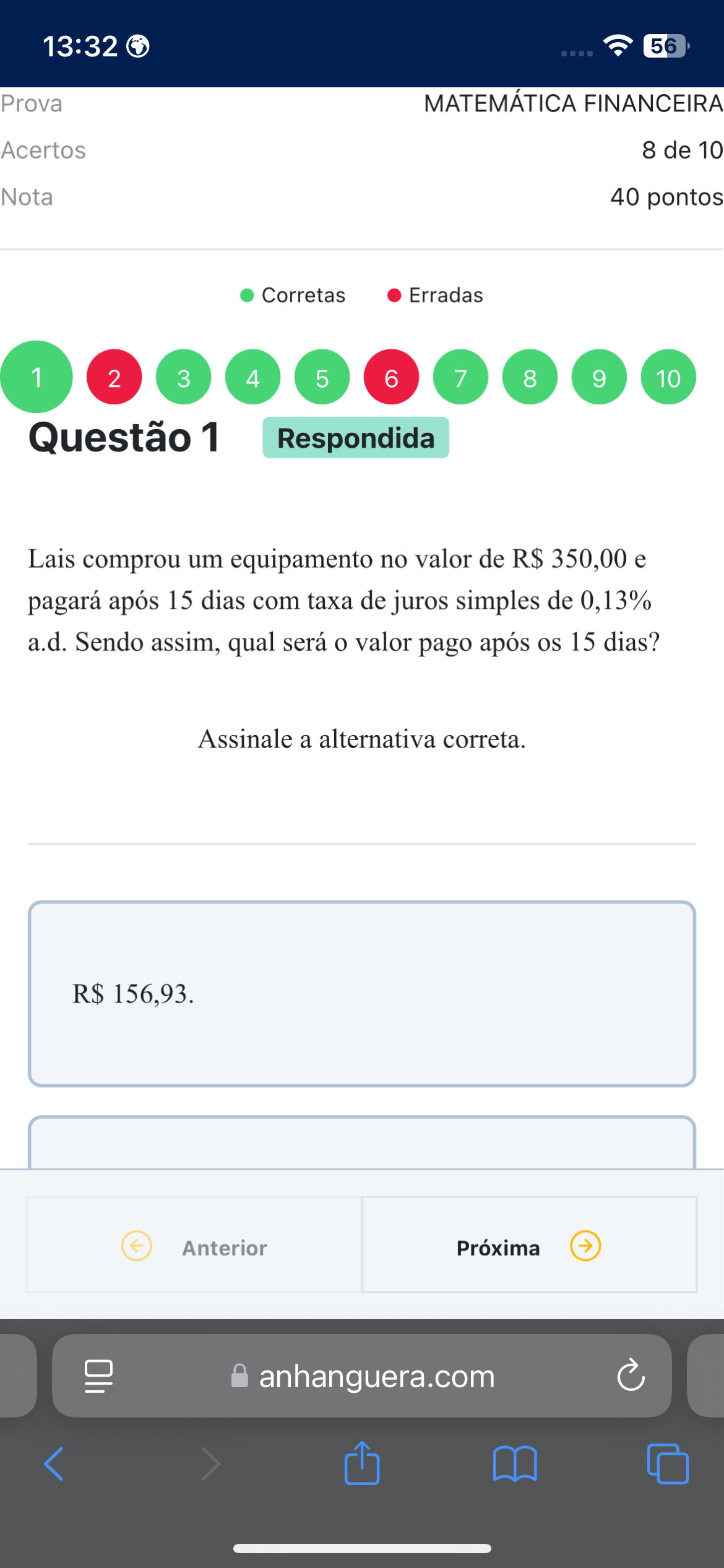 <p>13:32 56 Prova MATEMÁTICA FINANCEIRA Acertos 8 de 10 Nota 40 pontos Corretas Erradas 1 2 3 4 5 6 7 8 9 10 Questão 1 Respondida Lais comprou um equipamento no valor de R$ 350,00 e pagará após 15 dias com taxa de juros simples de 0,13% a.d. Sendo assim, qual será o valor pago após os 15 dias? Assinale a alternativa correta. R$ 156,93. Anterior Próxima anhanguera.com</p>