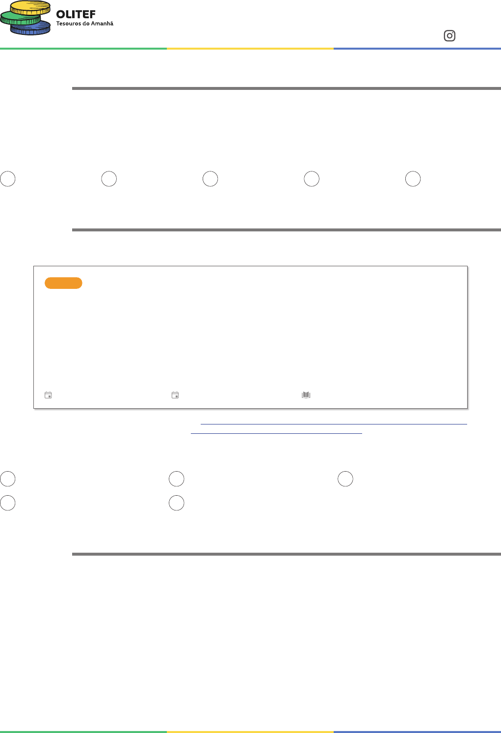 <p>PROVA 2024 – NÍVEL 1 – 6º E 7º ANOS</p><p>OLITEF | Olimpíada do Tesouro Direto de Educação Financeira – Página 1</p><p>OLITEF - Edição 2024 – PROVA NÍVEL 1 – UpMat Educacional - ©Direitos Reservados</p><p>@olitef_oficial</p><p>MA01/MT02</p><p>Questão 01</p><p>Vânia e Nilza são duas amigas que possuem R$ 10.000,00 guardados debaixo do colchão. Vânia, após</p><p>ler um livro sobre educação financeira, decidiu aplicar esse valor em um investimento no banco que</p><p>rende 10% ao ano em juros compostos. Por sua vez, Nilza preferiu deixar o dinheiro guardado debaixo</p><p>do colchão. Após 3 anos, qual será a diferença no valor de cada uma?</p><p>A R$ 3.000,00. B R$ 3.300,00. C R$ 13.000,00. D R$ 3.310,00. E R$ 13.620,00.</p><p>MA01/MT03</p><p>Questão 02</p><p>Mara estava lendo artigos na internet quando se deparou com a seguinte notícia:</p><p>NOTÍCIAS</p><p>Ata do Copom: maioria vê corte de juros em</p><p>agosto se inflação seguir em queda</p><p>Parte dos integrantes do Comitê defende cautela. Comunicado aponta que ‘flexibilizações prematuras’</p><p>podem gerar 'reacelerações do processo inflacionário'</p><p>PUBLICADO EM 27/06/2023 ÀS 12:05 ATUALIZADO EM 25/10/2023 ÀS 17:37 4 MIN DE LEITURA</p><p>Fonte: https://borainvestir.b3.com.br/noticias/maioria-do-copom-ve-corte-de-juros-</p><p>em-agosto-se-inflacao-seguir-em-queda-diz-ata/. Acesso em: agosto de 2024.</p><p>O corte de juros será feito por meio do corte em qual taxa?</p><p>A Taxa de Inflação.</p><p>B Taxa de Desemprego.</p><p>C Taxa Selic Meta.</p><p>D Taxa de Crescimento.</p><p>E Taxa do PIB.</p><p>MA01/MT04</p><p>Questão 03</p><p>"Você não pode perder essa! Só hoje você compra 3 sapatos e ganha uma linda bolsa de presente! E</p><p>o melhor, paga em 12 parcelas que cabem no seu bolso!"</p><p>Mila viu esse cartaz em frente a uma loja de sapatos e ficou pensando se deveria aproveitar a promoção.</p><p>Em sua mente, Ansiedade, Inveja e Tédio queriam que ela comprasse imediatamente! Nojinho concor-</p><p>dou, dizendo que os sapatos dela já estavam foram de moda. Alegria e Tristeza recomendaram calma,</p><p>pois os sapatos de Mila ainda estavam em bom estado e ela não precisava de três novos, muito menos</p><p>de uma bolsa. Medo logo avisou que 12 meses eram muito tempo e que algum imprevisto poderia</p><p>acontecer. Raiva já deu uma bronca, dizendo que se Mila não conseguisse pagar as parcelas em dia,</p><p>ele e Vergonha é que iriam ter que conviver com as consequências.</p><p>https://borainvestir.b3.com.br/noticias/maioria-do-copom-ve-corte-de-juros-em-agosto-se-inflacao-seguir-em-queda-diz-ata/</p><p>https://borainvestir.b3.com.br/noticias/maioria-do-copom-ve-corte-de-juros-em-agosto-se-inflacao-seguir-em-queda-diz-ata/</p><p>OLITEF - Edição 2024 – PROVA NÍVEL 1 – UpMat Educacional - ©Direitos Reservados</p><p>PROVA 2024 – NÍVEL 1 – 6º E 7º ANOS</p><p>OLITEF | Olimpíada do Tesouro Direto de Educação Financeira – Página 2</p><p>@olitef_oficial</p><p>Os vendedores sabem muito bem como estimular nossas emoções! O que você pode fazer para evitar</p><p>as compras por impulso?</p><p>I. Fazer uma lista de desejos e evitar comprar o que não estiver na lista.</p><p>II. Comparar preços em outras lojas, físicas e on-line.</p><p>III. Fazer um orçamento para saber quanto ganha e gasta e se realmente pode pagar pelos produtos</p><p>que estão em promoção.</p><p>IV. Se informar sobre a taxa de juros das parcelas e não decidir apenas pelo valor delas.</p><p>A I e II. B II e III. C I, II e IV. D I e III. E I, II, III e IV.</p><p>MA01/MT01</p><p>Questão 04</p><p>Emanuel estava com um pouco de dinheiro sobrando e decidiu emprestá-lo ao banco, recebendo um</p><p>valor em juros no processo. Após receber o dinheiro de Emanuel, o banco o emprestou para Anderson,</p><p>também recebendo um valor em juros.</p><p>Qual é o papel econômico que o banco exerce nessa situação?</p><p>A Cria uma relação de amizade entre Emanuel e Anderson.</p><p>B Os bancos organizam e facilitam a circulação do dinheiro.</p><p>C Aumenta a demanda de dinheiro.</p><p>D Diminui a oferta de dinheiro na economia.</p><p>E Investe o dinheiro em uma empresa que tem alto potencial de crescimento.</p><p>MA01/MT02</p><p>Questão 05</p><p>Yasmin aplicou R$ 1.000,00 que sempre rende R$ 100,00 a cada ano. Ao final de 6 anos, ela estava</p><p>com R$ 1.600,00. Flávia, por sua vez, fez o mesmo investimento inicial em um título prefixado de 12,3%</p><p>ao ano que dobrou de valor em seis anos, ou seja, no vencimento ela estava com R$ 2.005,75.</p><p>O título de Flávia paga juros enquanto o de Yasmin paga juros .</p><p>A Yasmin – Juros Simples e Flávia – Juros Compostos.</p><p>B Yasmin – Juros Compostos e Flávia – Juros Simples.</p><p>C Yasmin – Juros Simples e Flávia – Juros Complexos.</p><p>D Yasmin – Juros Compostos e Flávia – Juros Compostos.</p><p>E Yasmin – Juros Complexos e Flávia – Juros Simples.</p><p>PROVA 2024 – NÍVEL 1 – 6º E 7º ANOS</p><p>OLITEF | Olimpíada do Tesouro Direto de Educação Financeira – Página 3</p><p>OLITEF - Edição 2024 – PROVA NÍVEL 1 – UpMat Educacional - ©Direitos Reservados</p><p>@olitef_oficial</p><p>MA01/MT04</p><p>Questão 06</p><p>Carlinhos aprendeu que pode investir em títulos do Tesouro Direto para complementar a aposentadoria</p><p>com remuneração real e recebendo rendimentos mensalmente durante um longo período. Pensando</p><p>nisso, ele deve investir em qual título público?</p><p>A Tesouro Selic.</p><p>B Tesouro Prefixado.</p><p>C Tesouro RendA+.</p><p>D Tesouro Educa+.</p><p>E Tesouro IPCA+.</p><p>MA01/MT04</p><p>Questão 07</p><p>A família do Ali possui uma receita mensal de R$ 2.000,00 com as seguintes despesas fixas:</p><p>• Aluguel = R$ 600,00.</p><p>• Conta de luz = R$ 250,00.</p><p>• Conta de água = R$ 50,00.</p><p>E as seguintes despesas variáveis:</p><p>• Alimentação = R$ 400,
