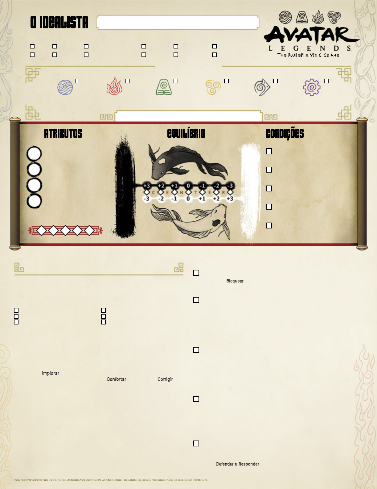 <p>M O V I M E N T O S ESCOLHA</p><p>DOIS</p><p>NUNCA DÊ AS COSTAS</p><p>Você já viu a dor e a tristeza. O sofrimento e a perda não são estranhos para você.</p><p>Mas você sabe que o mundo pode ser um lugar melhor. E nada acontece sem que</p><p>as boas pessoas lutem pelo que é certo... Você tem um código de honra.</p><p>Escolha três ideais da lista que o definem:</p><p>Quando você cumprir com algum ideal e pagar um preço significativo por isso,</p><p>alguém que testemunhou seu feito (ou ouviu falar dele) se aproxima de você para</p><p>afirmar sua lealdade ao propósito do grupo. Anote o nome dessa pessoa, e tenha-a</p><p>como uma aliada.</p><p>ALIADOS</p><p>Você sempre Implorar a esses aliados — eles sempre se importam com o que você</p><p>pensa, e estão sempre abertos para você os Confortar. Você pode os Corrigir para</p><p>que eles sigam seus princípios como se tivesse rolado 10+ se os apagar da sua lista</p><p>de aliados.</p><p>Quando você usa Bloquear, os inimigos devem marcar 2 Fadiga em vez de 1 para superar</p><p>suas defesas.</p><p>A FORÇA DO CORAÇÃO</p><p>Quando você passar um tempo conversando com os locais sobre seus problemas, role</p><p>Harmonia. Com um 7 a 9, você descobre o problema mais sério no momento - o Mestre</p><p>te diz quem ele afeta e qual é a causa. Com um 10+, você pode fazer uma pergunta</p><p>adicional sobre o problema ou causa, e ganha +1 em alguma rolagem enquanto estiver</p><p>agindo para solucioná-lo. Se falhar, você acaba criando um novo problema com seus</p><p>questionamentos.</p><p>O MEU MELHOR</p><p>Quando você estiver engajado em combate com uma oposição mais forte que você e se</p><p>recusar a se render ou fugir, role Harmonia pelo resto do combate quando usar a</p><p>abordagem Defender e Responder. Você não pode usar a técnica Recuar pelo resto do</p><p>combate.</p><p>NINGUÉM ME DERRUBA</p><p>Quando você furtar algo de alguém indigno, role Harmonia. Com um 10+, você consegue</p><p>furtar um objeto na posse do alvo sem ser percebido. Em 7 a 9, o objeto que você</p><p>apanha não é exatamente o que você esperava - o Mestre te dirá o quê. Se falhar, você</p><p>consegue furtar o que quer, mas o alvo percebe e passa a te perseguir assim que você</p><p>deixa a cena.</p><p>ISSO NÃO TE PERTENCE</p><p>Quando você desafiar um adulto dizendo que suas regras são estúpidas, role Paixão.</p><p>Com um 7 a 9, ele ficará surpreso com seu argumento, e deve mudar o equilíbrio ou te</p><p>oferecer uma alternativa que não as considere. Com um 10+, faça ambos. Se você falhar,</p><p>o alvo estará tão convicto da eficiência do sistema que você deve marcar uma Condição</p><p>enquanto ele te deixa tonto com um discurso sobre suas crenças, apenas para ir embora</p><p>depois.</p><p>SUAS REGRAS SÃO RUINS</p><p>Sempre falar a verdade.</p><p>Sempre enfrentar valentões.</p><p>Sempre manter suas promessas</p><p>Nunca atacar primeiro.</p><p>Nunca negar um pedido de ajuda.</p><p>Nunca deixar um amigo para trás.</p><p>____________________________</p><p>____________________________</p><p>____________________________</p><p>____________________________</p><p>____________________________</p><p>____________________________</p><p>____________________________</p><p>____________________________</p><p>____________________________</p><p>____________________________</p><p>____________________________</p><p>____________________________</p><p>____________________________</p><p>____________________________</p><p>____________________________</p><p>____________________________</p><p>____________________________</p><p>____________________________</p><p>____________________________</p><p>____________________________</p><p>T e le la in a e</p><p>[0]</p><p>[-1]</p><p>[+1]</p><p>[+1]</p><p>TREINAMENTO</p><p>F A D I G A</p><p>PE</p><p>R</p><p>D</p><p>Ã</p><p>O A</p><p>ÇÃ</p><p>O</p><p>Na criação do personagem, mude seu equilíbrio uma vez, se quiser Consulte o verso da ficha para mais informações sobre</p><p>como recuperar um condições</p><p>Adicione +1 a um Atributo</p><p>Assustado</p><p>-2 para In�midar e Corrigir Alguém</p><p>Zangado</p><p>-2 para Confortar Alguém e Analisar uma Situação</p><p>Tolo</p><p>-2 para Enganar e Resis�r Mudança de Equilíbrio</p><p>Culpado</p><p>-2 para Testar a Sorte e Negar Correção</p><p>Inseguro</p><p>-2 para Implorar e Confiar em suas Habilidades</p><p>CRIATIVIDADE</p><p>FOCO</p><p>HARMONIA</p><p>PAIXÃO</p><p>Dobra de Água Dobra de Fogo Dobra de Terra Dobra de Ar Armas Tecnologia</p><p>ANTECEDENTES COMPORTAMENTO</p><p>NOME:</p><p>Militar</p><p>Monge Privilegiado</p><p>Urbano</p><p>Selvagem</p><p>Criminoso Solitário</p><p>Piedoso Ferido</p><p>Sincero</p><p>Decidido</p><p>Alegre</p><p>ESTILO DE COMBATE:</p><p>SEU PERSONAGEM</p><p>T É C N I C A S D E L U T A</p><p>• Que tragédia aconteceu com você quando jovem?</p><p>• Quem você considera mais responsável por esta</p><p>tragédia? Por quê?</p><p>• Quem o ajudou em sua dor? O que eles te ensinaram?</p><p>• Que símbolo, herança ou marca você carrega para lembrá-lo</p><p>da sua perda?</p><p>• Por que você está comprometido com este grupo</p><p>ou propósito?</p><p>Reconheço um pouco da dor que _________________</p><p>sente por dentro. Vou tentar ajudá-lo.</p><p>__________________ me frustra muito quando</p><p>age sem pensar nas consequências!</p><p>O</p><p>A P D</p><p>A P D</p><p>REMOVENDO CONDIÇÕES</p><p>CONEXÕES</p><p>HISTÓRIA</p><p>DESORIENTAR</p><p>MOMENTO DE EQUILÍBRIO</p><p>CRESCIMENTO</p><p>PERGUNTAS DE CRESCIMENTO</p><p>AVANÇOS DE CRESCIMENTO</p><p>A dor do mundo pode ser esmagadora, mas o equilíbrio</p><p>traz paz. Você faz tudo a sua volta parar - vilões,</p><p>discussões, desastres - e conserta o mundo por um</p><p>momento. Narre ao Mestre como suas ações com</p><p>compaixão acabam com um conflito completa e</p><p>imediatamente.</p><p>No final de cada sessão, responda a esta pergunta 