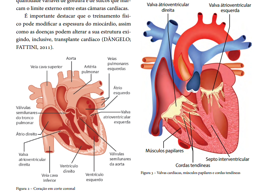 <p>de gordura e de que Valva Valva cam o limite externo entre estas câmaras cardíacas. direita esquerda É importante destacar que treinamento pode modificar a espessura do miocárdio, assim como as doenças podem alterar a sua estrutura exi- gindo, inclusive, transplante cardíaco (DÂNGELO; FATTINI, 2011). Aorta Vejas pulmonares Veia cava superior Artéria esquerdas pulmonar Átrio esquerdo Válvulas semilunares Valva do tronco atrioventricular pulmonar esquerda direito Músculos papilares Valva Válvulas atrioventricular semilunares Septo interventricular direita da aorta Cordas tendíneas direito Veia cava Figura 3 - Valvas cardíacas, papilares e cordas inferior esquerdo Figura 2 - Coração em corte coronal</p>