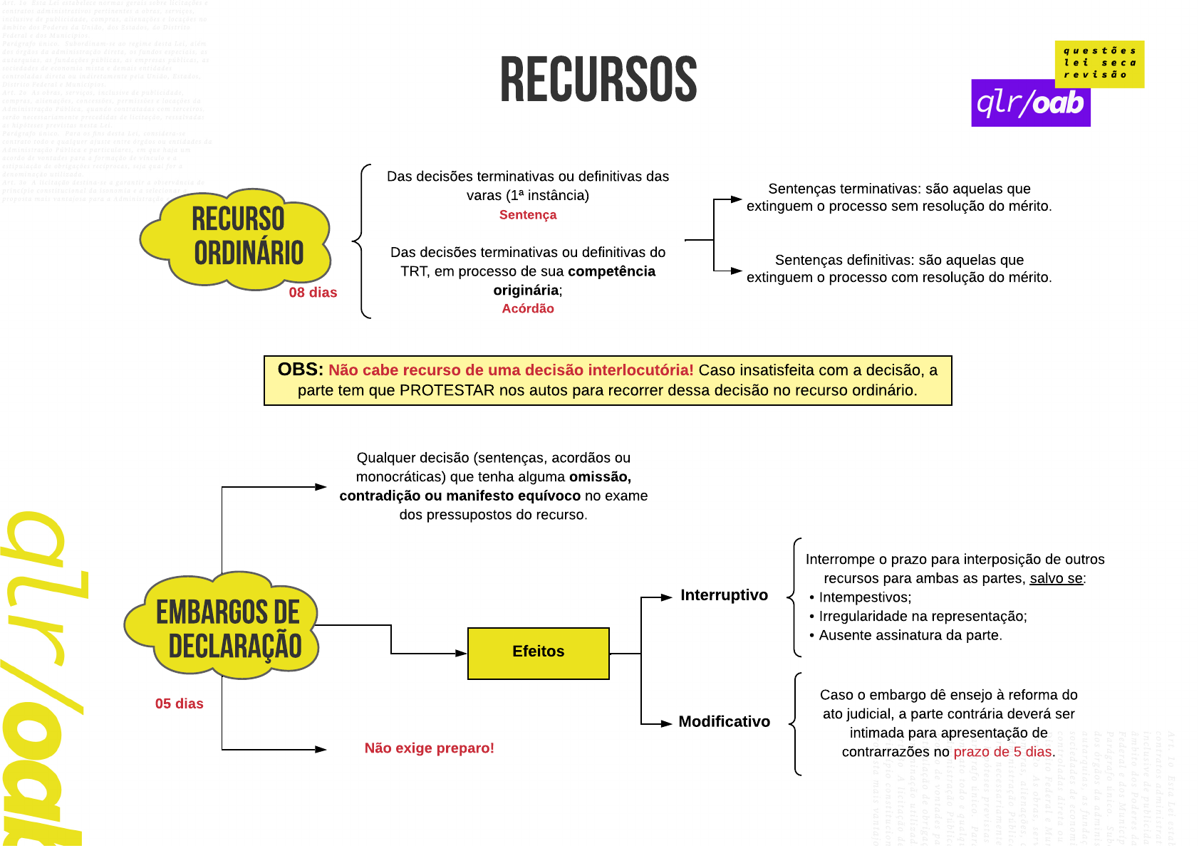 <p>RECURSO</p><p>ORDINÁRIO</p><p>EMBARGOS DE</p><p>DECLARAÇÃO</p><p>Das decisões terminativas ou definitivas das</p><p>varas (1ª instância)</p><p>Sentença</p><p>Das decisões terminativas ou definitivas do</p><p>TRT, em processo de sua competência</p><p>originária;</p><p>Acórdão</p><p>Sentenças terminativas: são aquelas que</p><p>extinguem o processo sem resolução do mérito.</p><p>Sentenças definitivas: são aquelas que</p><p>extinguem o processo com resolução do mérito.</p><p>OBS: Não cabe recurso de uma decisão interlocutória! Caso insatisfeita com a decisão, a</p><p>parte tem que PROTESTAR nos autos para recorrer dessa decisão no recurso ordinário.</p><p>Qualquer decisão (sentenças, acordãos ou</p><p>monocráticas) que tenha alguma omissão,</p><p>contradição ou manifesto equívoco no exame</p><p>dos pressupostos do recurso.</p><p>Não exige preparo!</p><p>Interrompe o prazo para interposição de outros</p><p>recursos para ambas as partes, salvo se:</p><p>- Intempestivos;</p><p>- Irregularidade na representação;</p><p>- Ausente assinatura da parte.</p><p>Efeitos</p><p>Caso o embargo dê ensejo à reforma do</p><p>ato judicial, a parte contrária deverá ser</p><p>intimada para apresentação de</p><p>contrarrazões no prazo de 5 dias.</p><p>RECURSOS</p><p>08 dias</p><p>05 dias</p><p>Interruptivo</p><p>Modificativo</p><p>Nathalia do Espírito Santo Xavier - nathxaviers4@gmail.com - CPF: 060.217.895-98</p><p>Agravo de</p><p>petição</p><p>RECURSOS</p><p>08 dias</p><p>Cabível contra decisões proferidas em</p><p>sede de execução de sentença.</p><p>Só é possível questionar algo em</p><p>sede de execução se tiver tudo</p><p>garantido com penhora ou nomeação</p><p>de bens.</p><p>Agravo DE</p><p>INSTRUMENTO</p><p>08 dias</p><p>Cabível contra despachos que negam</p><p>seguimento de recursos</p><p>Servem para destrancar o recurso, ou</p><p>seja, funciona como um "carrinho".</p><p>DICA</p><p>instruMENTO</p><p>termina com</p><p>MENTO do mesmo</p><p>jeito que</p><p>seguiMENTO</p><p>Agravo</p><p>regimental</p><p>08 dias</p><p>Combate a decisão monocrática do</p><p>relator.</p><p>Até mesmo decisão monocrática que</p><p>negar seguimento no TRT</p><p>NÃO É</p><p>EXIGIDO O</p><p>PREPARO!</p><p>As custas serão pagas apenas ao final do processo. Já o</p><p>depósito recursal somente será exigido caso a execução não</p><p>esteja devidamente garantida ou com a elevação do débito.</p><p>DICA</p><p>PetiÇÃO termina</p><p>com ÇÃO do</p><p>mesmo jeito que</p><p>execuÇÃO</p><p>Nathalia do Espírito Santo Xavier - nathxaviers4@gmail.com - CPF: 060.217.895-98</p><p>Recurso</p><p>de revista</p><p>RECURSOS</p><p>08 dias</p><p>Julgado pelo TST e visa a</p><p>uniformização da jurisprudência, contra</p><p>acordão do TRT proferido em</p><p>julgamento de recurso ordinário,</p><p>quando:</p><p>- Há violação literal de lei federal ou Constituição</p><p>Federal;</p><p>- Divergência jurisprudencial na interpretação de</p><p>lei federal;</p><p>- Contrariedade à Súmula ou OJ do TST;</p><p>- Contrariedade à Súmula vinculante;</p><p>- Acordão de outro TRT.</p><p>Pressupostos</p><p>especiais</p><p>Transcedência: repercussão no âmbito econômico, jurídico, político e social</p><p>Prequestionamento: matéria já deve ter sido alvo de debates; pode ser obtida pelos</p><p>embargos de declaração para fins de prequestionamento.</p><p>Indicação e exposição das razões</p><p>Embargos</p><p>ao TST</p><p>08 dias</p><p>Embargos</p><p>ingrigentes</p><p>Cabível contra decisões não unânimes</p><p>proferidas pela seção especializada em</p><p>dissídios coletivos de competência originária</p><p>do Tribunal.</p><p>Cabível em face das decisões que contenham</p><p>divergência jurisprudencial entre as turmas do</p><p>TST em dissídios individuais.</p><p>Embargos de</p><p>divergência</p><p>Nathalia do Espírito Santo Xavier - nathxaviers4@gmail.com - CPF: 060.217.895-98</p><p>Recurso</p><p>extraordinário</p><p>RECURSOS</p><p>15 dias</p><p>É interposto das decisões pelo TST quando:</p><p>- quando as decisões violarem, diretamente, norma</p><p>da CRFB/88</p><p>- das decisões proferidas em Recurso de Revista no</p><p>TST</p><p>- decisões prolatadas em procedimento sumário</p><p>Recurso</p><p>adesivo</p><p>08 dias</p><p>ATENÇÃO!!!</p><p>Somente será cabível no</p><p>processo do trabalho</p><p>depois de esgotados os</p><p>recursos na área</p><p>trabalhista.</p><p>Julgado pelo</p><p>STF</p><p>Pressupostos</p><p>específicos</p><p>Violação a CF, conforme art. 102, III, CF/88</p><p>Decisão de única ou ultima instância</p><p>Prequestionamento</p><p>Cabível nas seguintes hipóteses:</p><p>- RO;</p><p>- Agravo de petição;</p><p>- RR</p><p>- Embargos ao TST</p><p>OBS: Se o recorrente desistir do recurso</p><p>principal, o recurso adesivo também cairá.</p><p>É interposto pela parte que não interpôs o recurso</p><p>principal, ao ser intimada para apresentar as</p><p>contrarrazões do recurso principal apresentado pela</p><p>parte contrária.</p><p>Nathalia do Espírito Santo Xavier - nathxaviers4@gmail.com - CPF: 060.217.895-98</p><p>4M - RECURSOS EM ESPÛCIE</p><p>Página 1</p><p>Página 2</p><p>Página 3</p><p>Página 4</p>