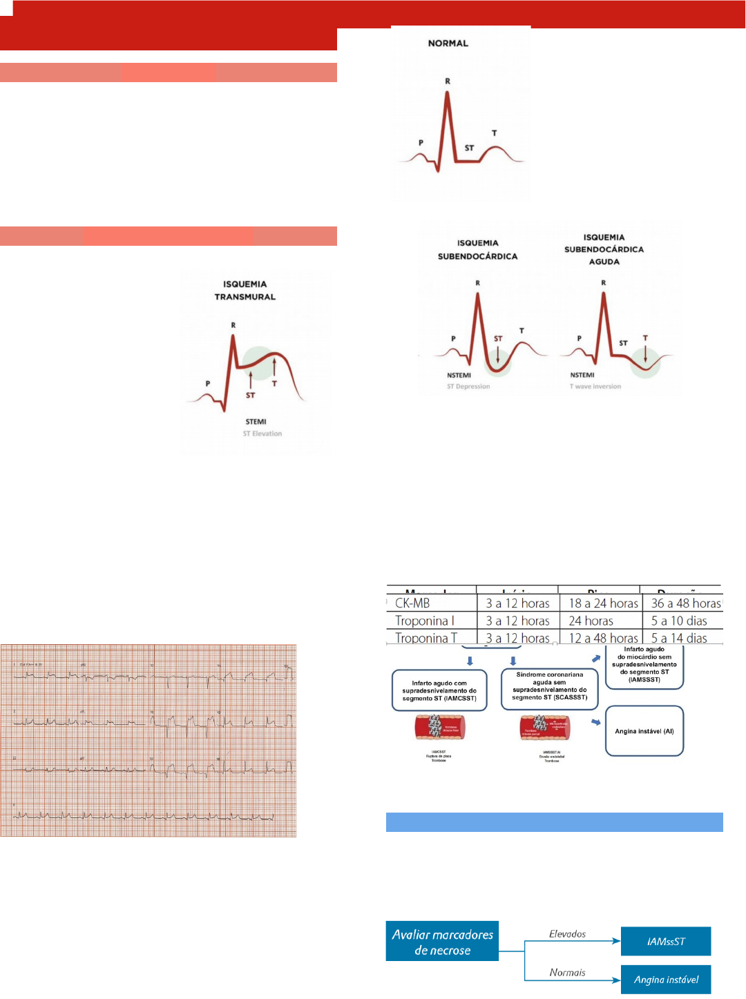 <p>CARDIOLOGIA</p><p>DOR TORÁCICA</p><p>ISQUÊMICO</p><p>Sintomas-Angina típica</p><p>· Dor retroesternal</p><p>· Piora com esforço</p><p>· Melhora com repouso</p><p>· Melhora com nitrato</p><p>Doença Coronariana</p><p>Marcadores de necrose miocárdica</p><p>· Troponina é o mais sensível</p><p>· CK-MB é alternativo a troponina</p><p>· Solicitados em todos os pacientes com suspeita de SCA e repetidos entre 6 e 12 horas</p><p>ANGINA INSTÁVEL E IAMSSST</p><p>· O DD depende da presença ou não de curva de marcadores de necrose miocardica</p><p>Curva de troponina significa elevação superior a 20%</p><p>· Diferença entre IAMCSST e IAMSSST é a existência de supra no ST pelo ECG</p><p>IAMCSST</p><p>· Taxa de mortalidade chega a quase 30% naqueles que não são tratados de acordo com as diretrizes</p><p>· Padrao-ouro: angioplastia primária</p><p>· So há em 15% dos hospitais</p><p>· reperfusão</p><p>· quanto antes a reperfusão melhor diminui necrose e melhora prognostico</p><p>· morte subita associada a instabilidade eeltrica e parada cardiaca em fibrilaçao ventricular</p><p>· Complicações:</p><p>· Choque cardiogenico</p><p>· Disfunçao mecanica</p><p>· IC</p><p>· Arritmias ventriculares complexas</p><p>Contraindicações para anti-agregantes plaquetários</p><p>Estratégia invasiva de urgência</p><p>SÍNDROME CORONARIANA AGUDA</p><p>SEM SUPRA</p><p>Definição</p><p>· Possuem uma doença base</p><p>· Placa ateromatosa que fica instável e estimula as plaquetas que fecha a luz do vaso</p><p>· Sub-oclusão é sofrida, principalmente, para o endocárdio e muito após o epicárdio</p><p>Sub-oclusão:</p><p>· endocárdio, sub-endocárdio</p><p>· Angina instável ou IAM subendocárdico</p><p>· SEM SUPRA</p><p>· Troponina + ou - : depende se teve infarto</p><p>· ECG sem supra de ST</p><p>Oclusão total:</p><p>· IAM transmural</p><p>· COM SUPRA</p><p>· Transmural</p><p>· Oclue todo o vaso</p><p>· Possui o SUPRA de ST</p><p>· isquêmico</p><p>· troponina +</p><p>Paciente de risco não manda para casa</p><p>Diagnóstico</p><p>· ECG em até 10 min tempo porta eletro</p><p>· Troponina 0; 1 e 3h</p><p>· Ultrassensível: detecta mínimas elevações de troponina pode vir alterada logo no início</p><p>· Analisa as flutuações</p><p>· Troponina convencional 0, 6 e 9 horas</p><p>· Não é necessário solicitar CKMB e mioglobina se tiver troponina</p><p>· O ECG define a nossa conduta</p><p>· A troponina é um dado que indica necrose ajuda a diferenciar a angina instável do infarto com supra ST</p><p>Elevação da troponina em 20% pelo menos</p><p>Tratamento SCA SEM SUPRA</p><p>· SCORE HEART</p><p>· H: história</p><p>· E: alterações no ECG</p><p>· A: idade</p><p>· R: fatores de risco</p><p>· T: troponina +</p><p>· Escore 48h se for tadalafila</p><p>· O2 se SpO2 140</p><p>· Angiocotonariografia em 24h (CAT)</p><p>· Alteração dinâmica de ST ou onda T exames chegam com uma melhora do que estava antes</p><p>Invasiva</p><p>aperta</p><p>· Inflamação local</p><p>· Calor local</p><p>· Sem abaulamento e retrações</p><p>· Região retroesternal</p><p>· Articulação costocondral</p><p>· DOR COM A DIGITOPRESSÃO</p><p>Tratamento</p><p>· Repouso</p><p>· Gelo no local</p><p>· AINE</p><p>ESPASMOS ESOFAGIANO DIFUSO</p><p>Definição: contrações não propulsivas fásicas do esôfago.</p><p>Sintomas</p><p>· Dor retroesternal</p><p>· Associada à deglutição ou estresse</p><p>· Dor com alimentação</p><p>· Melhora com nitrato oral</p><p>Diagnóstico</p><p>· Esofagografia baritada com padrão em “saca rolhas”</p><p>· Só mede em episódios de sintomas</p><p>· Padrão ouro: esofagomanometria</p><p>· Pode fazer provocações</p><p>Tratamento</p><p>· Nitrato ou ANTG de Ca²+</p><p>· Antidepressivos – sildenafil (viagra)</p><p>· Dilatação por balão ou Botox</p><p>· Esofagomiotomia</p><p>ANOTAÇÕES</p><p>DIAGNÓSTICO DIFERENCIAL</p><p>· TEP</p><p>· SCA</p><p>· SAA</p><p>· PNEUMOTORAX</p><p>· ESPASMOS ESOFAGIANOS</p><p>Saber a existência de uma clinica que sugere alguma alteração estrutural</p><p>CASO CLINICO 01- Dissecção aórtica</p><p>· 56 anos</p><p>· HAS</p><p>· Tabagista</p><p>· Válvula tricúspide é bicúspide</p><p>· Não usa inibidor da fosfodiesterase</p><p>· Sopro diastólico em foco aórtico</p><p>· Pressões diferentes de MSE e MSD</p><p>· Artéria mais dissecada é a coronariana direita</p><p>· ECG: V2, DIII e AVF</p><p>Sinal do Cálcio: calcifica aorta</p><p>Perigoso se o paciente usar AAS ou clopidogrel devido seu elevado risco hemorrágico em caso de ruptura ou necessidade de cirurgia</p><p>CASO CLINICO 02-estenose aórtica</p><p>· Dor típica</p><p>· Melhora ao repouso</p><p>· Retroesternal</p><p>· ACV: ritmo cardíaco regular, sopro ejetivo, sistólico, mais audível em foco aórtico com irradiação cervical, +++/+6. Pulsos periféricos com amplitude reduzida.</p><p>· Estenose aórtica</p><p>· ECG sem alteração</p><p>· Sintomas de valvulopatias</p><p>· Dispneia</p><p>· Sincope</p><p>· Dor retroesternal</p><p>· Dor isquêmica hipertrofia e hiperplasia gera a dor devido falta de perfusão</p><p>· Ergometrico: positivo para isquemia miocárdica, baixa tolerância ao esforço físico</p><p>CASO CLINICO 03-PERICARDITE</p><p>· Dor:</p><p>· Melhora quando se inclina para frente</p><p>· Irradia para o trapézio</p><p>· Piora com inspiração profunda</p><p>· Gripe mal curada</p><p>· Átrio pericárdio</p><p>· Supra desnivelamento em todas s derivações</p><p>· Tamponamento pericárdio</p><p>· Hipotensão</p><p>· Hipofonese</p><p>· Turgência jugular</p><p>Para ver a aorta faz o RX de maneira lateral obliqua anterior esquerda</p><p>EMBOLIA PULMONAR</p><p>· Tem predisposição</p><p>· Dor anginosa</p><p>· Aumento da pressão pulmonar</p><p>· VD sofre dor anginosa</p><p>· Trombo</p><p>· Fatores de risco estão presentes</p><p>CASO CLINICO 04- ANGINA INSTAVEL<