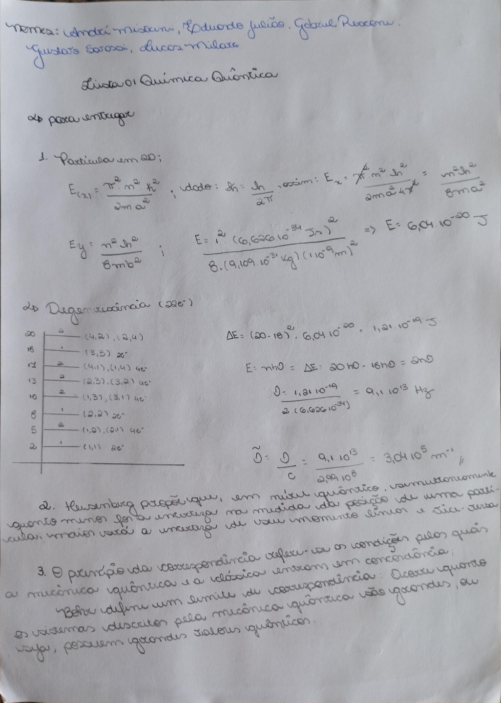 <p>Andri Lucos milare 01 Quimica para entregar 1. em 2D h Ex= 2m 2 34 E= J 2 (6,626.10 i 2D (22e-) 20 16 (3,3) 2 4e- = 13 2 D- = Hz 10 4e 8 2 5 2 I = = C 2. em dia uma parti minor for a a de medida momento linion quain 3. da a we or pelon a um limite sistemas pela</p><p>4. ende E= nine => 300 BmL2 h => mo m</p>
