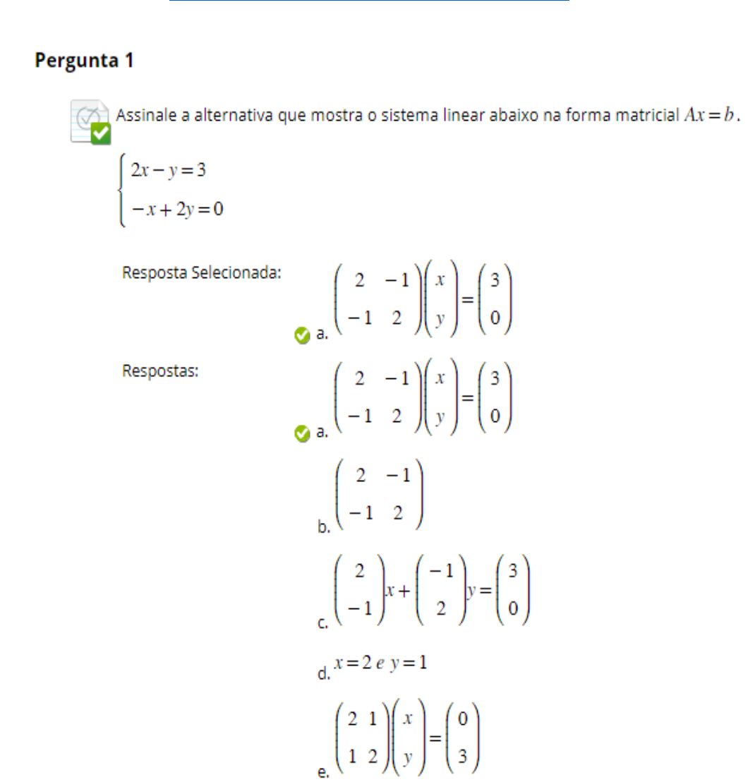 Semana 1 - Quiz da Videoaula 1 - Uma ideia geral da disciplina Comentário da resposta: Essa é a alternativa correta. Parabéns! A matriz A é chamada de “a matriz dos coeficientes”, x é “a matriz das incógnitas”, e b é “a matriz dos termos independentes”. Segunda-feira, 30 de Setembro de 2024 16h43min11s BRT https://ava.univesp.br/webapps/blackboard/content/launchAssessment.jsp?course_id=_13276_1&content_id=_1625488_1&mode=view Semana 1 - Quiz da Videoaula 2 - O que são matrizes? https://ava.univesp.br/webapps/blackboard/content/launchAssessment.jsp?course_id=_13276_1&content_id=_1625490_1&mode=view Semana 1 - Quiz da Videoaula 3 - Operações com matrizes Comentário da resposta: Essa é a alternativa correta. Muito bem, você acertou! Conforme vimos na Videoaula 3, a multiplicação da matriz A [ 3×2] pela matriz B [ 2 × 3 ] resulta em uma matriz [3×3] que é a alternativa correta. Segunda-feira, 30 de Setembro de 2024 16h55min34s BRT https://ava.univesp.br/webapps/blackboard/content/launchAssessment.jsp?course_id=_13276_1&content_id=_1625492_1&mode=view Semana 1 - Quiz Objeto Educacional Comentário da resposta: Essa é a alternativa correta. As matrizes identidades são matrizes quadradas que têm apenas o valor 1 em todos os elementos da sua diagonal principal, e zero em todos os outros elementos. Segunda-feira, 30 de Setembro de 2024 17h07min02s BRT https://ava.univesp.br/webapps/blackboard/content/launchAssessment.jsp?course_id=_13276_1&content_id=_1625494_1&mode=view Semana 1 - Atividade Avaliativa PERGUNTA 1 Matrizes são estruturas de dados usadas em diversas áreas, como ciência da computação, estatística e cálculo numérico. Elas são usadas para armazenar e manipular conjuntos de dados, geralmente de forma bidimensional. Uma matriz de ________ (lacuna 1) possui ________ (lacuna 2) e ________(lacuna 3) e contém um total de elementos. Preencha as lacunas escolhendo a alternativa correta: a. grau, variáveis, equações. b. ordem, colunas, linhas. c. grau, linhas, colunas. d. ordem, linhas, colunas. e. ordem, variáveis, equações. PERGUNTA 2 A simetria é um conceito importante em muitas áreas da matemática, da geometria à álgebra, e é usada para descrever a estrutura de objetos e padrões. A simetria também pode ser encontrada na natureza, desde o arranjo das pétalas de uma flor até a forma de um floco de neve. Uma matriz quadrada é dita simétrica se , em que é a matriz transposta de A. Sobre o que foi apresentado, analise as asserções a seguir e as relações propostas entre elas. Analisando as asserções anteriores conclui-se que: a. as asserções I e II são falsas. b. a asserção I é uma proposição verdadeira, e a II é uma proposição falsa. c. as asserções I e II são proposições verdadeiras, e a II é uma justificativa da I. d. a asserção I é uma proposição falsa, e a II é uma proposição verdadeira. e. as asserções I e II são proposições verdadeiras, mas a II não é uma justificativa da I. https://ava.univesp.br/webapps/blackboard/content/launchLink.jsp?course_id=_13276_1&content_id=_1625497_1&mode=view PERGUNTA 4 Matrizes são objetos matemáticos usados para representar e manipular dados. As operações que podem ser realizadas em matrizes incluem adição, subtração, multiplicação por um escalar e multiplicação de matrizes. Cada operação tem suas próprias regras e propriedades. Por exemplo, a adição de matrizes só é possível quando duas matrizes têm o mesmo tamanho, enquanto a multiplicação de matrizes requer duas matrizes com tamanhos compatíveis. Além disso, o resultado de uma operação entre matrizes é sempre outra matriz. Suponha que temos duas matrizes M e N, tais que: