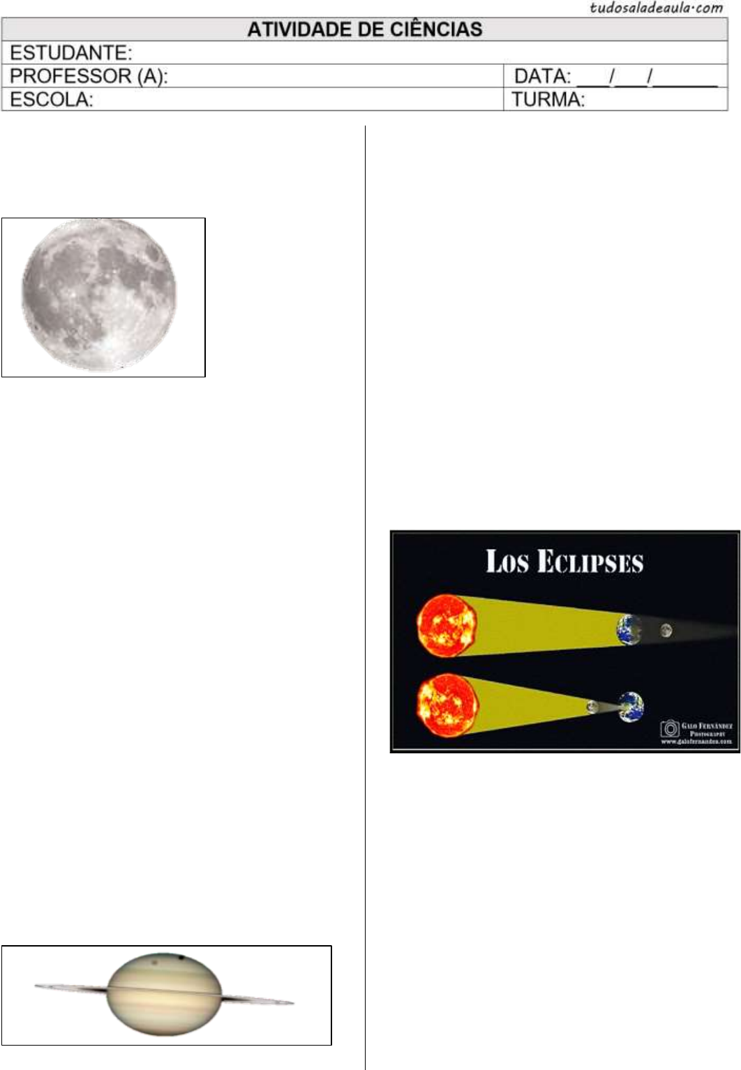 <p>1. O Instituto Nacional de Meteorologia divulgou em</p><p>seu portal as previsões para as fases da lua para o</p><p>ano de 2023. Em 30 agosto 2023, às 22:35, a lua</p><p>aparecerá no céu da seguinte forma:</p><p>Fonte: Instituto Nacional de Meteorologia</p><p>Qual a fase da lua está representada acima?</p><p>a) Cheia.</p><p>b) Nova.</p><p>c) Minguante.</p><p>d) Quarto Crescente.</p><p>2. A observação dos astros tem forte influência sobre</p><p>os povos. Não é à toa que existem diversas lendas</p><p>acerca da Lua e do Sol. Leia abaixo:</p><p>“Quando o Sol e a Lua se encontraram pela primeira</p><p>vez, se apaixonaram perdidamente e a partir daí</p><p>começaram a viver um grande amor. […] Quando</p><p>você olhar para o céu a partir de agora e ver que o</p><p>Sol encobriu a Lua é porque ele deitou-se sobre ela</p><p>e começaram a se amar”</p><p>Disponível em: https://planetariodevitoria.org</p><p>Qual o fenômeno descrito no texto?</p><p>a) Estrela Cadente.</p><p>b) Chuva de meteoros.</p><p>c) Eclipse.</p><p>d) Lua de Sangue.</p><p>3. O que define dia e noite é a presença visível do</p><p>Sol no céu. Durante os períodos noturnos vemos a</p><p>Lua. Um fato curioso é que alguns planetas do</p><p>sistema solar apresentam mais de uma lua, como é</p><p>o exemplo de Júpiter que possui 92 luas e saturno</p><p>145.</p><p>Imagem de Saturno (Fonte: Nasa)</p><p>Esses astros possuem sua órbita atrelada a um</p><p>planeta. Ou seja, enquanto os planetas orbitam em</p><p>torno de uma estrela, as luas giram em torno dos</p><p>planetas, e por isso são chamados de:</p><p>a) estrelas planetárias.</p><p>b) satélites naturais.</p><p>c) luas sem luz.</p><p>d) satélites orbitais.</p><p>4. A lua é uma gigante rocha que gira em torno da</p><p>Terra e possui seu movimento de rotação</p><p>sincronizado com o movimento de rotação terrestre.</p><p>Mas este astro não possui luz própria e reflete a luz</p><p>do/da:</p><p>a) sol.</p><p>b) terra.</p><p>c) estrelas.</p><p>d) outros planetas.</p><p>5. Numa aula de Ciências, a professora pediu que os</p><p>alunos produzissem maquetes ilustrando os eclipses</p><p>e fases da Lua. Pâmela, Lara e Isabelle ilustraram as</p><p>situações abaixo:</p><p>Disponível em https://galofernandez.com/los-eclipses/</p><p>O trio ilustrou, respectivamente:</p><p>a) eclipse Lunar e Solar.</p><p>b) eclipse Solar e Lunar.</p><p>c) apenas o eclipse solar visto de diferentes ângulos.</p><p>d) apenas o eclipse Lunar visto de diferentes</p><p>ângulos.</p><p>6. Em torno de aproximadamente um mês, a lua</p><p>passa por um ciclo de diversas fases, em que sua</p><p>aparência muda de tamanho, até ficar</p><p>completamente iluminada e depois diminui até</p><p>desaparecer. Chamamos esse ciclo de</p><p>a) tempo de iluminação.</p><p>b) ciclo lunar.</p><p>c) rotação lunar.</p><p>d) ciclo de relação lua e sol.</p><p>7. A lua realiza movimento de rotação, translação e</p><p>revolução. O movimento de revolução ocorre quando</p><p>a) a lua gira em torno do seu próprio eixo.</p><p>b) a lua gira em torno do sol.</p><p>c) a lua gira em torno de outros astros.</p><p>d) a lua gira em torno da Terra.</p><p>8. Além das quatro fases principais, a lua passa</p><p>pelas fases intermediárias, ou seja, o período de</p><p>transição. As fases intermediárias são:</p><p>a) Quarto Crescente; Crescente Gibosa; Minguante</p><p>Gibosa; Quarto Minguante.</p><p>b) Lua Crescente; Crescente Gibosa; Minguante</p><p>Gibosa; Quarto Minguante.</p><p>c) Quarto Crescente; Crescente Gibosa; Cheia</p><p>Gibosa; Quarto Minguante.</p><p>d) Quarto Crescente; Cheia Gibosa; Minguante</p><p>Gibosa; Crescente Minguante.</p><p>9. Veja as frases e complete as lacunas com as</p><p>informações correspondentes:</p><p>a) A fase da Lua ___________ é o último estágio das</p><p>fases da Lua.</p><p>b) A lua demora __________ para completar seu</p><p>ciclo em torno da Terra e de si mesmo.</p><p>c) Chamamos de ___________ o movimento que a</p><p>Lua realiza em torno do Sol.</p><p>d) Durante a Lunação, ocorrem as _________ fases</p><p>da Lua.</p><p>e) A Lua __________ é denominada assim quando o</p><p>satélite é integralmente iluminado.</p><p>f) A Lua __________ acontece quando apenas uma</p><p>parte intermediária recebe iluminação.</p><p>g) Na fase ___________, a Lua não é visível no céu</p><p>à noite.</p><p>10. Leia a tirinha abaixo.</p><p>O assunto abordado é:</p><p>a) a depressão da Lua.</p><p>b) a alegria da Lua.</p><p>c) as fases da Lua.</p><p>d) a explosão de luz.</p><p>11. Veja a imagem e nomeie as fases da Lua</p>