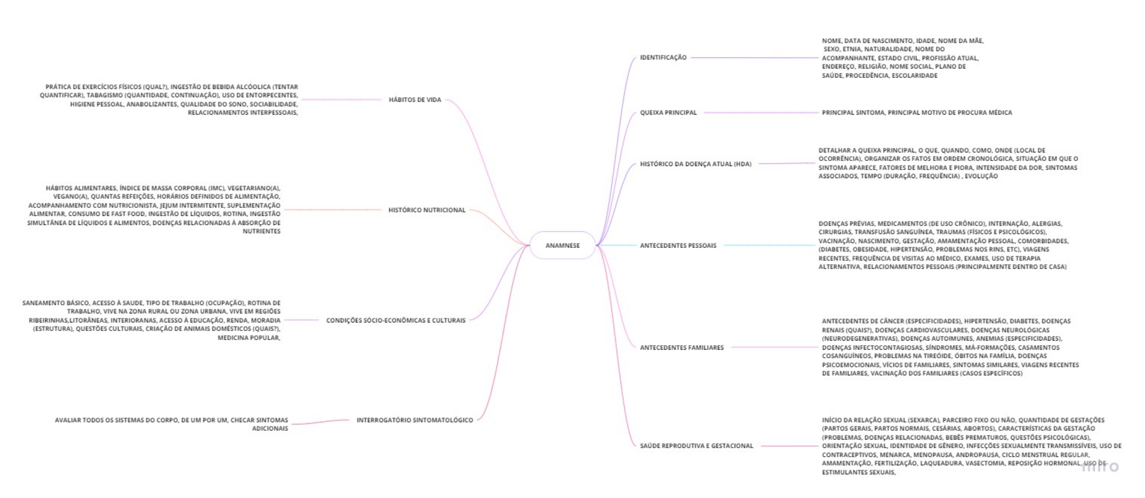 <p>NOME. DATA DE NOME DA ETNIA. NATURALIDADE, NOME DO IDENTIFICAÇÃO ESTADO CIVIL, PROFISSÃO NOME SOCIAL. PLANO DE ESCOLARIDADE PRÁTICA DE EXERCÍCIOS FÍSICOS INGESTÃO DE BEBIDA (TENTAR QUANTIFICAR), TABAGISMO (QUANTIDADE, DE ENTORPECENTES HÁBITOS DE VIDA HIGIENE QUALIDADE DO SONO, RELACIONAMENTOS QUEIXA PRINCIPAL PRINCIPAL SINTOMA, PRINCIPAL MOTIVO DE PROCURA MÉDICA DETALHAR A QUEIXA o QUE, QUANDO, COMO. ONDE (LOCAL DE ORGANIZAR os FATOS EM ORDEM SITUAÇÃO EM QUE o HISTÓRICO DA DOENÇA ATUAL (HDA) SINTOMA FATORES DE MELHORA INTENSIDADE DA SINTOMAS TEMPO (DURAÇÃO, EVOLUÇÃO HÁBITOS ALIMENTARES, ÍNDICE DE MASSA CORPORAL (IMC), VEGANO(A), QUANTAS HORÁRIOS DEFINIDOS DE ACOMPANHAMENTO COM JEJUM SUPLEMENTAÇÃO HISTÓRICO NUTRICIONAL ALIMENTAR CONSUMO DE FAST INGESTÃO DE INGESTÃO DE LÍQUIDOS DOENÇAS RELACIONADAS A ABSORÇÃO DE DOENÇAS MEDICAMENTOS (DE uso NUTRIENTES TRANSFUSÃO TRAUMAS (FÍSICOS E AMAMENTAÇÃO ANAMNESE ANTECEDENTES PESSOAIS (DIABETES, PROBLEMAS NOS ETC), VIAGENS DE VISITAS AO uso DE TERAPIA ALTERNATIVA RELACIONAMENTOS PESSOAIS (PRINCIPALMENTE DENTRO DE CASA) SANEAMENTO BÁSICO. ACESSO TIPO DE TRABALHO ROTINA DE VIVE NA ZONA RURAL ou ZONA VIVE EM REGIÕES ACESSO A MORADIA CONDIÇÕES E CULTURAIS DE CÂNCER (ESPECIFICIDADES), DOENÇAS (ESTRUTURA), QUESTÕES CRIAÇÃO DE ANIMAIS RENAIS DOENÇAS DOENÇAS MEDICINA DOENÇAS AUTOIMUNES, ANEMIAS ANTECEDENTES FAMILIARES DOENÇAS INFECTOCONTAGIOSAS CASAMENTOS PROBLEMAS NA ÓBITOS NA DOENÇAS PSICOEMOCIONAIS DE SINTOMAS VIAGENS RECENTES DE VACINAÇÃO DOS FAMILIARES (CASOS ESPECÍFICOS) AVALIAR TODOS os SISTEMAS DO CORPO. DE UM POR UM. CHECAR SINTOMAS INTERROGATÓRIO INÍCIO DA RELAÇÃO SEXUAL PARCEIRO FIXO ou NÃO. QUANTIDADE DE GESTAÇÕES ADICIONAIS (PARTOS PARTOS CARACTERÍSTICAS DA GESTAÇÃO DOENÇAS QUESTÕES SAÚDE REPRODUTIVA GESTACIONAL ORIENTAÇÃO SEXUAL. IDENTIDADE DE SEXUALMENTE uso DE MENARCA CICLO MENSTRUAL AMAMENTAÇÃO, REPOSIÇÃO HORMONAL uso DE ESTIMULANTES SEXUAIS.</p>