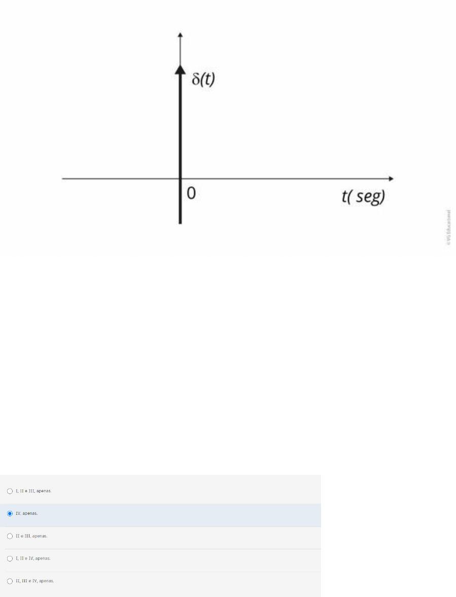 <p>A convolução é uma espécie de filtro. Nesse sentido, dependendo da função do sistema em que é realizada a</p><p>convolução, é possível filtrar os ruídos indesejados da função original. Considerando o conteúdo apresentado,</p><p>analise a figura a seguir:</p><p>Figura - Representação do sinal utilizado para realizar a convolução</p><p>Fonte: Elaborada pelo autor.</p><p>#PraCegoVer: a figura retrata um gráfico que contém uma seta que aponta para cima e parte da origem do</p><p>gráfico. No eixo vertical, está indicada a função delta de Dirac e, no eixo horizontal, está indicado o tempo t.</p><p>De acordo com a análise da figura apresentada, leia as afirmativas expostas a seguir:</p><p>I. O sinal mostrado diz respeito a um sinal degrau.</p><p>II. O sinal mostrado diz respeito a um sinal em rampa simétrica.</p><p>III. O sinal mostrado diz respeito a um sinal em rampa assimétrica.</p><p>IV. O sinal mostrado diz respeito a um sinal impulso.</p><p>Está correto o que se afirma em:</p><p>As operações aritméticas básicas entre sinais, como soma, subtração, multiplicação, diferenciação e</p><p>integração, devem ser realizadas com base nos valores das funções em instantes específicos. Isso é válido</p><p>tanto para os sinais de tempo contínuo quanto de tempo discreto.</p><p>Dados dois sinais: X1[n] = {-3, -2, -1, 0, -1, -2, -3} e X2[n] = {1, 3, 0, -1, -2, 0, -1}, determine o sinal de soma</p><p>entre os dois sinais e assinale a alternativa correta.</p><p>Um sinal pode ser decomposto em termos de funções senos e cossenos pela série de Fourier. Para que a</p><p>série de Fourier, na forma trigonométrica, seja capaz de convergir, esse sinal precisa satisfazer a alguns</p><p>critérios, conhecidos como critérios de Dirichlet, sendo critérios suficientes para a possibilidade da</p><p>decomposição desse sinal.</p><p>Dentre os critérios de Dirichlet, analise as afirmativas a seguir e assinale V para a(s) Verdadeira(s) e F para</p><p>a(s) Falsa(s).</p><p>I. ( ) A função periódica deve ser capaz de expressar um valor único, avaliando-se qualquer ponto.</p><p>II. ( ) A função periódica possuirá uma dada quantidade de descontinuidades, independentemente do período</p><p>que possua.</p><p>III. ( ) A função periódica tem um dado número de máximos e mínimos associados, também</p><p>independentemente do período.</p><p>IV. ( ) Para qualquer tempo inicial t0, não há nenhuma relação válida.</p><p>Assinale a alternativa que apresenta a sequência correta.</p><p>Um circuito equivalente é um modelo simplificado de um circuito que tem por objetivo simplificar a análise de</p><p>um circuito original.Quando temos um circuito de duas portas com fontes independentes e que sejam lineares,</p><p>podemos dizer que dois circuitos em cascata são equivalentes. Quando isso acontece, ocorre um fenômeno na</p><p>admitância do circuito.</p><p>Com base no apresentado, analise as asserções a seguir e a relação proposta entre elas.</p><p>I. As admitâncias de transferência são iguais, ou seja, as portas são recíprocas (Y12 = Y21).</p><p>Pois:</p><p>II. Caso haja a troca dos pontos de excitação, as impedâncias de transferência mantêm o mesmo valor.</p><p>A seguir, assinale a alternativa correta.</p><p>A série de Fourier é uma série na forma trigonométrica utilizada para representar processos físicos complexos</p><p>através de funções simples de senos e cossenos. Quando aplicamos as séries de Fourier em circuitos</p><p>elétricos, utilizamos alguns passos para conseguir aplicar efetivamente a simplificação por série de Fourier.</p><p>Com relação a esses passos, analise as afirmativas a seguir.</p><p>I. Expressar a excitação do circuito elétrico através de uma série de Fourier.</p><p>II. Transformar o circuito elétrico antes no domínio do tempo para o da frequência.</p><p>III. Determinar a(s) resposta(s) das componentes em corrente contínua e em corrente alternada, parte da série</p><p>de Fourier.</p><p>IV. Dividir as respostas da componente alternada pela componente contínua utilizando o princípio de</p><p>superposição.</p><p>É correto o que se afirma em:</p><p>Os quadripolos são utilizados em sistemas de transmissão e distribuição de energia elétrica por conseguirem</p><p>avaliar o comportamento das redes elétricas como um único sistema, devido à identificação de parâmetros,</p><p>como entradas e saídas em curto-circuito ou em circuitos abertos.</p><p>Considerando a aplicação de uma matriz admitância quadrada com quatro elementos, analise as afirmativas a</p><p>seguir.</p><p>I. O termo Y11 representa a admitância de entrada com a saída curto-circuitada.</p><p>II. O termo Y12 representa a transadmitância de curto-circuito.</p><p>III. O termo Y21 representa a admitância de saída de circuito aberto.</p><p>IV. O termo Y22 representa a admitância de saída de curto-circuito.</p><p>É correto o que se afirma em:</p><p>Durante o processamento de sinais, uma das operações mais importantes é a convolução. A convolução tem</p><p>diversas propriedades que podem ser utilizadas para a simplificação dos cálculos e são válidas para o tempo</p><p>contínuo e para o tempo discreto. Observe a propriedade da convolução</p><p>seguinte: .</p><p>Assinale a alternativa que apresenta corretamente o nome da propriedade utilizada na simplificação dos</p><p>cálculos de uma convolução.</p><p>Diante das propriedades da convolução, uma convolução entre duas funções no tempo é equivalente à</p><p>multiplicação dessas funções na frequência, depois de ser realizada a transformada de Laplace</p><p>individualmente. Em outras palavras, ou, de maneira</p><p>inversa, .</p><p>Com base nas transformações de Laplace, obtenha a convolução dos sinais f(t) e g(t).</p><p>f(t) = 1</p><p>g(t) = 3</p><p>Assinale a alternativa que apresenta a convolução entre f(t) e g(t).</p><p>O processamento de sinais