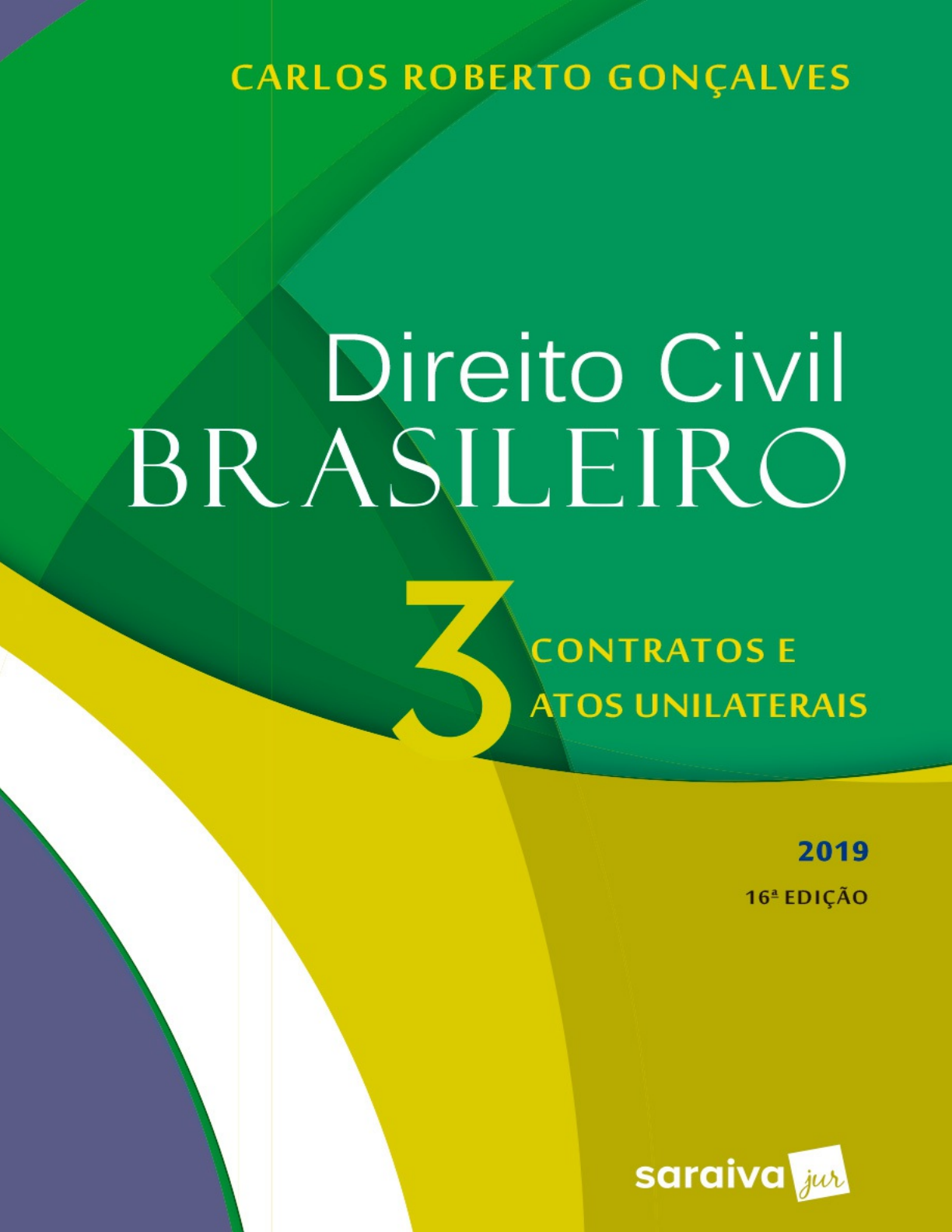 <p>vinev</p><p>Nota</p><p>Unmarked definida por vinev</p><p>ISBN 9788553605811</p><p>Gonçalves, Carlos Roberto</p><p>Direito civil brasileiro, volume 3 : contratos e atos unilaterais / Carlos Roberto Gonçalves. – 16.</p><p>ed. – São Paulo : Saraiva Educação, 2019.</p><p>1. Contratos - Brasil 2. Direito civil - Brasil I. Título.</p><p>18-1073</p><p>CDU 347(81)</p><p>Índices para catálogo sistemático:</p><p>1. Brasil : Direito civil 347(81)</p><p>2. Direito civil brasileiro 347(81)</p><p>Diretoria executiva Flávia Alves Bravin</p><p>Diretora editorial Renata Pascual Müller</p><p>Gerência editorial Roberto Navarro</p><p>Consultoria acadêmica Murilo Angeli Dias dos Santos</p><p>Edição Eveline Gonçalves Denardi (coord.) | Aline Darcy Flôr de Souza</p><p>Produção editorial Ana Cristina Garcia (coord.) | Carolina Massanhi | Luciana Cordeiro</p><p>Shirakawa | Rosana Peroni Fazolari</p><p>Arte e digital Mônica Landi (coord.) | Claudirene de Moura Santos Silva | Guilherme H. M.</p><p>Salvador | Tiago Dela Rosa | Verônica Pivisan Reis</p><p>Planejamento e processos Clarissa Boraschi Maria (coord.) | Juliana Bojczuk Fermino | Kelli</p><p>Priscila Pinto | Marília Cordeiro | Fernando Penteado | Mônica Gonçalves Dias | Tatiana dos</p><p>Santos Romão</p><p>Novos projetos Fernando Alves</p><p>Diagramação (Livro Físico) Claudirene de Moura Santos Silva</p><p>Revisão Cecília Devus | Denise Pisaneschi | Ivani Aparecida Martins Cazarim | Ivone Rufino</p><p>Calabria | Willians Calazans de V. de Melo</p><p>Capa IDÉE arte e comunicação</p><p>Livro digital (E-pub)</p><p>Produção do e-pub Guilherme Henrique Martins Salvador</p><p>Data de fechamento da edição: 5-11-2018</p><p>Dúvidas?</p><p>Acesse www.editorasaraiva.com.br/direito</p><p>Nenhuma parte desta publicação poderá ser reproduzida por qualquer meio ou forma sem a prévia</p><p>autorização da Editora Saraiva.</p><p>A violação dos direitos autorais é crime estabelecido na Lei n. 9.610/98 e punido pelo artigo 184 do</p><p>Código Penal.</p><p>http://www.editorasaraiva.com.br/direito</p><p>SUMÁRIO</p><p>Primeira Parte - DOS CONTRATOS</p><p>Título I - TEORIA GERAL DOS CONTRATOS</p><p>Capítulo I - NOÇÃO GERAL</p><p>1. Conceito</p><p>2. Evolução histórica</p><p>3. Função social do contrato</p><p>4. Contrato no Código de Defesa do Consumidor</p><p>5. Condições de validade do contrato</p><p>5.1. Requisitos subjetivos</p><p>5.2. Requisitos objetivos</p><p>5.3. Requisitos formais</p><p>6. Princípios fundamentais do direito contratual</p><p>6.1. Princípio da autonomia da vontade</p><p>6.2. Princípio da supremacia da ordem pública</p><p>6.3. Princípio do consensualismo</p><p>6.4. Princípio da relatividade dos efeitos do contrato</p><p>6.5. Princípio da obrigatoriedade dos contratos</p><p>6.6. Princípio da revisão dos contratos ou da onerosidade excessiva</p><p>6.7. Princípio da boa-fé e da probidade</p><p>6.7.1. Boa-fé subjetiva e boa-fé objetiva</p><p>6.7.2. Disciplina no Código Civil de 2002</p><p>6.7.3. Proibição de “venire contra factum proprium”</p><p>6.7.4. “Suppressio, surrectio” e “tu quoque”</p><p>6.7.5. “Duty to mitigate the loss” e “Nachfrist”</p><p>7. Interpretação dos contratos</p><p>7.1. Conceito e extensão</p><p>7.2. Princípios básicos</p><p>7.3. Regras esparsas</p><p>7.4. Interpretação dos contratos no Código de Defesa do Consumidor</p><p>7.5. Critérios práticos para interpretação dos contratos</p><p>7.6. Interpretação dos contratos de adesão</p><p>8. Pactos sucessórios</p><p>Capítulo II - DA FORMAÇÃO DOS CONTRATOS</p><p>1. A manifestação da vontade</p><p>2. Negociações preliminares</p><p>3. A proposta</p><p>3.1. Conceito e características</p><p>3.2. A oferta no Código Civil</p><p>3.2.1. A força vinculante da oferta</p><p>3.2.2. Proposta não obrigatória</p><p>3.3. A oferta no Código de Defesa do Consumidor</p><p>4. A aceitação</p><p>4.1. Conceito e espécies</p><p>4.2. Hipóteses de inexistência de força vinculante da aceitação</p><p>5. Momento da conclusão do contrato</p><p>5.1. Contratos entre presentes</p><p>5.2. Contratos entre ausentes</p><p>6. Lugar da celebração</p><p>7. Formação dos contratos pela Internet</p><p>Capítulo III - CLASSIFICAÇÃO DOS CONTRATOS</p><p>1. Introdução</p><p>2. Contratos unilaterais, bilaterais e plurilaterais</p><p>3. Contratos gratuitos ou benéficos e onerosos</p><p>4. Contratos comutativos e aleatórios</p><p>4.1. Contratos aleatórios por natureza</p><p>4.2. Contratos acidentalmente aleatórios</p><p>5. Contratos paritários e de adesão. Contrato-tipo</p><p>6. Contratos de execução instantânea, diferida e de trato sucessivo</p><p>7. Contratos personalíssimos e impessoais</p><p>8. Contratos individuais e coletivos</p><p>9. Contratos principais e acessórios. Contratos derivados</p><p>10. Contratos solenes e não solenes</p><p>11. Contratos consensuais e reais</p><p>12. Contratos preliminares e definitivos</p><p>13. Contratos nominados e inominados, típicos e atípicos, mistos e coligados.</p><p>União de contratos</p><p>Capítulo IV - DA ESTIPULAÇÃO EM FAVOR DE TERCEIRO</p><p>1. Conceito</p><p>2. Escorço histórico</p><p>3. Natureza jurídica da estipulação em favor de terceiro</p><p>4. A regulamentação da estipulação de terceiro no Código Civil</p><p>Capítulo V - DA PROMESSA DE FATO DE TERCEIRO</p><p>1. Introdução</p><p>2. Promessa de fato de terceiro</p><p>3. Inovações introduzidas pelo Código Civil de 2002</p><p>Capítulo VI - DOS VÍCIOS REDIBITÓRIOS</p><p>1. Disciplina no Código Civil</p><p>1.1. Conceito</p><p>1.2. Fundamento jurídico</p><p>1.3. Requisitos para a caracterização dos vícios redibitórios</p><p>1.4. Efeitos. Ações cabíveis</p><p>1.4.1. Espécies de ações</p><p>1.4.2. Prazos decadenciais</p><p>1.4.3. Hipóteses de descabimento das ações edilícias</p><p>1.4.3.1. Coisas vendidas conjuntamente</p><p>1.4.3.2. Inadimplemento cont