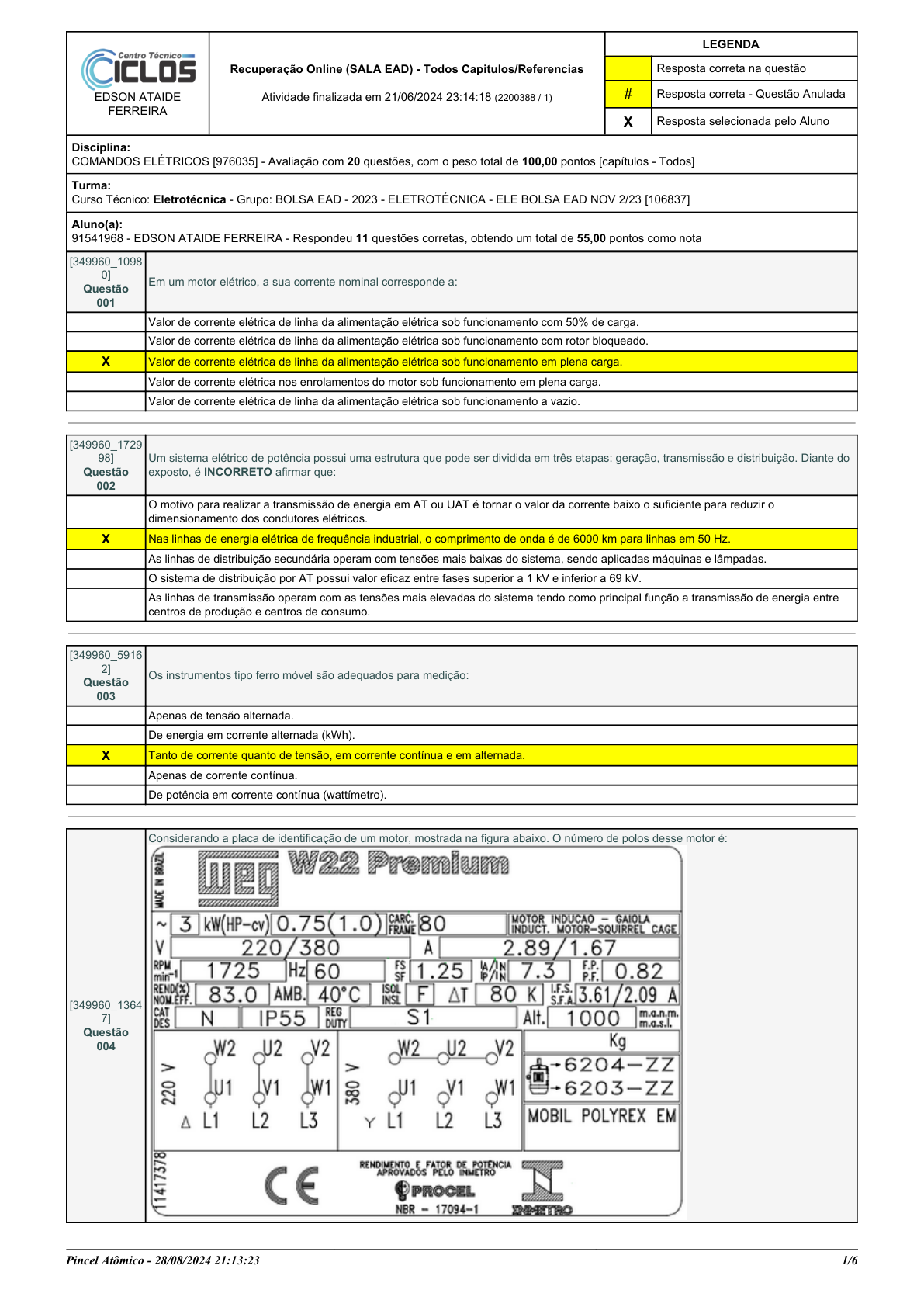<p>Pincel Atômico - 28/08/2024 21:13:23 1/6</p><p>EDSON ATAIDE</p><p>FERREIRA</p><p>Recuperação Online (SALA EAD) - Todos Capitulos/Referencias</p><p>Atividade finalizada em 21/06/2024 23:14:18 (2200388 / 1)</p><p>LEGENDA</p><p>Resposta correta na questão</p><p># Resposta correta - Questão Anulada</p><p>X Resposta selecionada pelo Aluno</p><p>Disciplina:</p><p>COMANDOS ELÉTRICOS [976035] - Avaliação com 20 questões, com o peso total de 100,00 pontos [capítulos - Todos]</p><p>Turma:</p><p>Curso Técnico: Eletrotécnica - Grupo: BOLSA EAD - 2023 - ELETROTÉCNICA - ELE BOLSA EAD NOV 2/23 [106837]</p><p>Aluno(a):</p><p>91541968 - EDSON ATAIDE FERREIRA - Respondeu 11 questões corretas, obtendo um total de 55,00 pontos como nota</p><p>[349960_1098</p><p>0]</p><p>Questão</p><p>001</p><p>Em um motor elétrico, a sua corrente nominal corresponde a:</p><p>Valor de corrente elétrica de linha da alimentação elétrica sob funcionamento com 50% de carga.</p><p>Valor de corrente elétrica de linha da alimentação elétrica sob funcionamento com rotor bloqueado.</p><p>X Valor de corrente elétrica de linha da alimentação elétrica sob funcionamento em plena carga.</p><p>Valor de corrente elétrica nos enrolamentos do motor sob funcionamento em plena carga.</p><p>Valor de corrente elétrica de linha da alimentação elétrica sob funcionamento a vazio.</p><p>[349960_1729</p><p>98]</p><p>Questão</p><p>002</p><p>Um sistema elétrico de potência possui uma estrutura que pode ser dividida em três etapas: geração, transmissão e distribuição. Diante do</p><p>exposto, é INCORRETO afirmar que:</p><p>O motivo para realizar a transmissão de energia em AT ou UAT é tornar o valor da corrente baixo o suficiente para reduzir o</p><p>dimensionamento dos condutores elétricos.</p><p>X Nas linhas de energia elétrica de frequência industrial, o comprimento de onda é de 6000 km para linhas em 50 Hz.</p><p>As linhas de distribuição secundária operam com tensões mais baixas do sistema, sendo aplicadas máquinas e lâmpadas.</p><p>O sistema de distribuição por AT possui valor eficaz entre fases superior a 1 kV e inferior a 69 kV.</p><p>As linhas de transmissão operam com as tensões mais elevadas do sistema tendo como principal função a transmissão de energia entre</p><p>centros de produção e centros de consumo.</p><p>[349960_5916</p><p>2]</p><p>Questão</p><p>003</p><p>Os instrumentos tipo ferro móvel são adequados para medição:</p><p>Apenas de tensão alternada.</p><p>De energia em corrente alternada (kWh).</p><p>X Tanto de corrente quanto de tensão, em corrente contínua e em alternada.</p><p>Apenas de corrente contínua.</p><p>De potência em corrente contínua (wattímetro).</p><p>[349960_1364</p><p>7]</p><p>Questão</p><p>004</p><p>Considerando a placa de identificação de um motor, mostrada na figura abaixo. O número de polos desse motor é:</p><p>Pincel Atômico - 28/08/2024 21:13:23 2/6</p><p>X 4</p><p>10</p><p>8</p><p>2</p><p>6</p><p>[349960_1097</p><p>9]</p><p>Questão</p><p>005</p><p>Dentre os tipos de motores elétricos de indução trifásicos, temos o MIG. Assinale a alternativa correta sobre ele:</p><p>Não é possível realizar controle de torque.</p><p>Possui rotor do tipo gaiola.</p><p>Não é possível realizar controle de torque.</p><p>X Podemos realizar o controle de torque e velocidade alterando a resistência do rotor por meio da inserção de resistência elétrica em série.</p><p>Possui acesso aos terminais do rotor.</p><p>[349960_1365</p><p>1]</p><p>Questão</p><p>006</p><p>Considerando a placa de identificação de um motor, mostrada na figura abaixo. Caso esse motor seja ligado a uma rede elétrica trifásica</p><p>de tensão 380V, a ligação do motor e a corrente nominal será de:</p><p>Em estrela, e sua corrente nominal será de 1,67 A.</p><p>Em triangulo, e sua corrente nominal será de 7,3 A.</p><p>Em estrela, e sua corrente nominal será de 2,89 A.</p><p>X Em triangulo, e sua corrente nominal será de 2,89 A.</p><p>Em triangulo, e sua corrente nominal será de 1,67 A.</p><p>Pincel Atômico - 28/08/2024 21:13:23 3/6</p><p>[349960_1364</p><p>6]</p><p>Questão</p><p>007</p><p>Considerando a placa de identificação de um motor, mostrada na figura abaixo. A potência desse motor em CV é:</p><p>0,83</p><p>0,80</p><p>X 0,82</p><p>1,00</p><p>0,75</p><p>[349960_7814</p><p>]</p><p>Questão</p><p>008</p><p>O desenho abaixo ilustra a aplicação de uma chave fim de curso. Que função é essa?</p><p>Nada do que foi considerado esta verdadeiro</p><p>X Verificar se a escotilha estará aberta ou fechada</p><p>Verificar se as correias ligadas aos motores estão funcionando</p><p>Verificar se o relé esta funcionando bem</p><p>Verificar se o contator esta operando normalmente</p><p>Pincel Atômico - 28/08/2024 21:13:23 4/6</p><p>[349960_1652</p><p>22]</p><p>Questão</p><p>009</p><p>A Figura abaixo apresenta um esquema de acionamento de um motor trifásico:</p><p>Em relação ao exibido nesse esquema, considere as afirmativas abaixo:</p><p>I - A botoeira NA desliga o motor.</p><p>II - A chave S mantém o motor energizado.</p><p>III - A botoeira NF liga o motor.</p><p>Está correto o que se apresenta APENAS na(s) afirmativa(s)</p><p>X II e III</p><p>II</p><p>I e II</p><p>III</p><p>I</p><p>[349960_5916</p><p>0]</p><p>Questão</p><p>010</p><p>Considerando que este wattímetro abaixo indique 800 W, o valor real da potência pode variar entre:</p><p>720 e 880 W.</p><p>799,5 e 800,5 W.</p><p>796 e 804 W.</p><p>794 e 806 W.</p><p>X 760 e 840 W.</p><p>[349961_1652</p><p>04]</p><p>Questão</p><p>011</p><p>Motores elétricos podem ser classificados em dois grandes grupos: corrente contínua (C.C) e corrente alternada (C.A.). Ambos os grupos</p><p>podem ser acionados utilizando dispositivos elétricos / eletrônicos. Em relação aos diversos tipos de motores elétricos e formas de</p><p>acionamentos, assinale a alternativa CORRETA.</p><p>Em um motor de indução sí