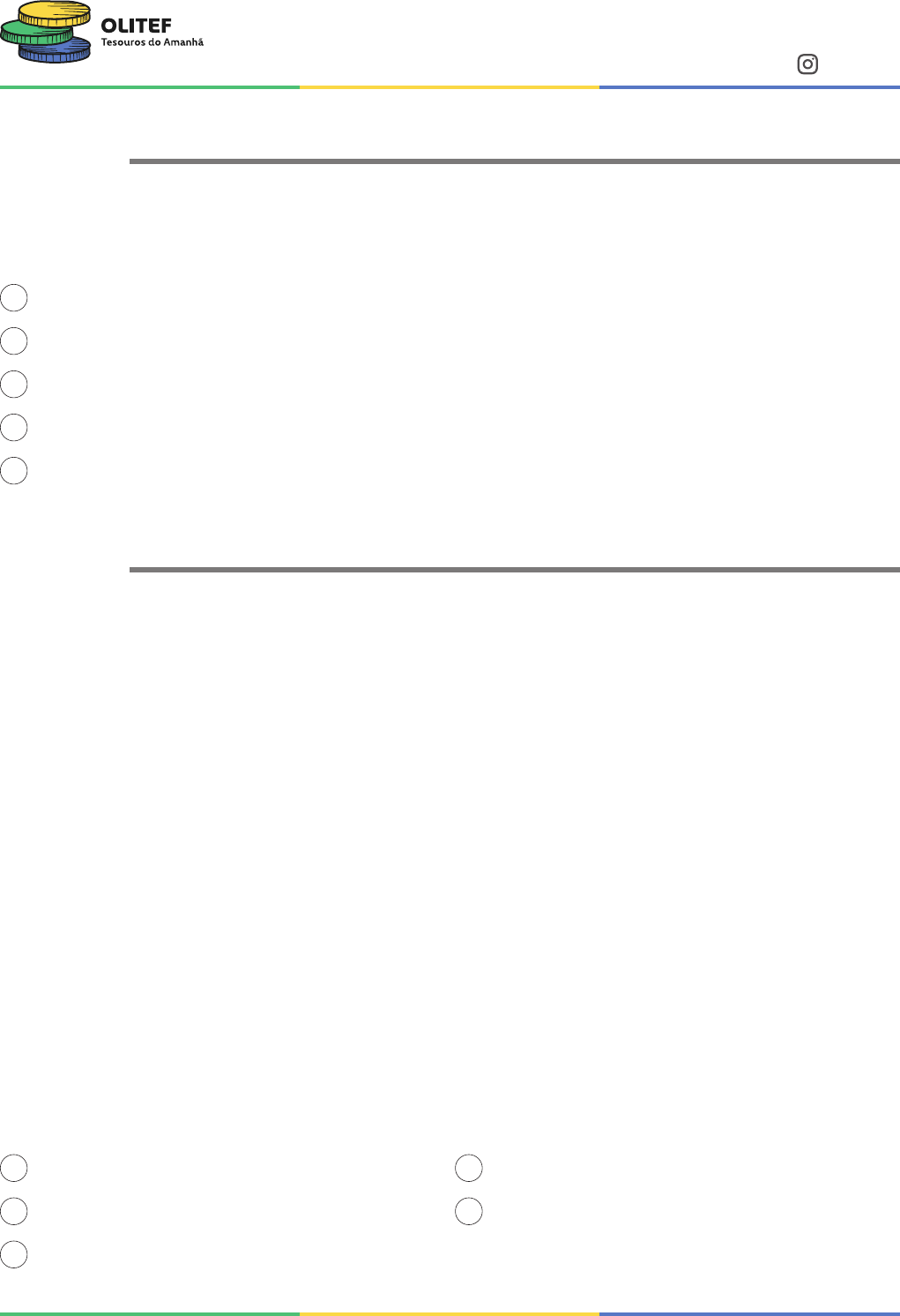 <p>PROVA 2024 – NÍVEL 3 – 1º ANO DO ENSINO MÉDIO</p><p>OLITEF | Olimpíada do Tesouro Direto de Educação Financeira – Página 1</p><p>OLITEF - Edição 2024 – PROVA NÍVEL 3 – UpMat Educacional - ©Direitos Reservados</p><p>@olitef_oficial</p><p>MA01/MT04</p><p>Questão 01</p><p>Raimundo está encontrando dificuldades para manter o orçamento equilibrado, principalmente por</p><p>falta de compreensão de suas despesas mensais. O que Raimundo NÃO deve fazer para entender e</p><p>controlar melhor seus gastos?</p><p>A Ignorar suas despesas e esperar que elas se resolvam sozinhas.</p><p>B Usar um aplicativo de rastreamento de gastos.</p><p>C Criar uma planilha para o controle de seus gastos pessoais.</p><p>D Ler um livro sobre como controlar seus gastos de forma mais eficiente.</p><p>E Estudar para uma olimpíada que vai ajudá-lo a entender melhor sobre educação financeira.</p><p>MA01/MT04</p><p>Questão 02</p><p>"Você não pode perder essa! Só hoje você compra 3 sapatos e ganha uma linda bolsa de presente! E</p><p>o melhor, paga em 12 parcelas que cabem no seu bolso!"</p><p>Mila viu esse cartaz em frente a uma loja de sapatos e ficou pensando se deveria aproveitar a promoção.</p><p>Em sua mente, Ansiedade, Inveja e Tédio queriam que ela comprasse imediatamente!</p><p>Nojinho concordou, dizendo que os sapatos dela já estavam foram de moda. Alegria e Tristeza reco-</p><p>mendaram calma, pois os sapatos de Mila ainda estavam em bom estado e ela não precisava de três</p><p>novos, muito menos de uma bolsa. Medo logo avisou que 12 meses eram muito tempo e que algum</p><p>imprevisto poderia acontecer. Raiva já deu uma bronca, dizendo que se Mila não conseguisse pagar</p><p>as parcelas em dia, ele e Vergonha é que iriam ter que conviver com as consequências.</p><p>Os vendedores sabem muito bem como estimular nossas emoções! O que você pode fazer para evitar</p><p>as compras por impulso?</p><p>I. Fazer uma lista de desejos e evitar comprar o que não estiver na lista.</p><p>II. Comparar preços em outras lojas, físicas e on-line.</p><p>III. Fazer um orçamento para saber quanto ganha e gasta e se realmente pode pagar pelos produtos</p><p>que estão em promoção.</p><p>IV. Se informar sobre a taxa de juros das parcelas e não decidir apenas pelo valor delas.</p><p>A I e II.</p><p>B II e III.</p><p>C I, II, III e IV.</p><p>D I, II e IV.</p><p>E I e III.</p><p>OLITEF - Edição 2024 – PROVA NÍVEL 3 – UpMat Educacional - ©Direitos Reservados</p><p>PROVA 2024 – NÍVEL 3 – 1º ANO DO ENSINO MÉDIO</p><p>OLITEF | Olimpíada do Tesouro Direto de Educação Financeira – Página 2</p><p>@olitef_oficial</p><p>MA01/MT01</p><p>Questão 03</p><p>são empresas responsáveis por disponibilizar aos seus clientes, oferecendo opções</p><p>de investimento em renda fixa e .</p><p>Assinale a alternativa correta que preenche os espaços em branco.</p><p>A seguradoras, ativos financeiros, variável.</p><p>B corretoras de valores, seguros, variável.</p><p>C bancos, criptomoedas, composta.</p><p>D corretoras de valores, ativos financeiros, variável.</p><p>E bolsas de valores, títulos de capitalização, volátil.</p><p>MA01/MT02</p><p>Questão 04</p><p>Yasmin aplicou R$ 1.000,00 que sempre rende R$ 100,00 a cada ano. Ao final de 6 anos, ela estava</p><p>com R$ 1.600,00. Flávia, por sua vez, fez o mesmo investimento inicial em um título prefixado de 12,3%</p><p>ao ano que dobrou de valor em seis anos, ou seja, no vencimento ela estava com R$ 2.005,75.</p><p>O título de Flávia paga juros enquanto o de Yasmin paga juros .</p><p>A Yasmin – Juros Compostos e Flávia – Juros Simples.</p><p>B Yasmin – Juros Simples e Flávia – Juros Compostos.</p><p>C Yasmin – Juros Simples e Flávia – Juros Complexos.</p><p>D Yasmin – Juros Compostos e Flávia – Juros Compostos.</p><p>E Yasmin – Juros Complexos e Flávia – Juros Simples.</p><p>MA01/MT04</p><p>Questão 05</p><p>Carlinhos aprendeu que pode investir em títulos do Tesouro Direto para complementar a aposentadoria</p><p>com remuneração real e recebendo rendimentos mensalmente durante um longo período. Pensando</p><p>nisso, ele deve investir em qual título público?</p><p>A Tesouro Selic.</p><p>B Tesouro Prefixado.</p><p>C Tesouro RendA+.</p><p>D Tesouro IPCA+.</p><p>E Tesouro Educa+.</p><p>PROVA 2024 – NÍVEL 3 – 1º ANO DO ENSINO MÉDIO</p><p>OLITEF | Olimpíada do Tesouro Direto de Educação Financeira – Página 3</p><p>OLITEF - Edição 2024 – PROVA NÍVEL 3 – UpMat Educacional - ©Direitos Reservados</p><p>@olitef_oficial</p><p>MA01/MT04</p><p>Questão 06</p><p>No início do ano, Otávio fez um planejamento de quais eram seus principais objetivos financeiros</p><p>para o ano. Ele planeja comprar um fone de R$ 150,00 no final de fevereiro, uma panela elétrica de</p><p>R$ 400,00 no final de junho e uma viagem de R$ 1.200,00 no final de dezembro. Considerando que</p><p>ele irá economizar em todos os meses do ano, que o valor será igual nos meses até cada aquisição</p><p>e que o valor será destinado unicamente para o próximo objetivo, quanto ele terá que poupar a mais</p><p>em dezembro do que em relação a janeiro?</p><p>A R$ 135,00. B R$ 145,00. C R$ 155,00. D R$ 165,00. E R$ 125,00.</p><p>MA01/MT02</p><p>Questão 07</p><p>Inácio estava devendo R$ 500,00 no cartão de crédito no final do mês de janeiro. Ele pagou R$ 100,00</p><p>e deixou o resto do valor para ser pago no final do mês de março, crescendo com juros compostos</p><p>de 20% ao mês.</p><p>Considerando que receberá um salário de R$ 2.000,00 em março, que ele não acumulou novas dívidas</p><p>nesse período, e que as despesas desse mês representam 75% do salário, Inácio conseguirá pagar a</p><p>sua dívida no fim de março?</p><p>A Não, faltarão R$ 76,00.</p><p>B Sim, sobrarão R$ 16,00.</p><p>C Não, faltarão R$ 60,00.</p><p>D Sim, sobrarão R$ 60,00.</p><p>E Não, faltarão R$ 80,00.</p><p>MA01/MT03</p><p>