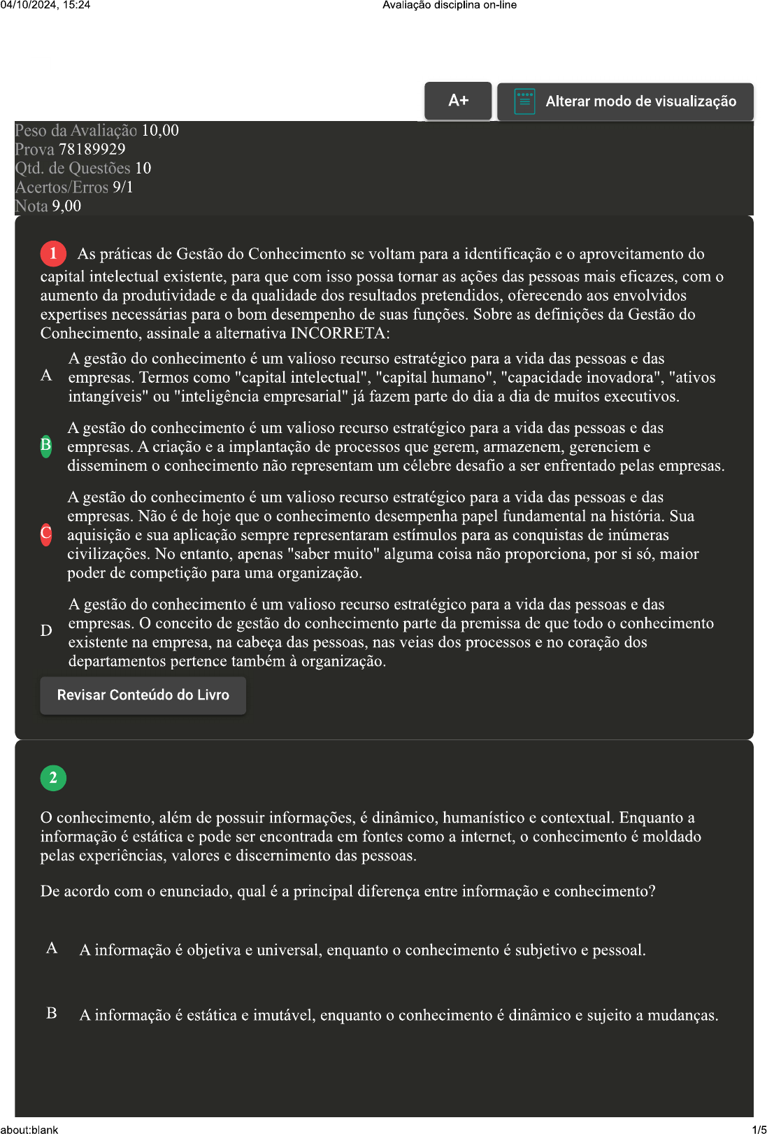 <p>04/10/2024, 15:24 Avaliação disciplina on-line A+ Alterar modo de visualização Peso da Avaliação 10,00 Prova 78189929 Qtd. de Questões 10 Acertos/Erros 9/1 Nota 9,00 1 As práticas de Gestão do Conhecimento se voltam para a identificação e aproveitamento do capital intelectual existente, para que com isso possa tornar as ações das pessoas mais eficazes, com aumento da produtividade e da qualidade dos resultados pretendidos, oferecendo aos envolvidos expertises necessárias para bom desempenho de suas funções. Sobre as definições da Gestão do Conhecimento, assinale a alternativa INCORRETA: A gestão do conhecimento é um valioso recurso estratégico para a vida das pessoas e das A empresas. Termos como "capital intelectual", "capital "capacidade inovadora". "ativos intangíveis" ou "inteligência empresarial" já fazem parte do dia a dia de muitos executivos. A gestão do conhecimento é um valioso recurso estratégico para a vida das pessoas e das B empresas. A criação e a implantação de processos que gerem, armazenem, gerenciem e disseminem conhecimento não representam um célebre desafio a ser enfrentado pelas empresas. A gestão do conhecimento é um valioso recurso estratégico para a vida das pessoas e das empresas. Não é de hoje que conhecimento desempenha papel fundamental na história. Sua aquisição e sua aplicação sempre representaram estímulos para as conquistas de inúmeras civilizações. No entanto, apenas "saber muito" alguma coisa não proporciona, por si só, maior poder de competição para uma organização. A gestão do conhecimento é um valioso recurso estratégico para a vida das pessoas e das D empresas. O conceito de gestão do conhecimento parte da premissa de que todo conhecimento existente na empresa, na cabeça das pessoas, nas veias dos processos e no coração dos departamentos pertence também à organização. Revisar Conteúdo do Livro 2 O conhecimento, além de possuir informações, é dinâmico, humanístico e contextual. Enquanto a informação é estática e pode ser encontrada em fontes como a internet, conhecimento é moldado pelas experiências, valores e discernimento das De acordo com enunciado, qual é a principal diferença entre informação e conhecimento? A A informação é objetiva e universal, enquanto conhecimento é subjetivo e pessoal. B A informação é estática e imutável, enquanto conhecimento é dinâmico e sujeito a mudanças. about:blank 1/5</p><p>15:24 Avaliação disciplina on-line O conhecimento é formado pela interação entre experiências, valores e contexto, enquanto a informação é apenas um conjunto de dados. D O conhecimento depende exclusivamente da internet, enquanto a informação pode ser adquirida de várias fontes. 3 A Gestão do Conhecimento é um fenômeno do fim do século XX e começo do século XXI e sempre existiu de forma intuitiva nas organizações, mas só agora tomou importância devido ao fator competitividade e à globalização. Sobre as definições da Gestão do Conhecimento, assinale a alternativa INCORRETA: A Os conceitos de dados, informação e conhecimento, no campo da Ciência da Computação, coincidem apenas em parte com os demais campos relacionados à Gestão do Conhecimento. Segundo os gurus da área de Gestão de Conhecimento, Nonaka e Takeuchi, os conhecimentos nas B organizações devem ser gerenciados de forma articulada e cíclica, denominada de Espiral do A Gestão do Conhecimento tem uma história relativamente curta, embora suas origens remontem C aos primórdios da Ciência da Computação, da Administração, bem como da Ciência da Informação. D A gestão do conhecimento é núcleo de organização de ativos tangíveis que interfere positivamente desempenho das pessoas. 4 Atualmente, as empresas precisam se adequar aos avanços tecnológicos. Nossa sociedade está atenta aos avanços tecnológicos e isso implica que as empresas devem se manter informadas e acessar tais tecnologias, a fim de conquistar os clientes. Desse modo, segundo Servin (2005), essas tecnologias podem apoiar a Gestão do Conhecimento em dois pontos principais: primeiro, fornecer meios para que as pessoas possam organizar, armazenar e acessar informações e conhecimento explícito, como em bibliotecas; segundo, conectar as pessoas para que elas possam compartilhar conhecimento. Sobre as ferramentas tecnológicas utilizadas para conectar pessoas com pessoas, assinale a alternativa CORRETA: FONTE: SERVIN, Géraud. ABC of Knowledge Management. 2005. Disponível em: em: 29 jun. 2016. A Repositórios de dados, videoconferência, portais e groupware. B Portais, repositório de dados e intranets. C Wiki, ferramentas de fluxo, portais e motores de pesquisa. D Groupware, intranets, e-mail, fóruns, videoconferência, ferramentas e-learning e ferramentas de trabalho virtual. about:blank 2/5</p><p>04/10/2024, 15:24 Avaliação disciplina on-line 5 Diante da era da informação e do conhecimento, ampliar a participação dos colaboradores nas capacitações tem sido um dos principais objetivos das organizações, a fim de contribuir com seu aprimoramento profissional. O Ensino a Distância (EaD) é um recurso tecnológico de grande utilização em treinamentos e na prática da gestão do conhecimento entre diferentes comunidades virtuais de aprendizagem, suprindo as deficiências diárias dos funcionários. Sobre ensino a distância, assinale a alternativa CORRETA: É um sistema capaz de proporcionar integração e comunicação entre especialistas, executivos e A demais usuários de uma intranet que permite organizar, compartilhar e disponibilizar as informações de interesse em um único local. B São sistemas que se adaptam de acordo com perfil de cada usuário (professores, tutores e alunos) através de diversos estilos cognitivos de aprendizagem durante processo de ensino. É um instrumento de articulação composto por professores, tutores e alunos em comunidades virtuai